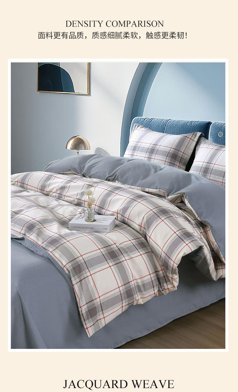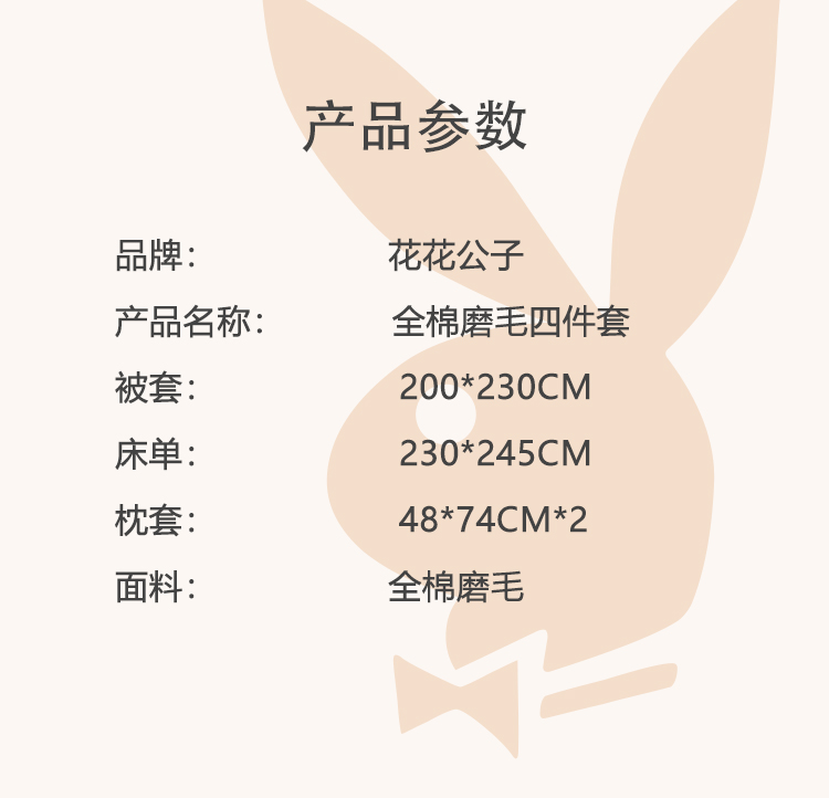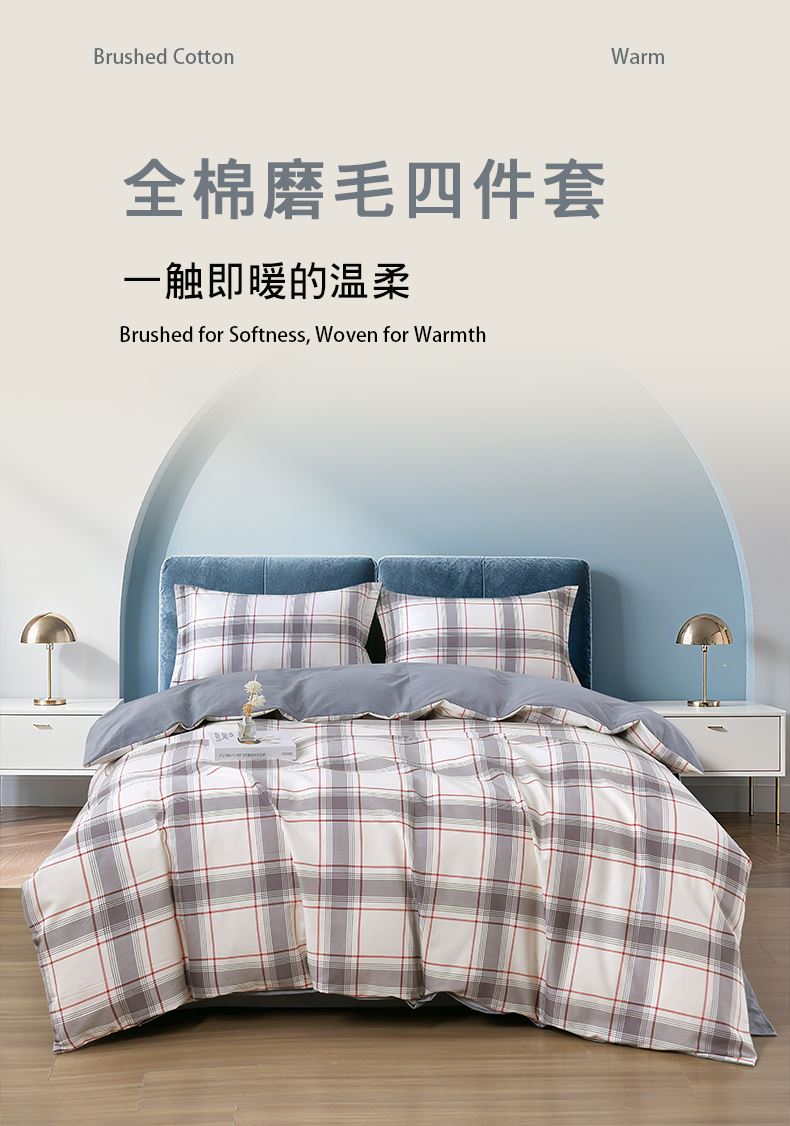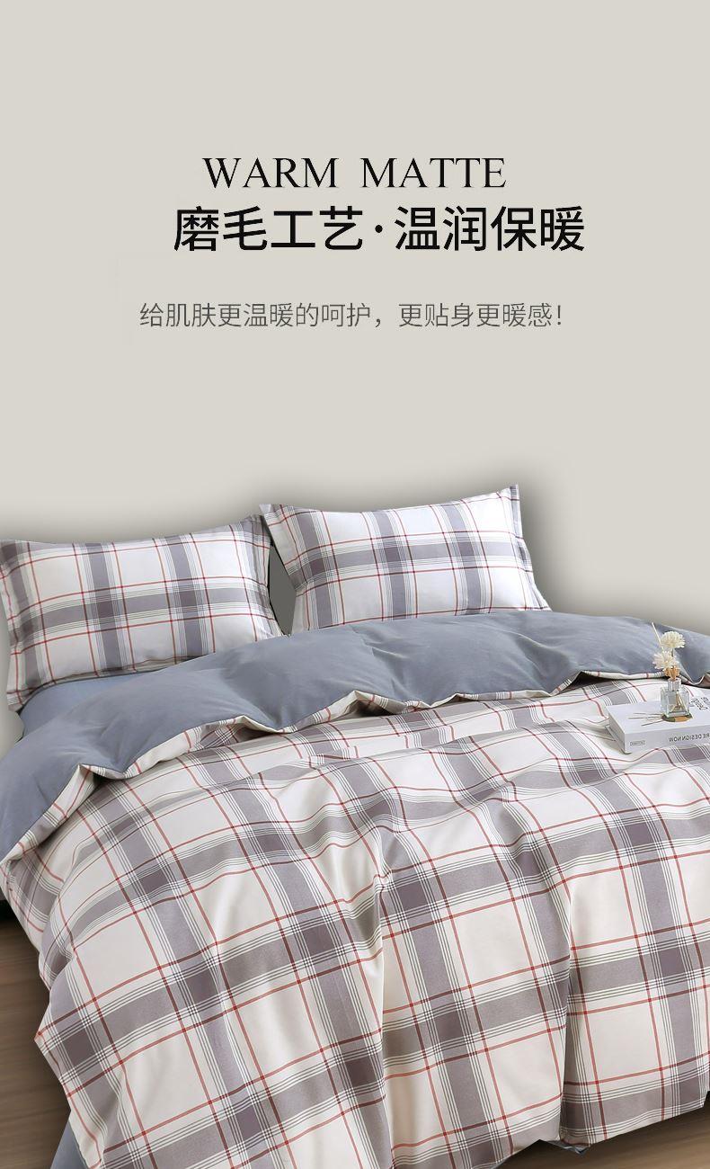 被套:200*230cm 床单:230*245cm 枕套:48*74cm*2 面料:全棉磨毛 执行标准:GB/T22796-2021 安全类别:GB18401-2010 B类 1.严选全棉磨毛面料制作,手感柔软,舒适质感丰厚,而且有厚重感,不褪色,不缩水,容易打理;2.面料采用活性印染工艺,层次感非常强。布面洁净平整,质地细致,粒纹饱满,光泽莹润柔和.