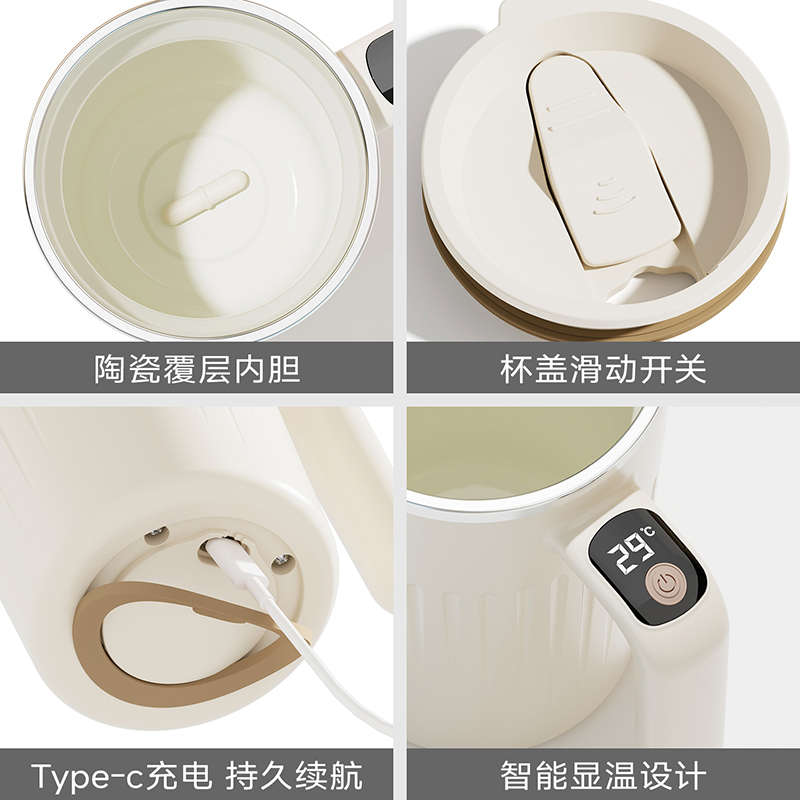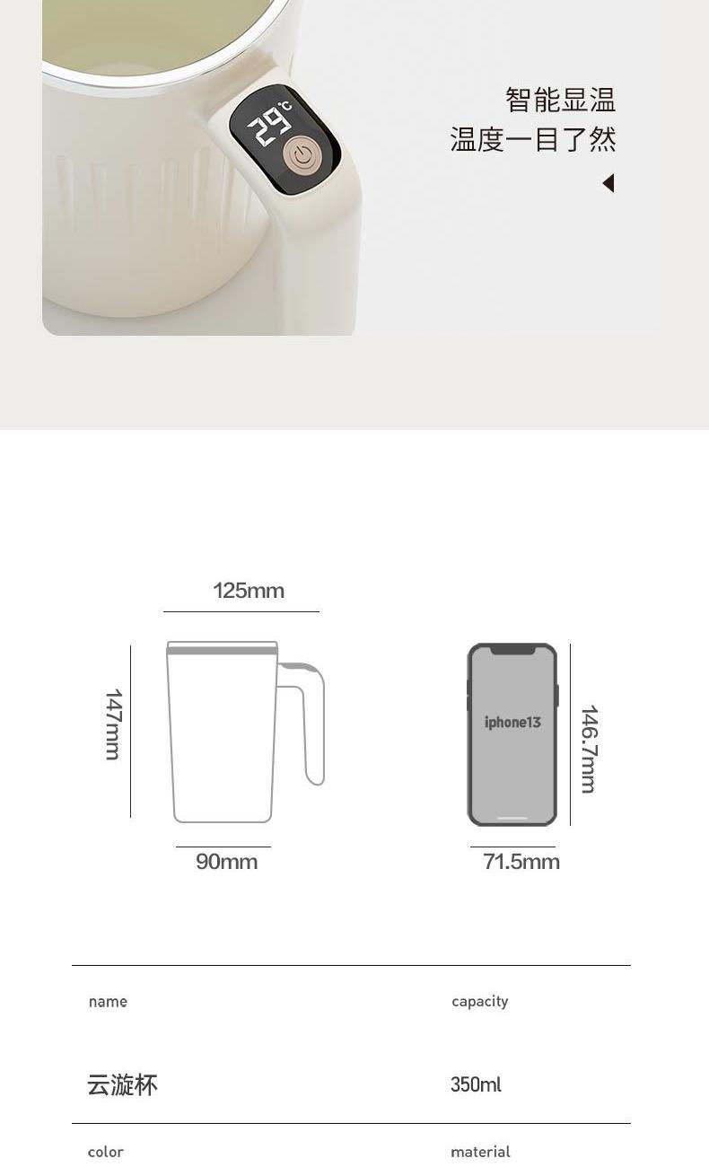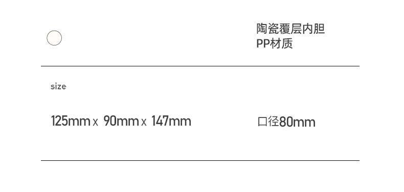 容量:350ml |净重:273g口径:80mm材质:304不锈钢(内胆)ABS(外壳)AS(杯盖)产品尺寸:125mm*90mm*147mm