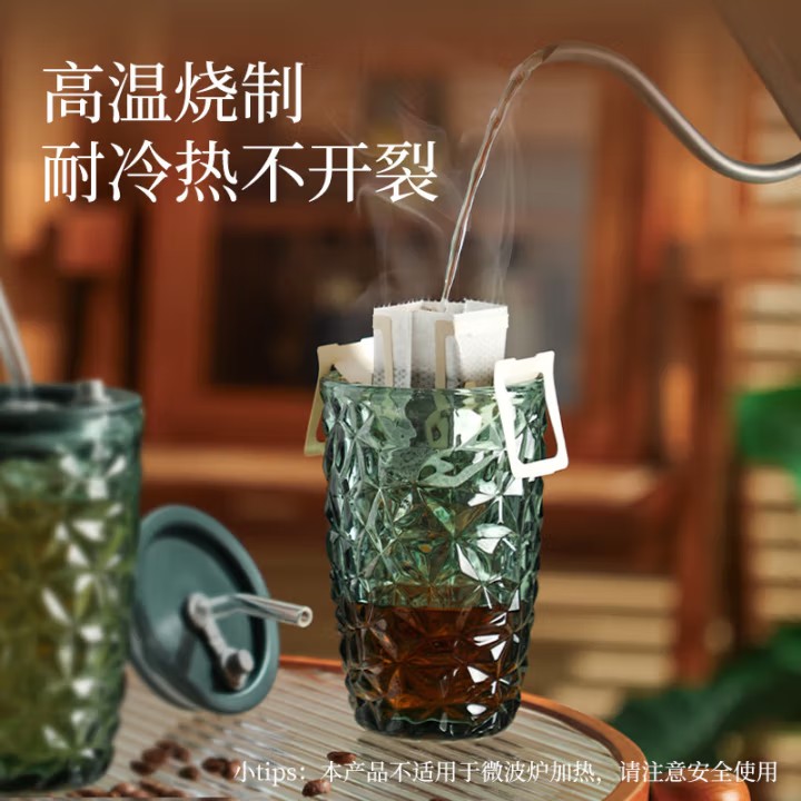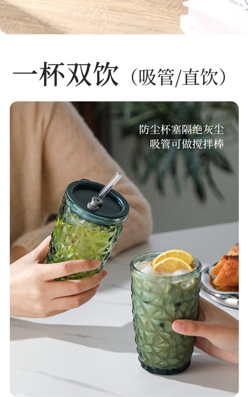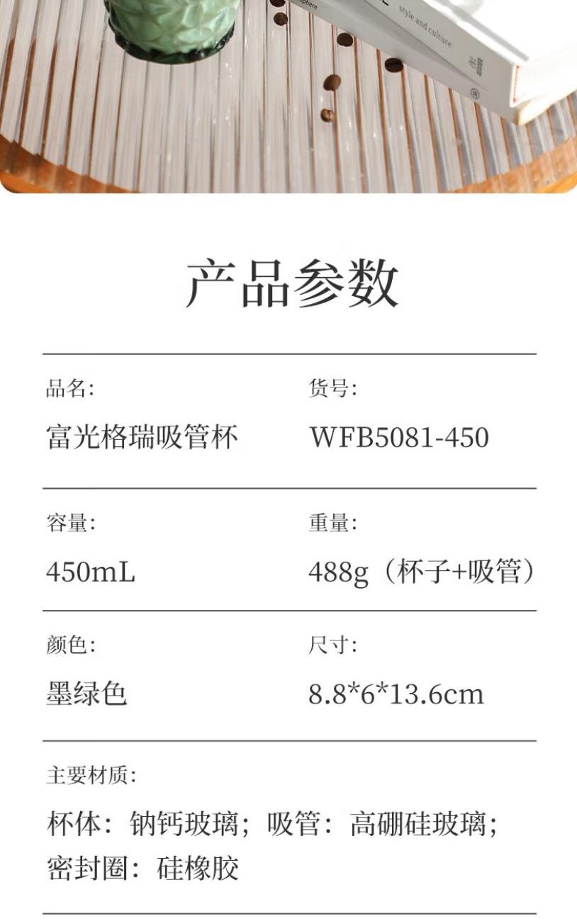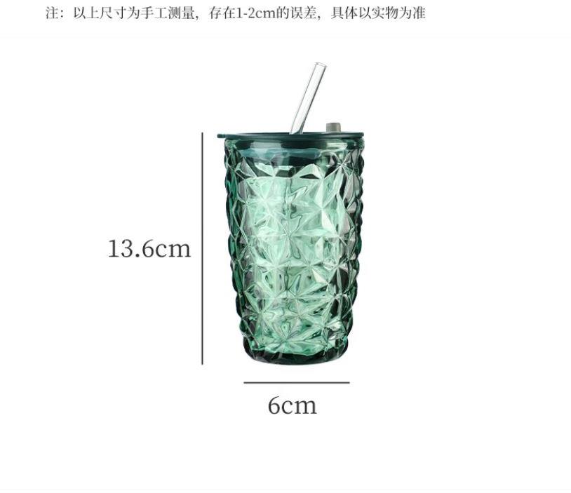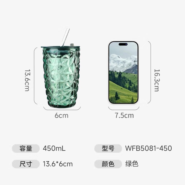 颜色:绿色 容量:450 尺寸:60*88*136mm 材质:玻璃材质,通透晶莹的无铅玻璃,几何杯身经典造型,浮雕工艺非同一般的手感。两种容量设计。 包装:单瓦盒