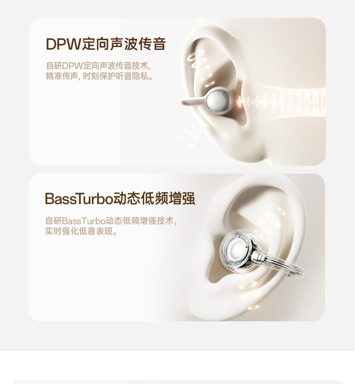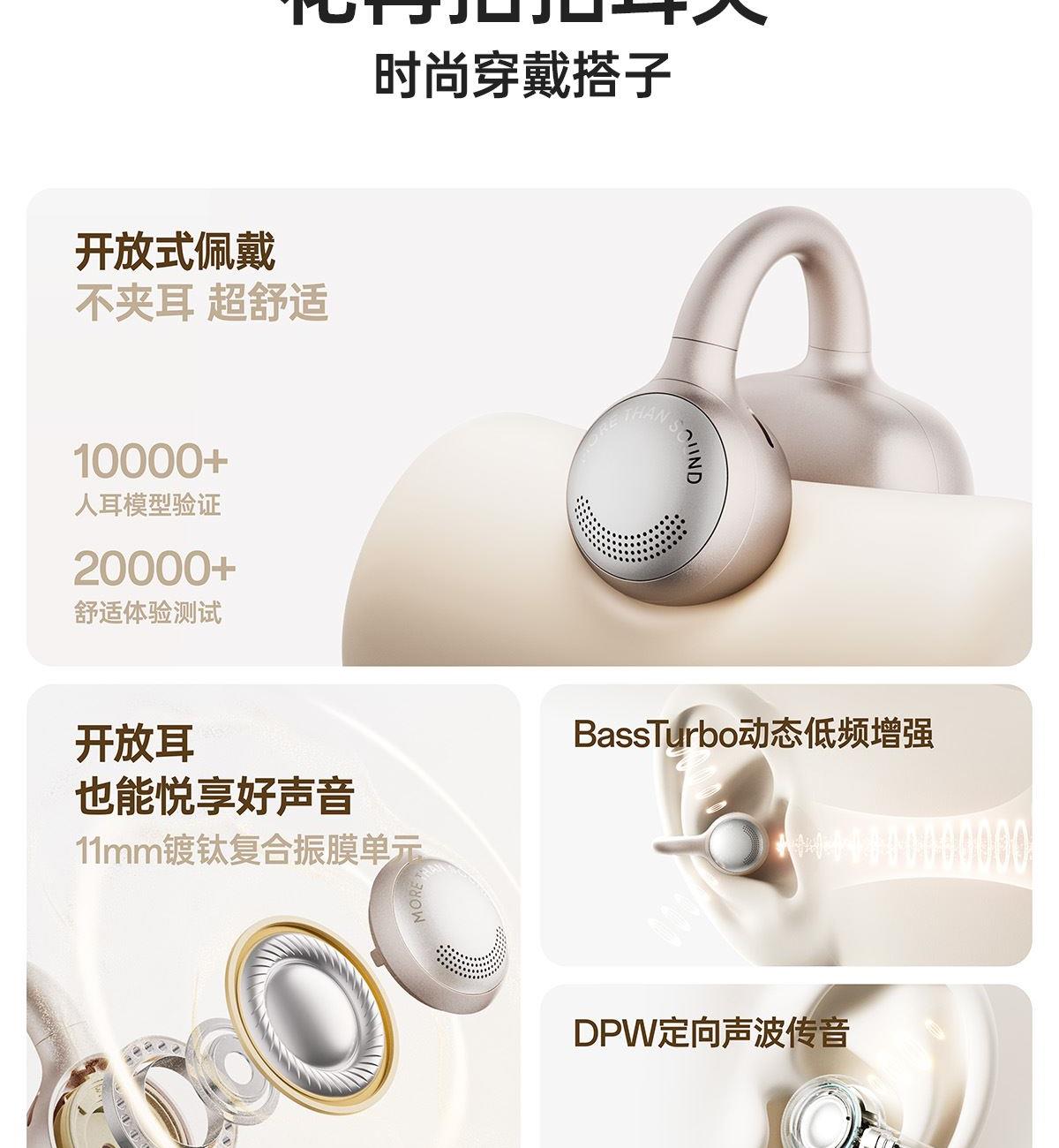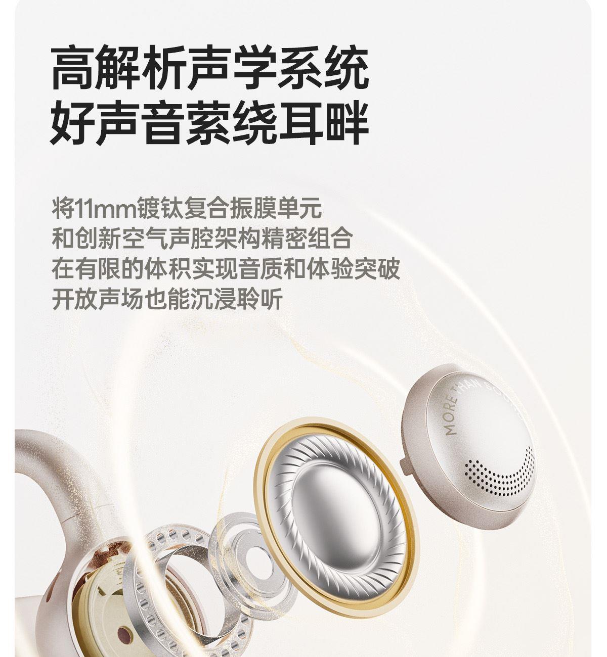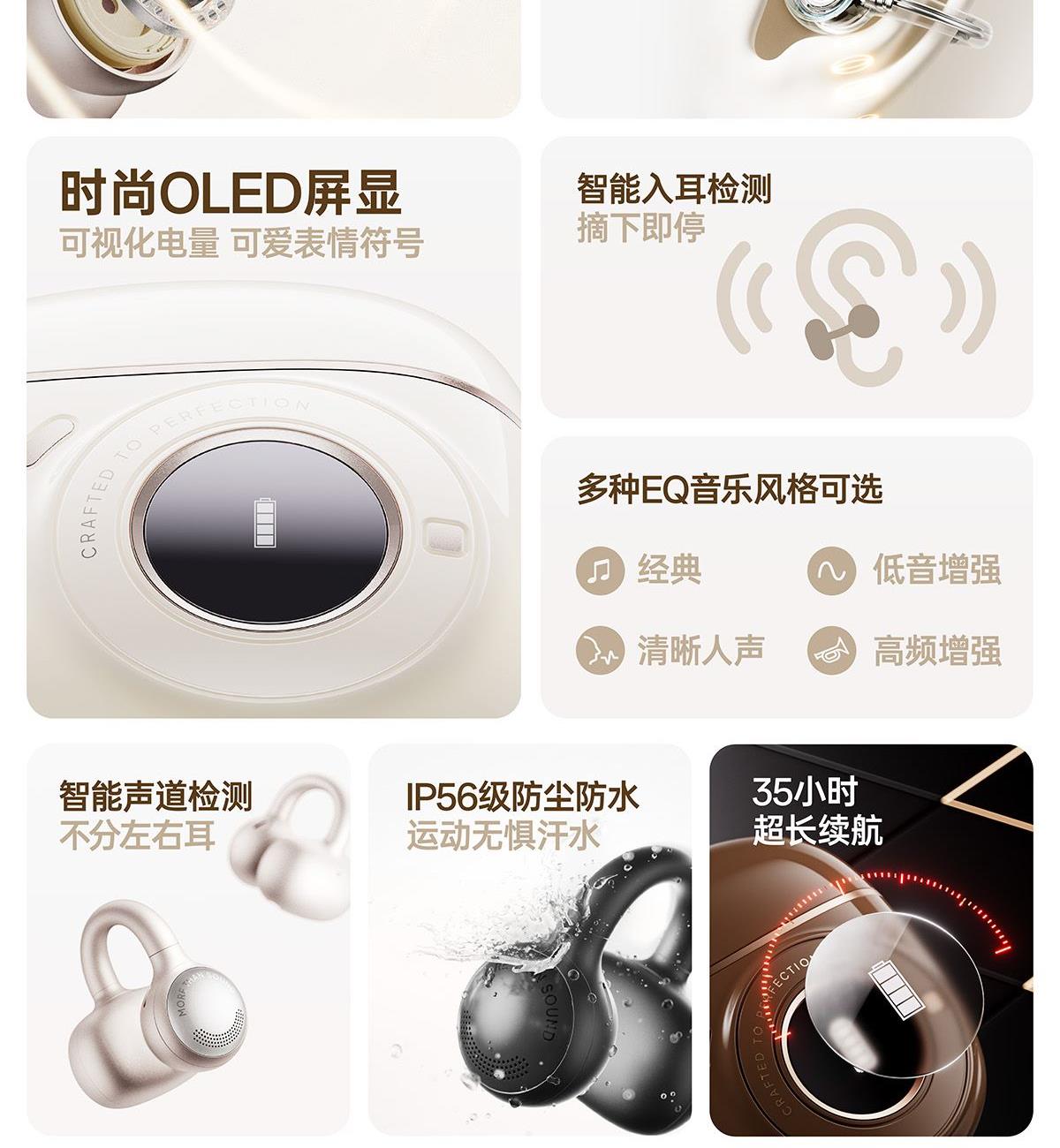 开放式佩戴 不夹耳 11mm镀钛复合振膜单元 BassTurbo动态低频增强 DPW定向声波传音 时尚OLED屏显 智能入耳检测 多种EQ音乐风格可选 智能声道检测 不分左右耳 IP56级防尘防水