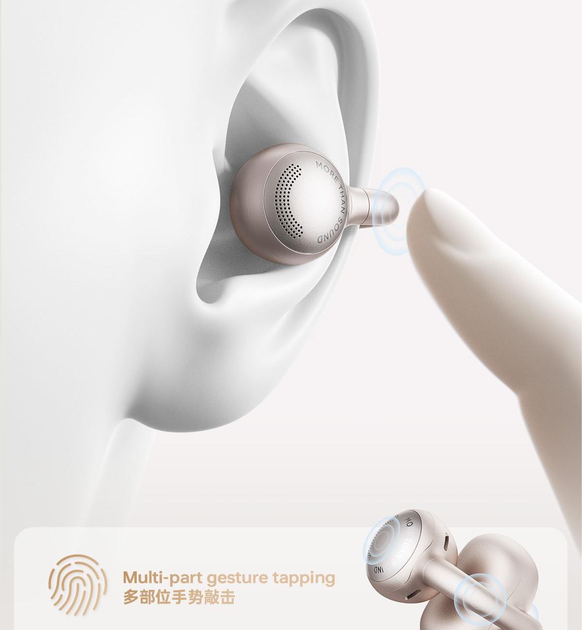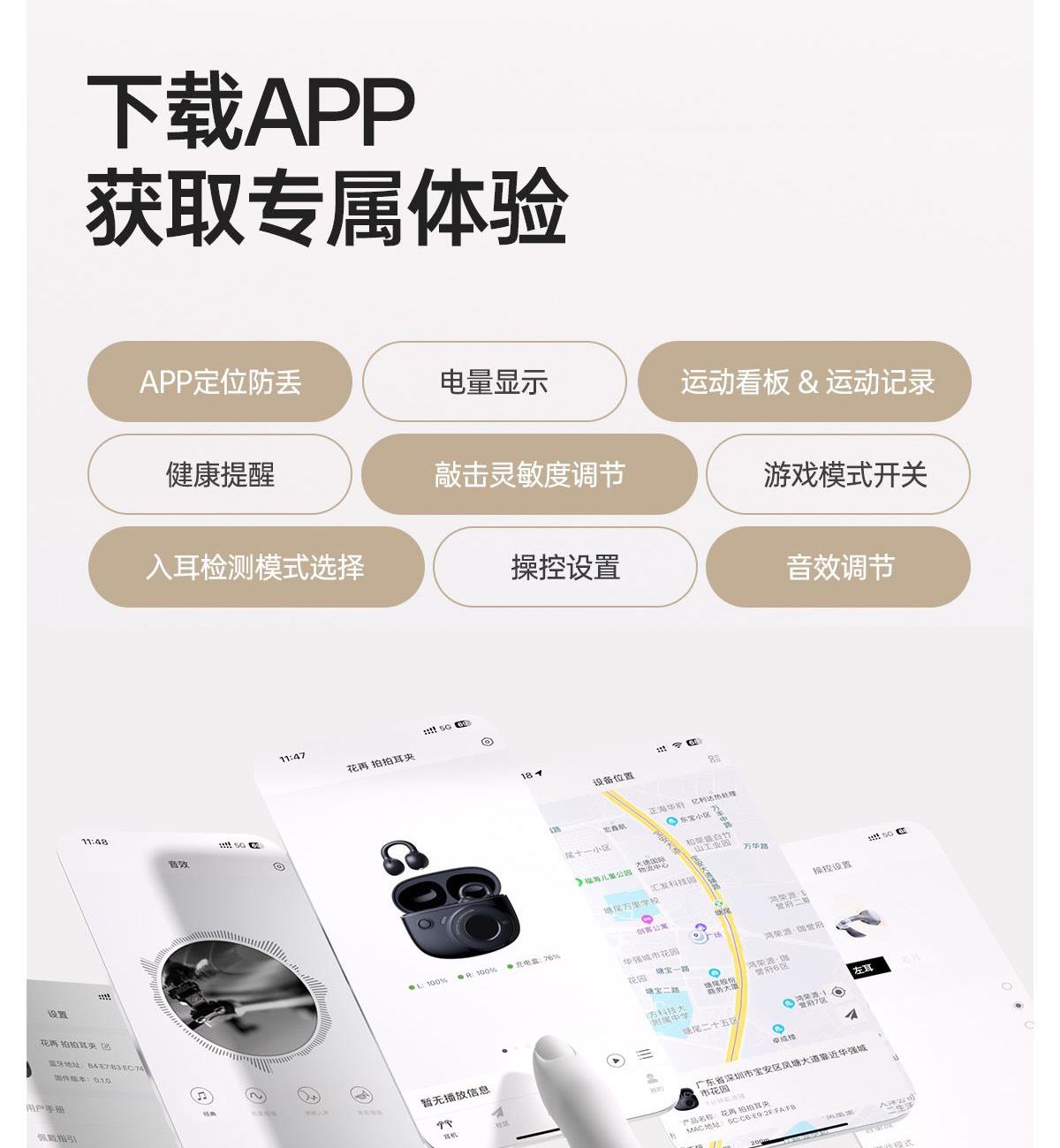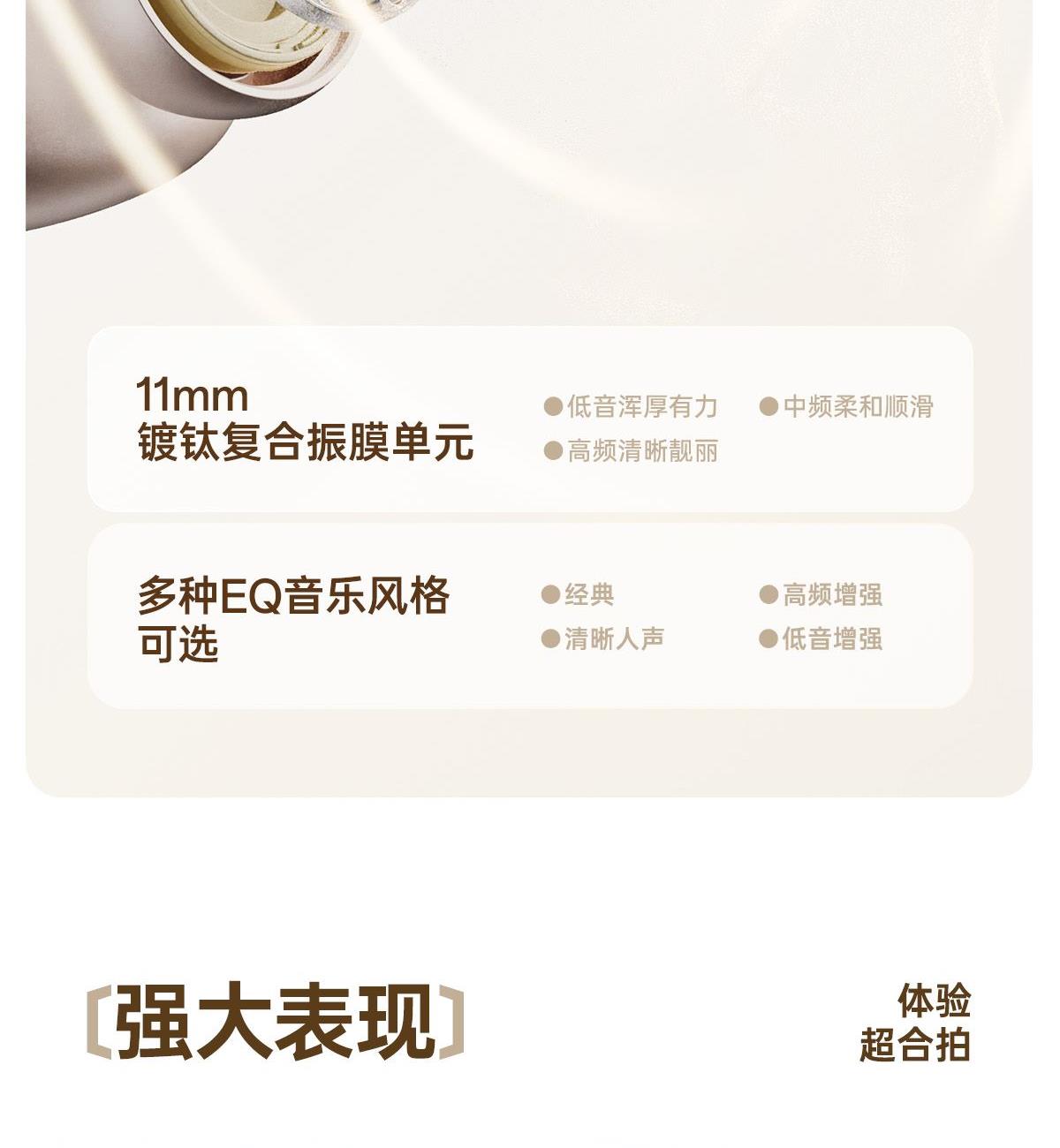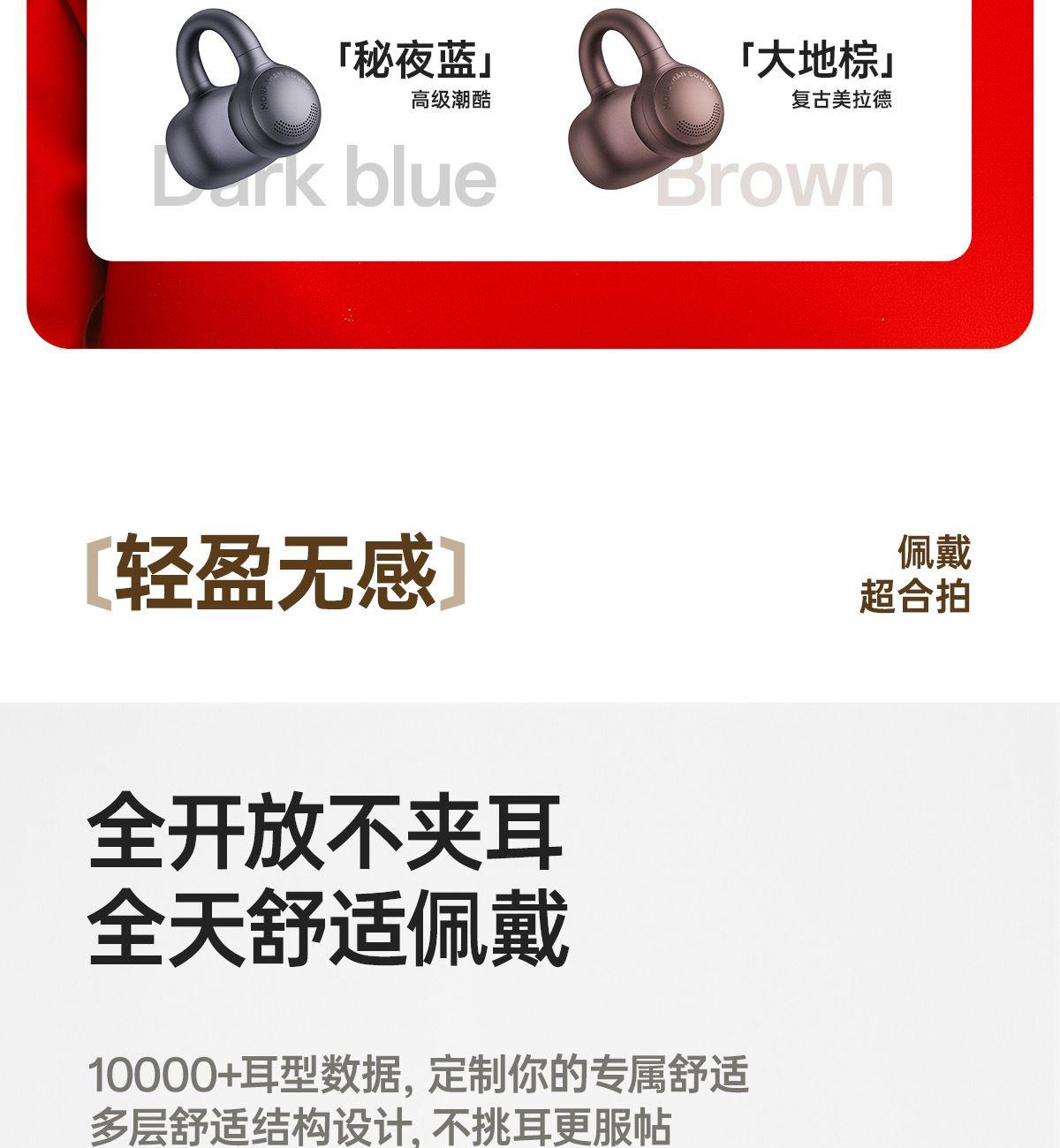 开放式佩戴 不夹耳 11mm镀钛复合振膜单元 BassTurbo动态低频增强 DPW定向声波传音 时尚OLED屏显 智能入耳检测 多种EQ音乐风格可选 智能声道检测 不分左右耳 IP56级防尘防水