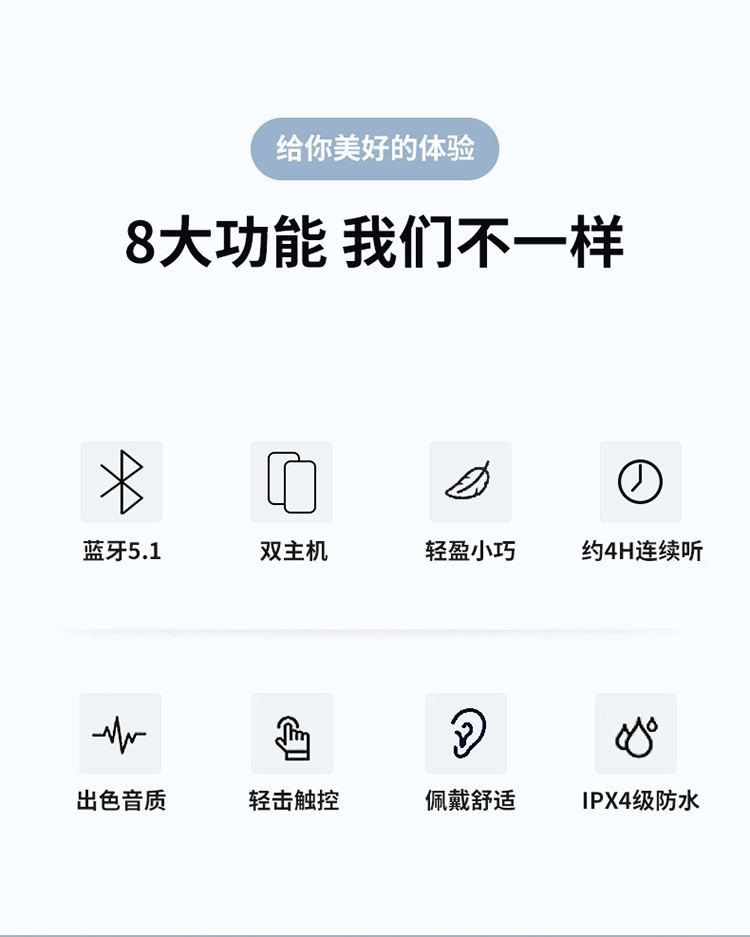4:真正双主机,左右耳机随拿随用,同步连接,减缓延迟不断连,不限制主从限制,单耳/双耳无缝切换,满足听歌,驾驶通话等不同场景需求