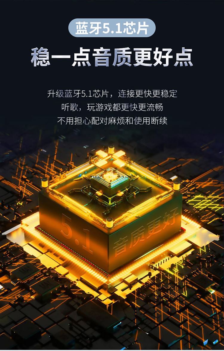 5:升级蓝牙5.1芯片,连接更快更稳定,听歌,玩游戏都更快更流畅,稳一点,音质更好点