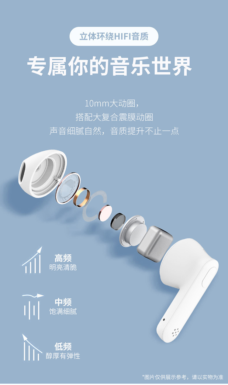 2:立体环绕HIFI音质,专属你的音乐世界,10mm大动圈,搭配大复合震膜动圈,声音细腻自然,音质提升不止一点,尽享高频明亮清脆,中频饱满细腻,低频醇厚有弹性