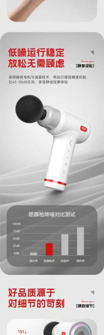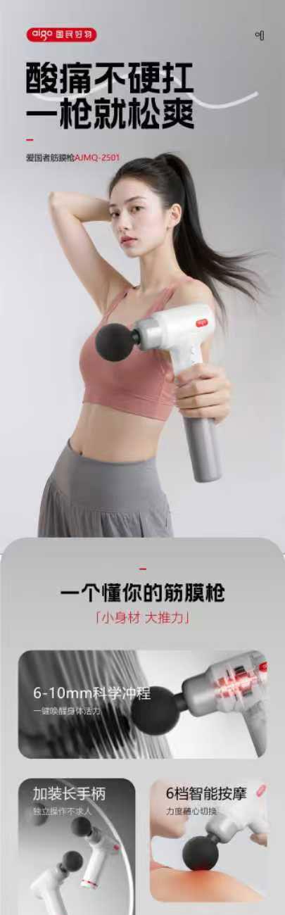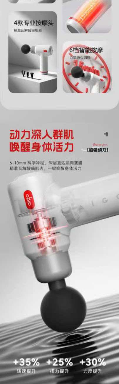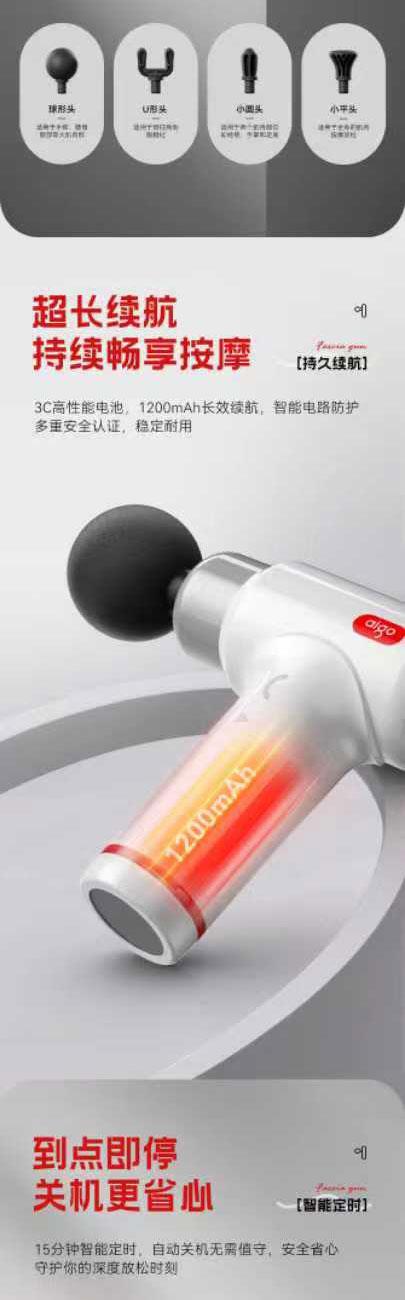 4个按摩头+Type-C充电 15分钟定时,自动关机 久持不累手,加长手柄可拆卸,轻松按摩死角 噪音45-50db,低噪音运行 6kg推力,6-10mm科学冲程 彩色幻彩呼吸灯带 420g轻巧机身 功率:25w 包装尺寸:210*195*63mm 按键款档位:1-6档 产品毛重:600g 包装方式:彩邮外 电池容量:1200毫安