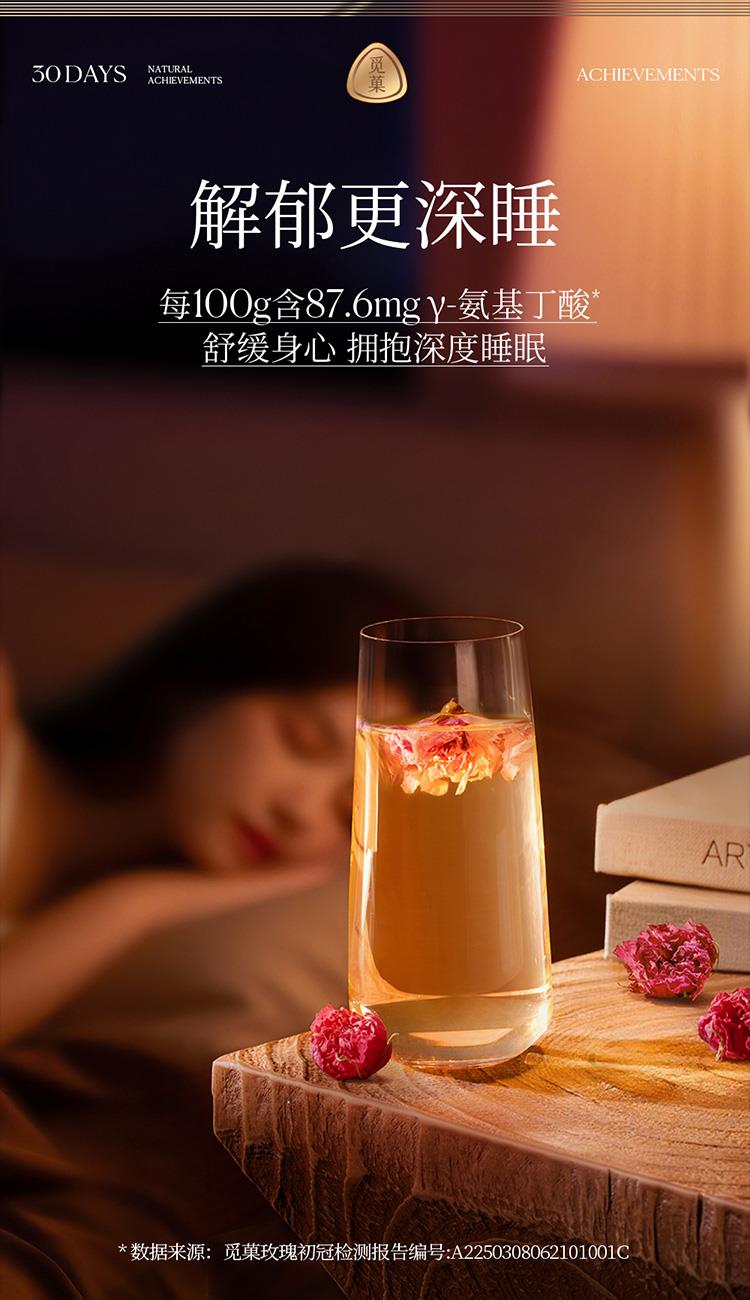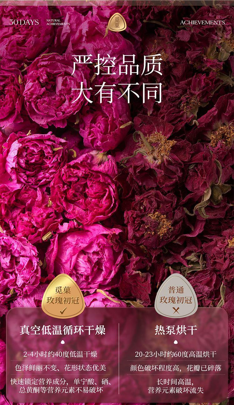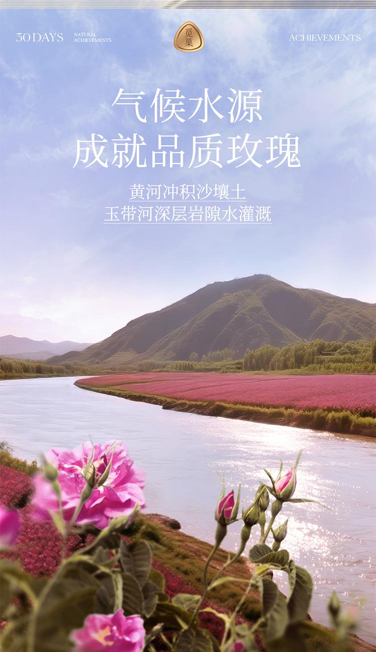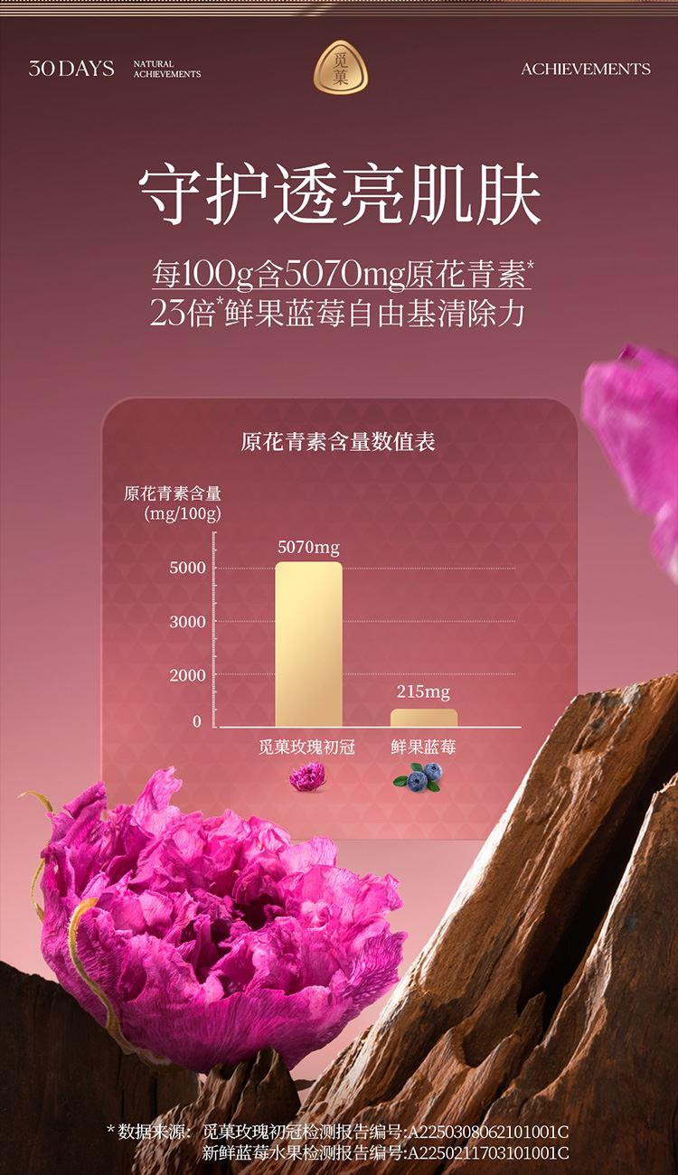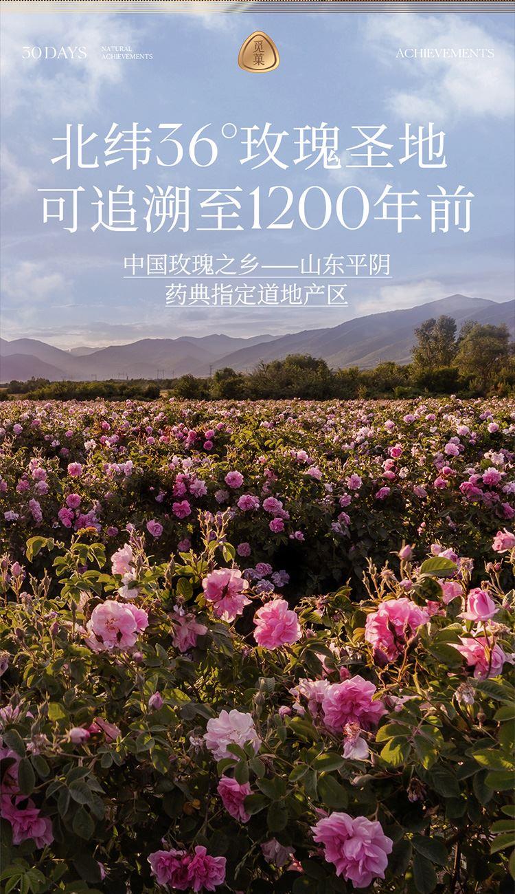 玫瑰之乡 北纬36°玫瑰圣地 可追溯至1200年前 中国玫瑰之乡--山东平阴 药典指定道地产区 舒缓身心 每100g含87.6mg y-氨基丁酸 舒缓身心 轻拥深度睡眠 焕亮肌肤 每100g含5070mg原花青素 23倍“鲜果蓝莓自由基清除力