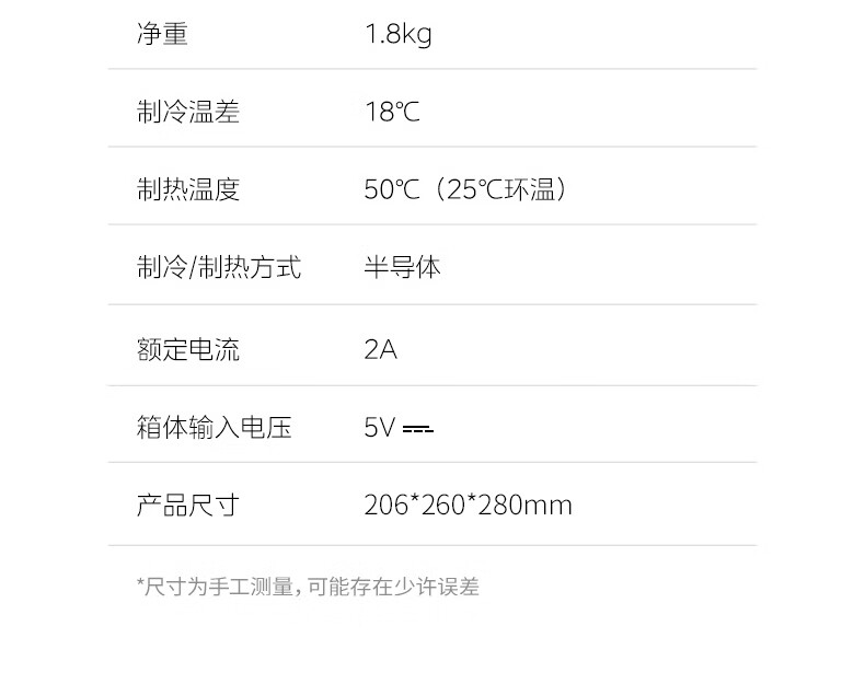 商品尺寸:206x260x280mm 包装尺寸:285x235x310mm 毛重:2.2kg 1、半导体制冷/制热双功能 2、小巧便携:1.8kg重量轻、体积小 3、环保材质:无毒无害, 外壳和内胆采用ABS/铝内胆环保材料 4、低噪音:≤38dB轻音相伴,安静不打扰