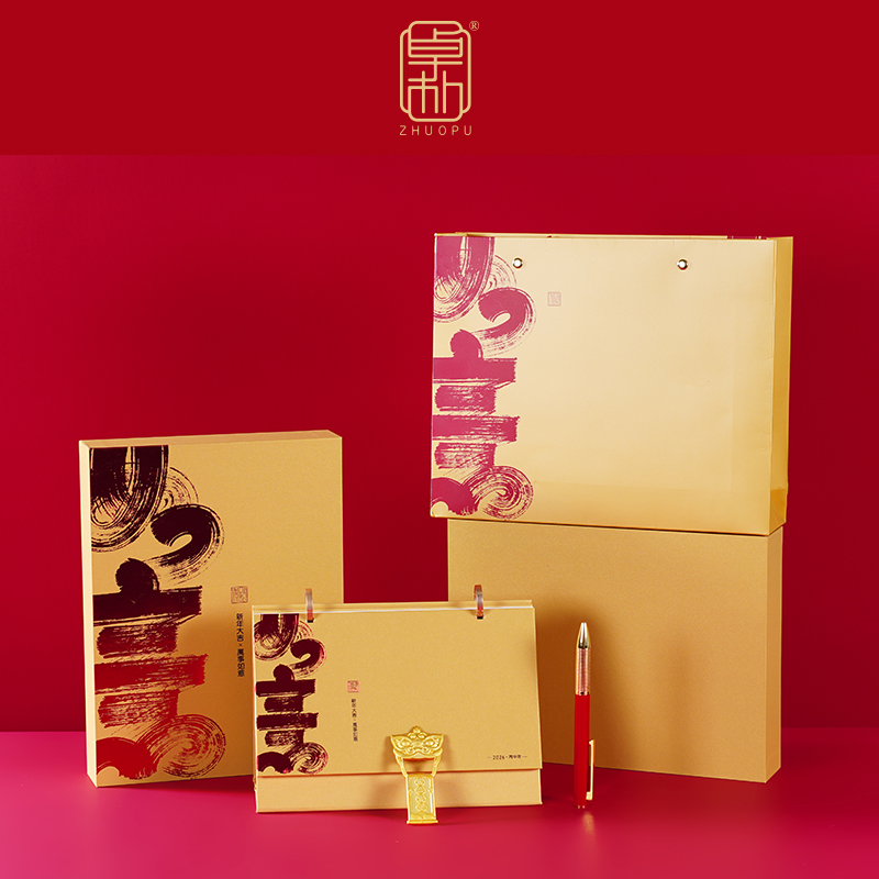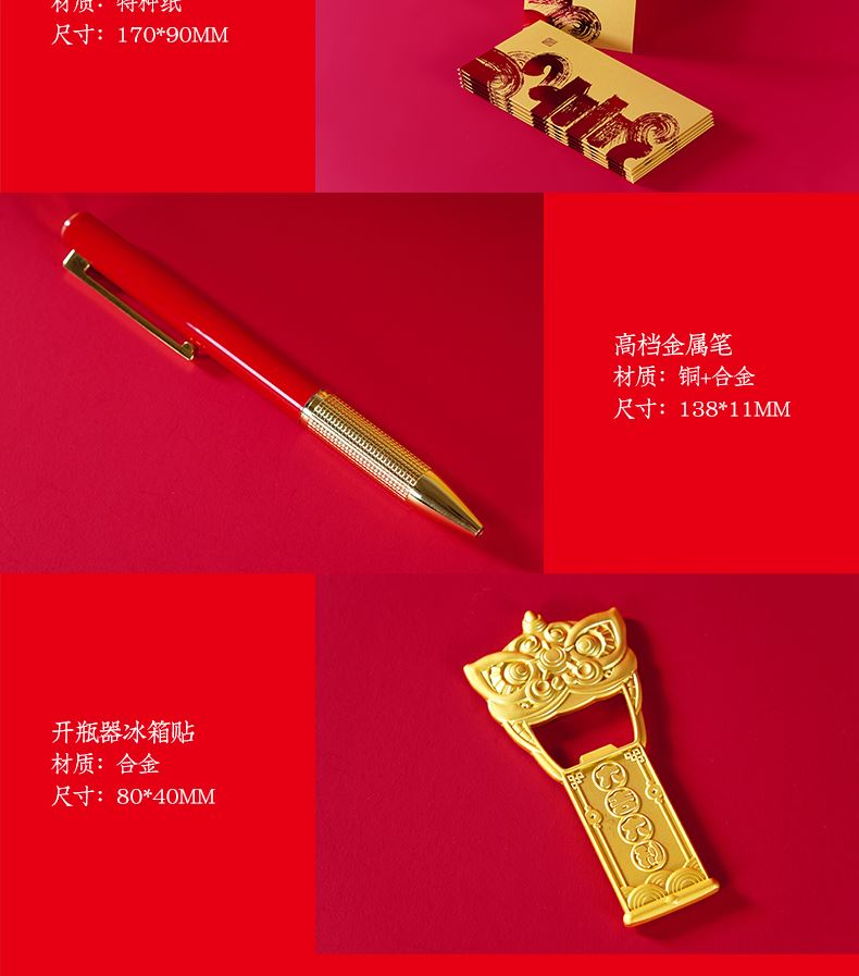 配置:台历+笔+冰箱贴 材质:珠光金纸+合金+珠光皮 尺寸:台历210*150mm 签字笔138*11mm 冰箱贴80*40mm 包装:珠光金礼盒(260*195*50mm)+手提袋