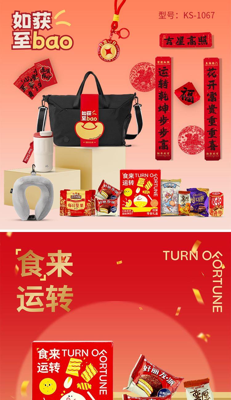 内置经典年品(春联、红包、窗花)与零食礼盒,搭配实用好物(钥匙扣、U型枕、保温杯),心意满满。