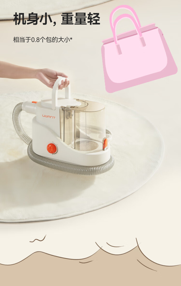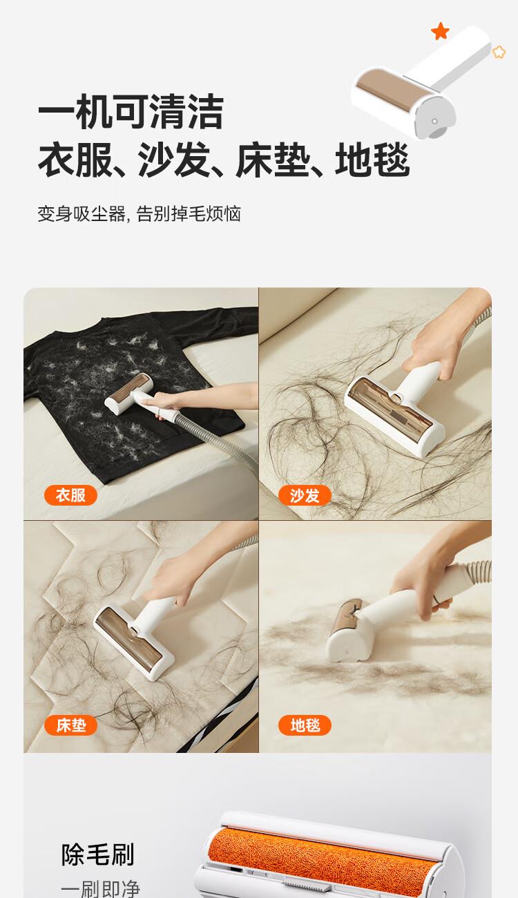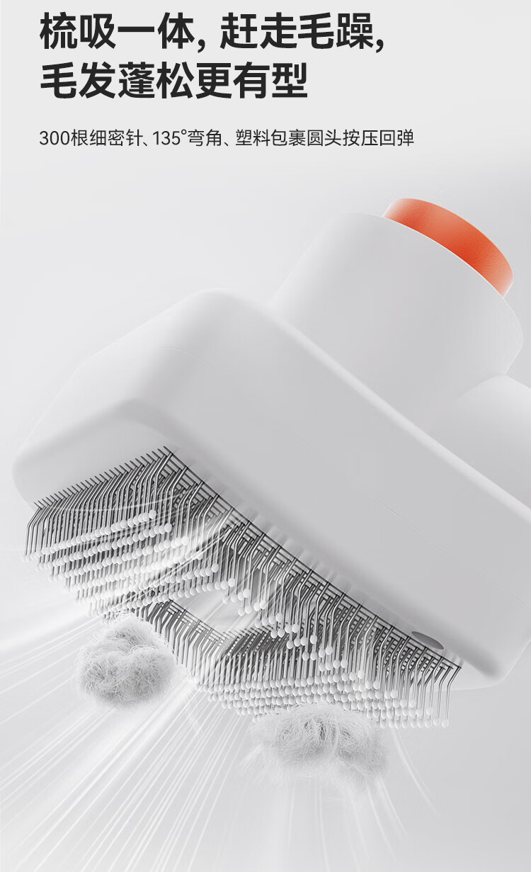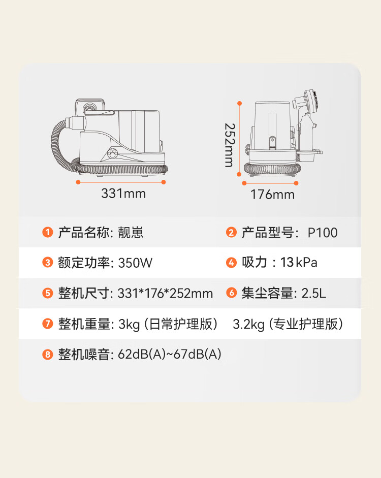 额定功率:350W 整机尺寸: 331*176*252mm 整机重量:3kg(日常护理版) 整机噪音:62dB(A)~67dB(A) 吸力:13kPa 集尘容量:2.5L 300根细密针、135°弯角、塑料包裹圆头按压回弹 一机可清洁衣服、沙发、床垫、地毯 13kPa大吸力,长毛短毛都能轻松吸走