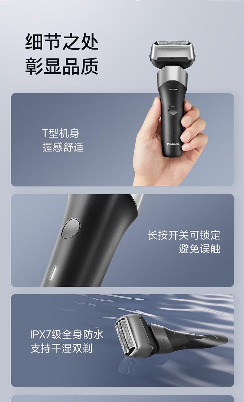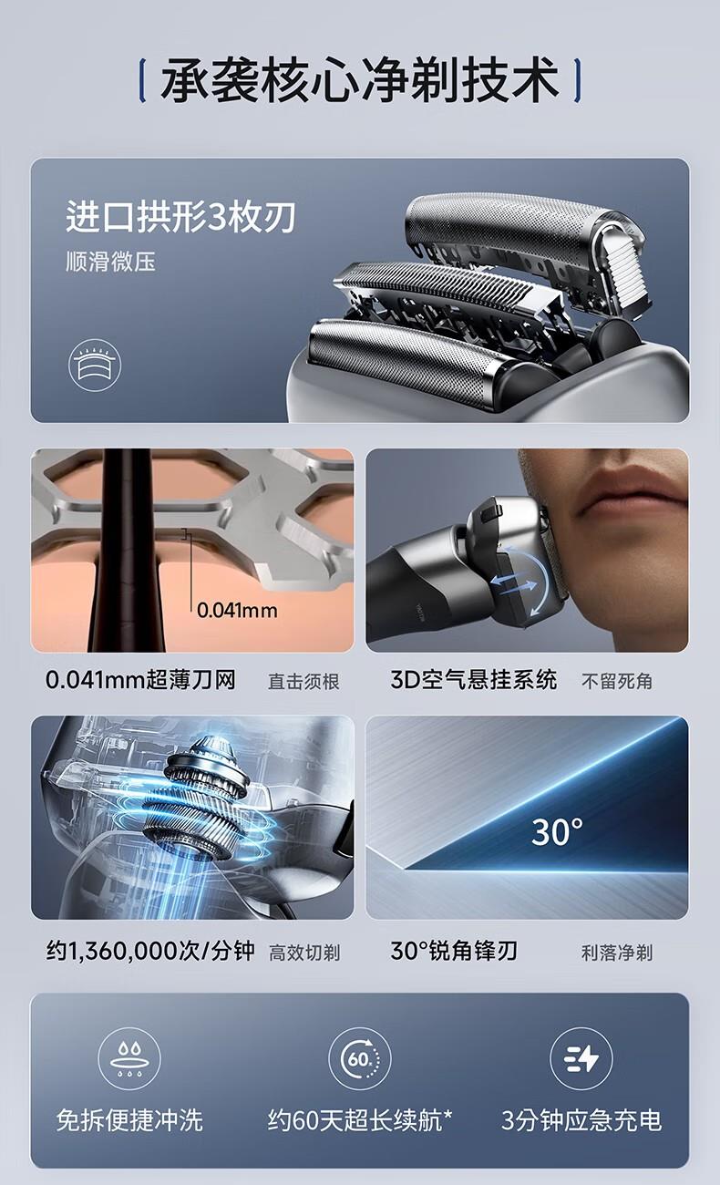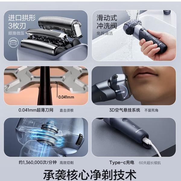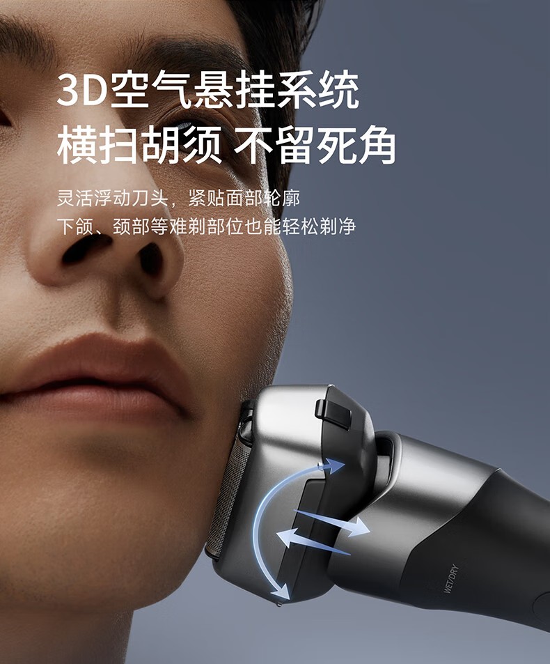 颜色:黑色、蓝色 刀头数量:2个 日本安莱精钢进口刀刃锋利切割,坚韧耐磨; 3D空气悬挂系统横扫胡须,不留死角; 浮动刀头设计轻松贴合, 滑动式冲洗阀免拆洗,易清洁; 充满一次电可用约60天; T型机身握感舒适; IPX7级全身防水支持干湿双剃。