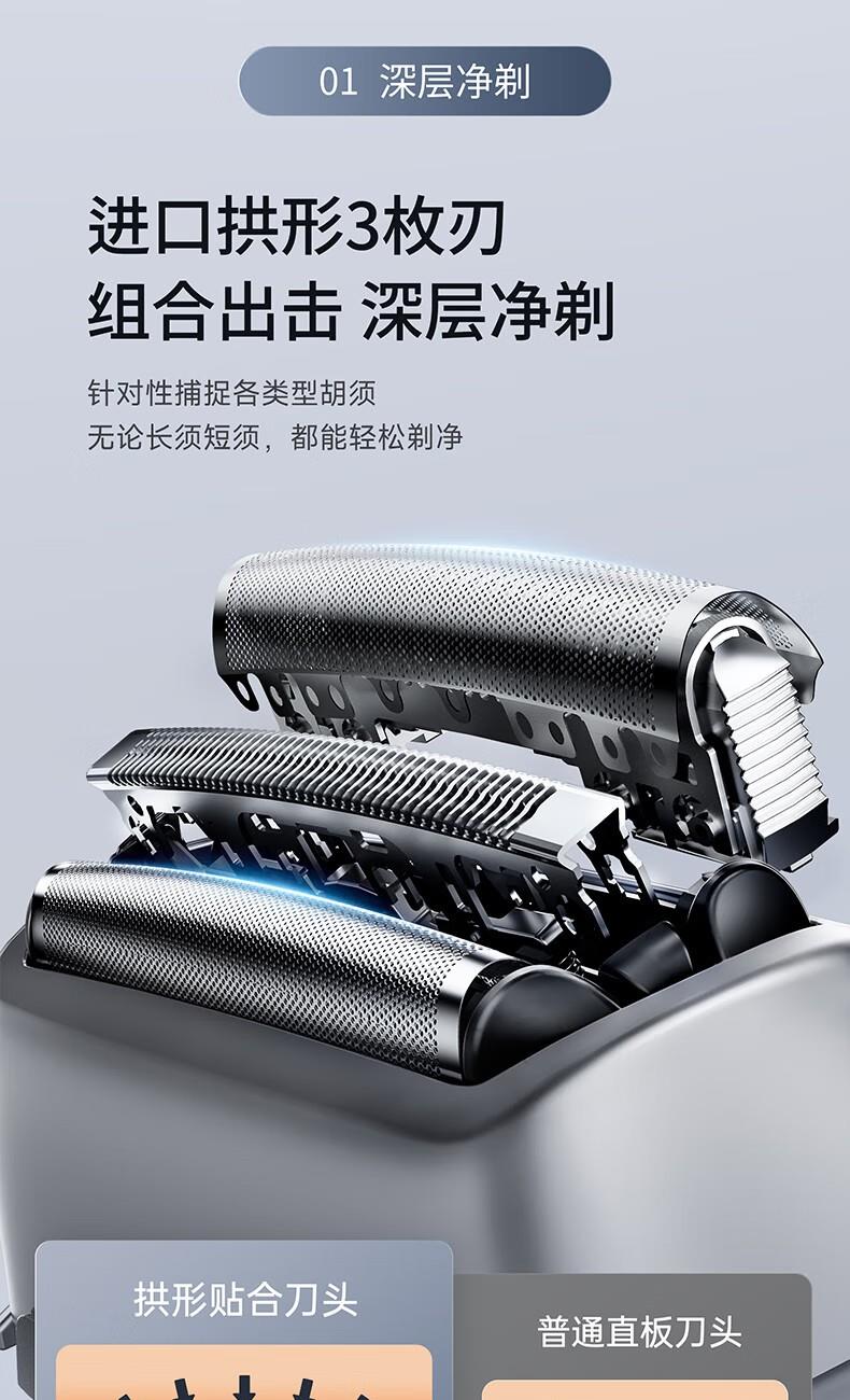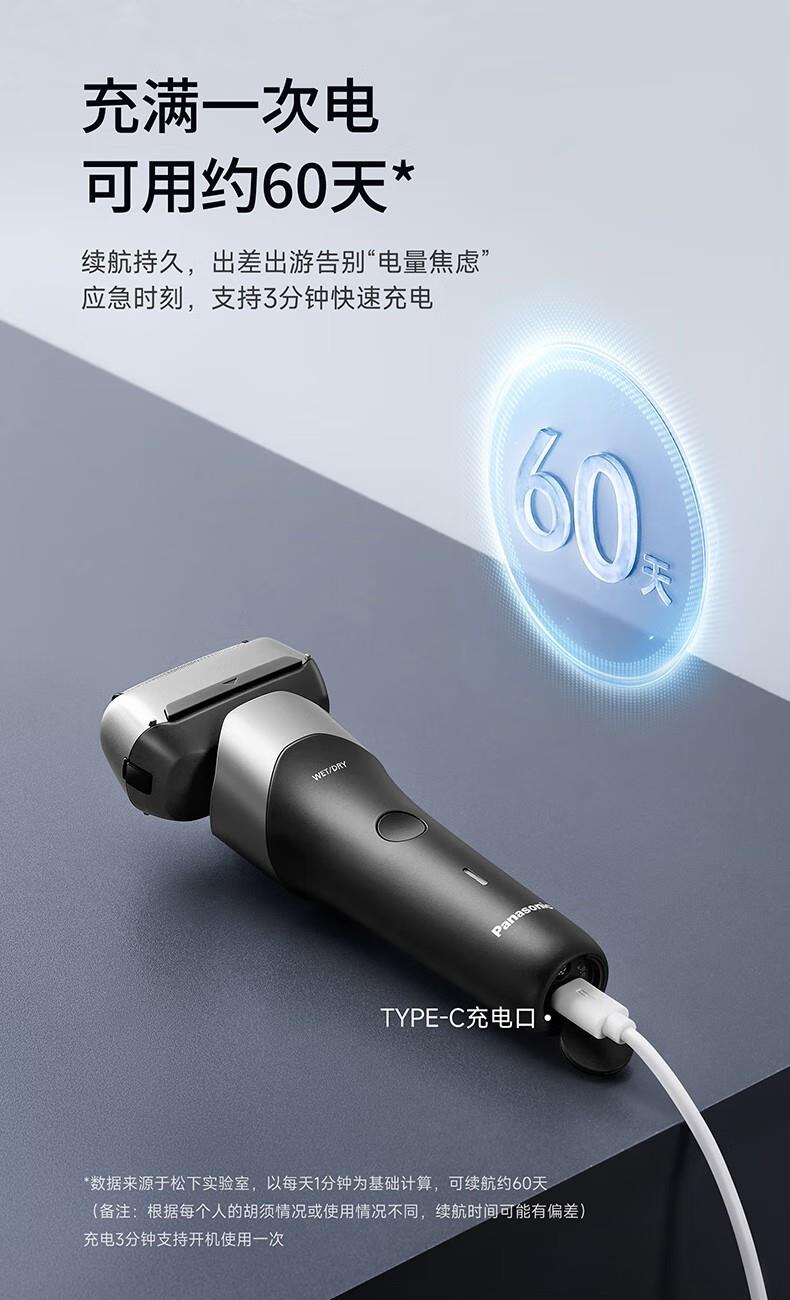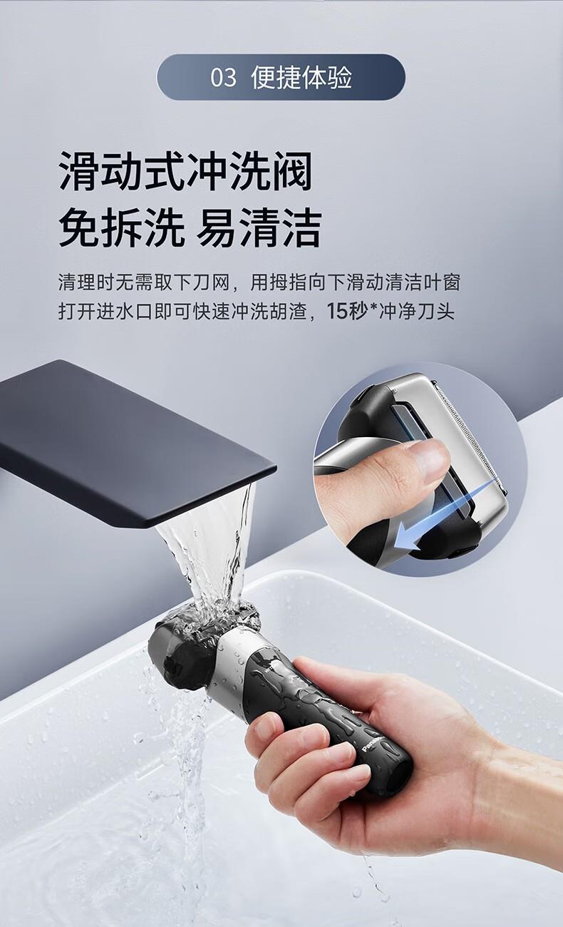 颜色:黑色、蓝色 刀头数量:2个 日本安莱精钢进口刀刃锋利切割,坚韧耐磨; 3D空气悬挂系统横扫胡须,不留死角; 浮动刀头设计轻松贴合, 滑动式冲洗阀免拆洗,易清洁; 充满一次电可用约60天; T型机身握感舒适; IPX7级全身防水支持干湿双剃。