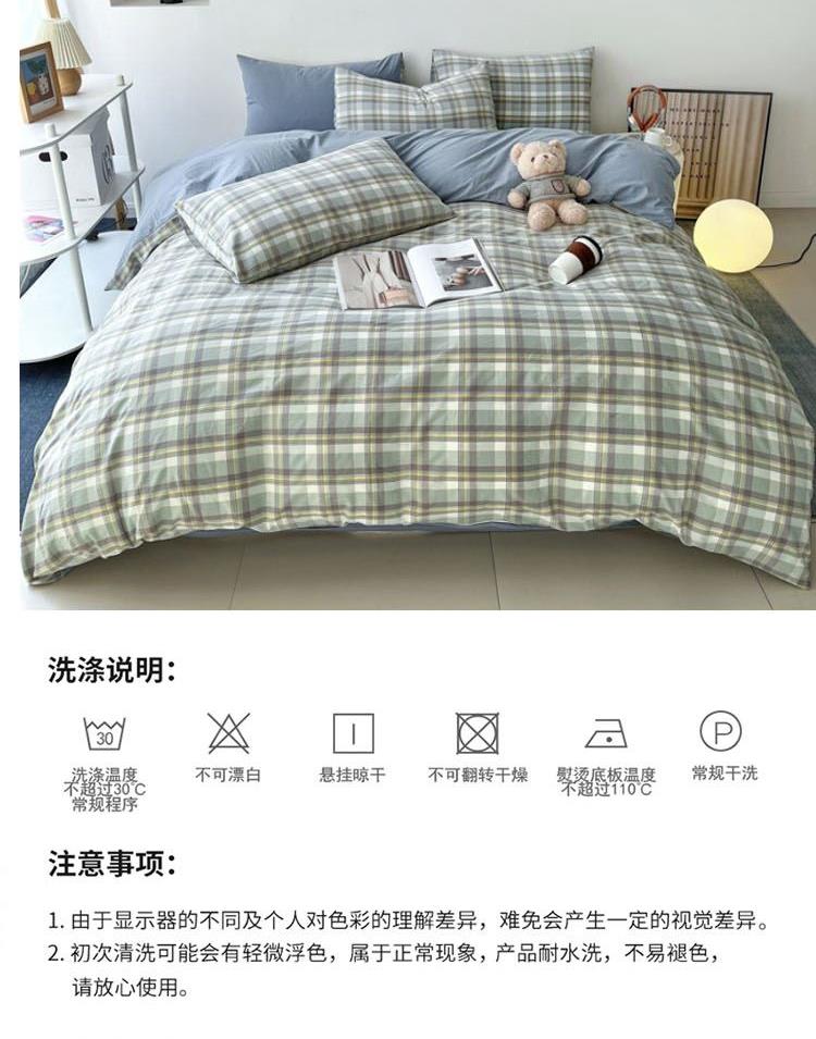 花色:诺西绿 面料:聚酯纤维 被套:200*230cm 床单:230*250cm 枕套:48*74cm*2 外箱尺寸:520*370*900mm 采用活性磨毛印花,洗后不易脱色不变形、不起球。依然如新,绿色无污染,手感细腻柔软,经纬密度均匀,面料厚实不起球。