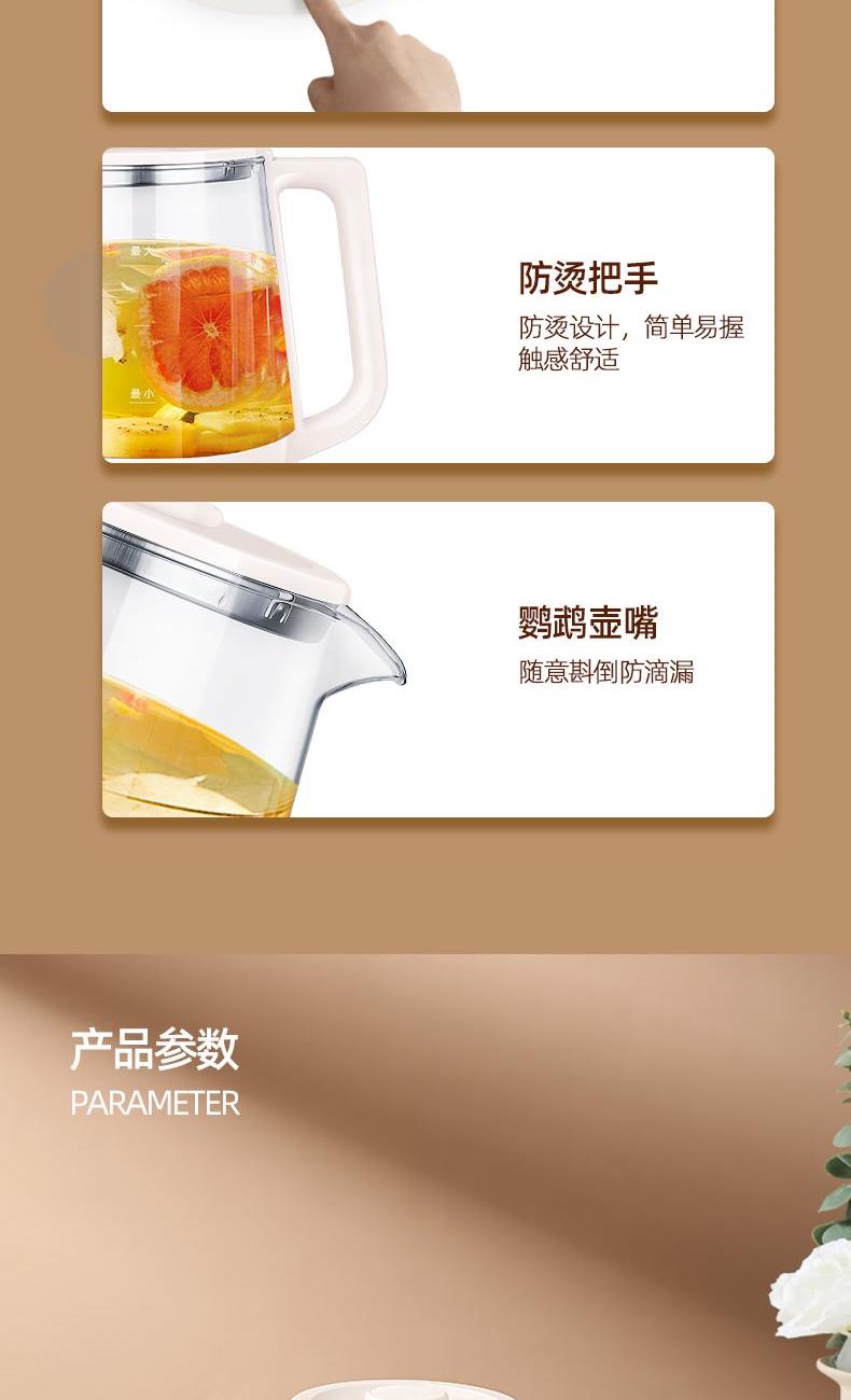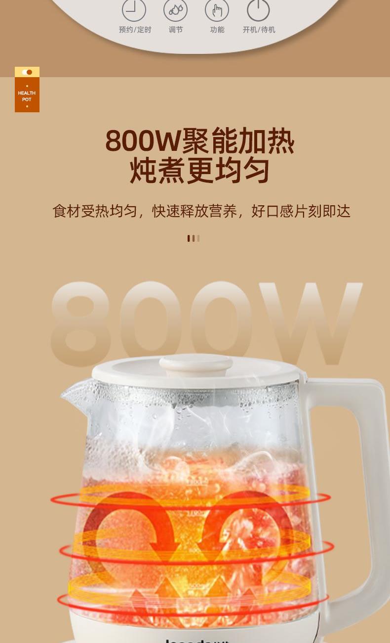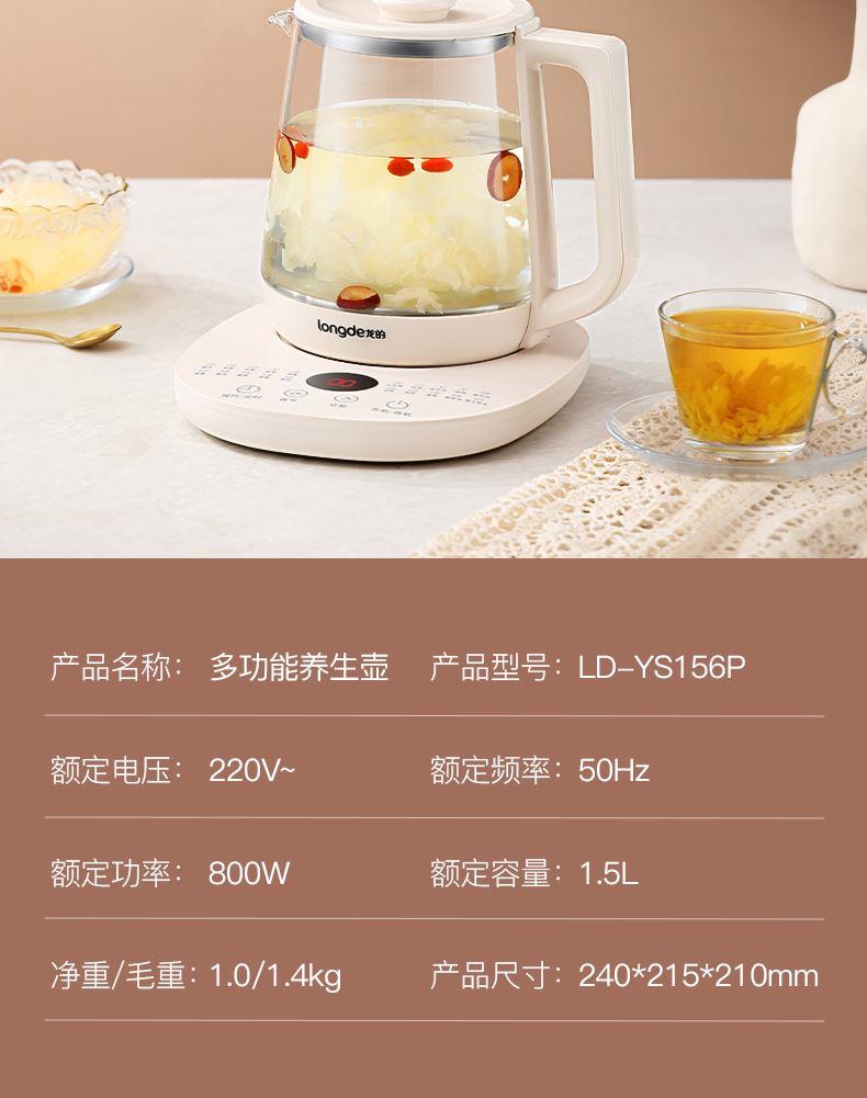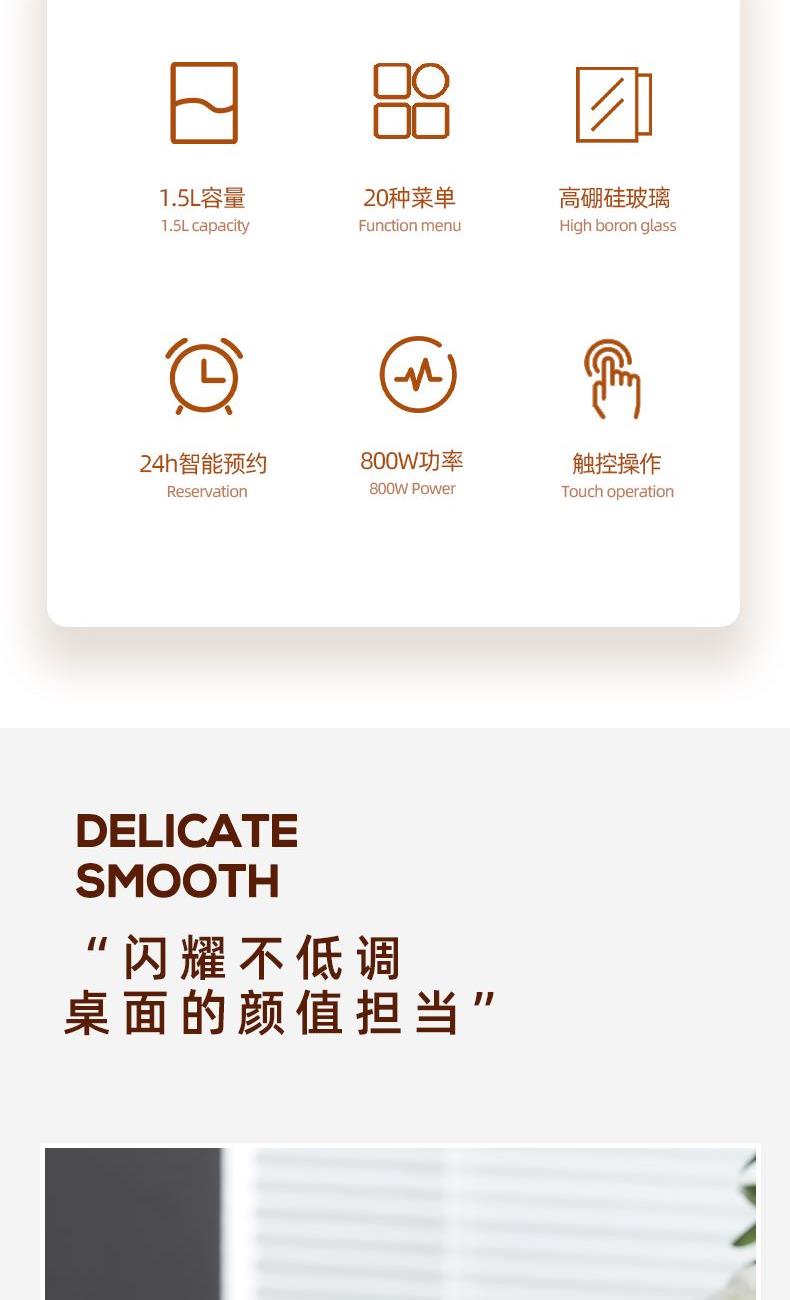 额定功率:800W 产品容量:1.5L 额定电压:220V~ 产品频率:50Hz 产品净重:1.0kg 产品毛重:1.3kg 整箱重量:16.5kg 装 箱 数:12台/箱 高硼硅玻璃壶身高硼硅玻璃冷热交替不易裂 食品级不锈钢发热体食品级不锈钢发热体,长久耐用 触控菜单选择20大触控菜单选择,数码显示 功率可调、时间可调功率可调,180分钟定时,24小时预约