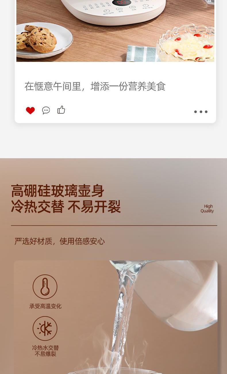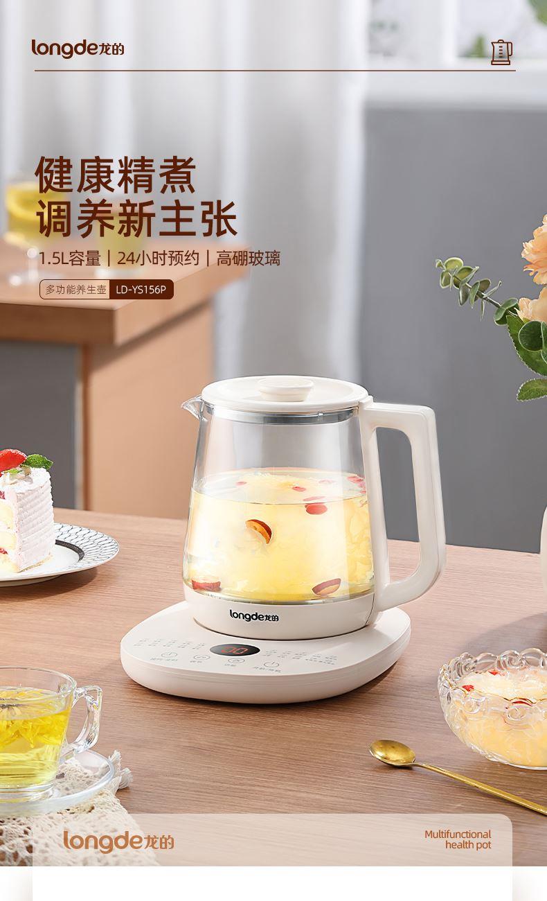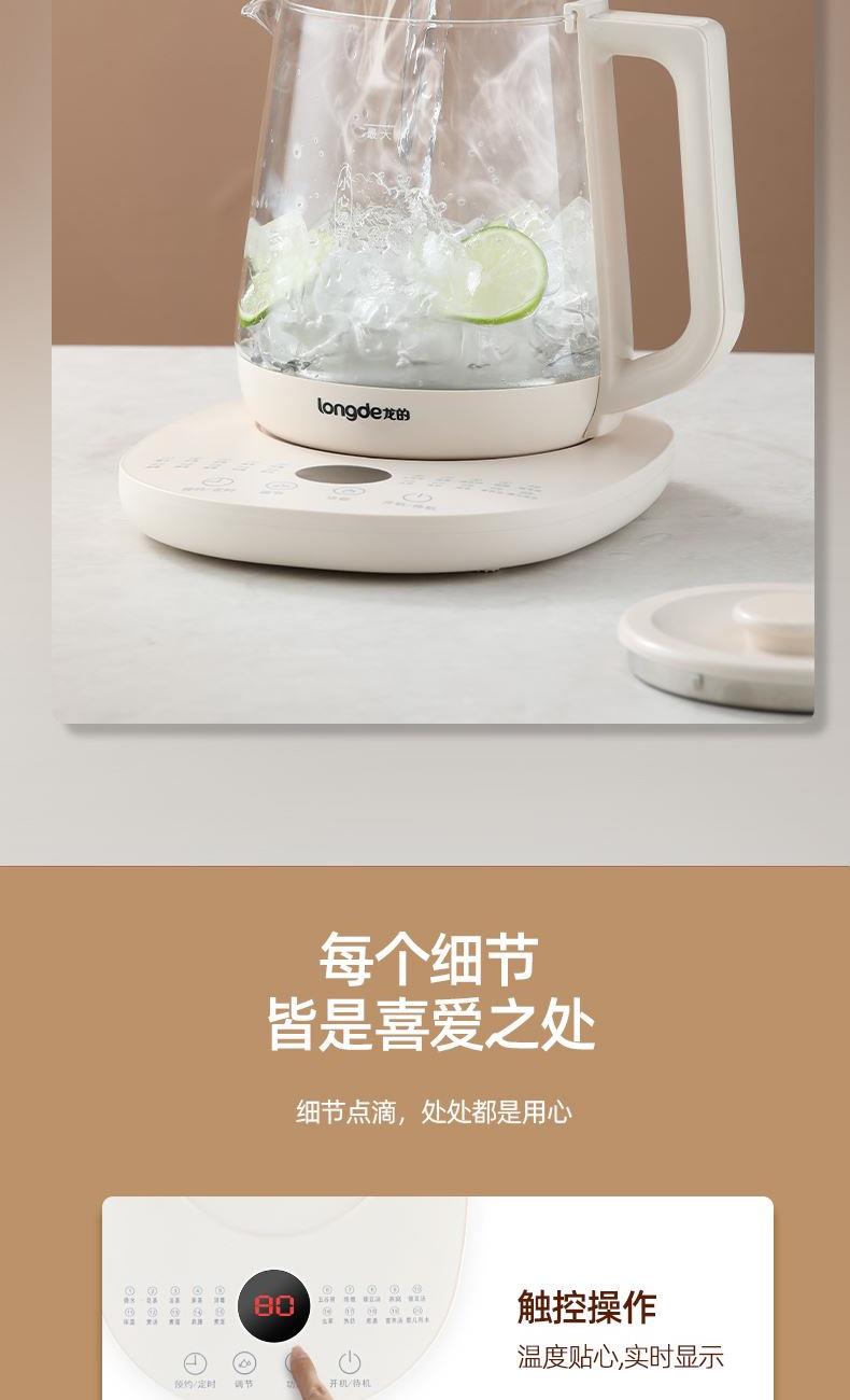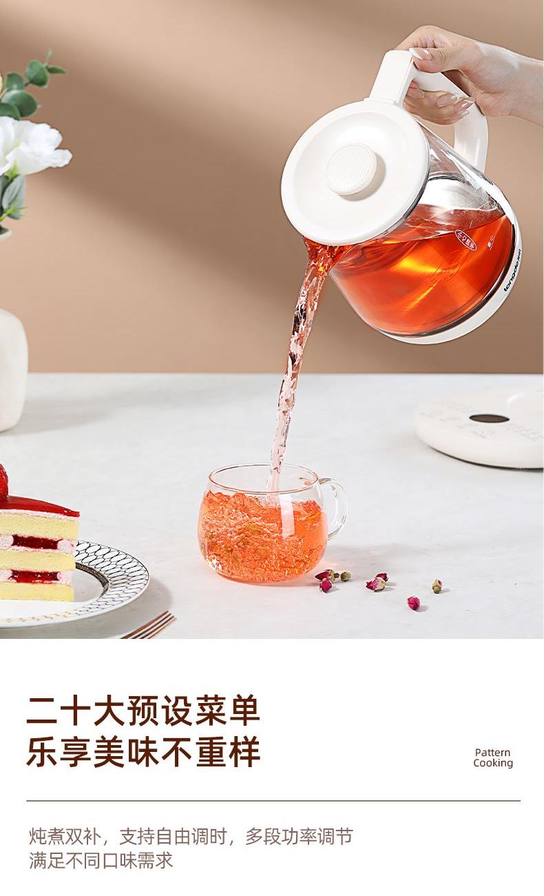 额定功率:800W 产品容量:1.5L 额定电压:220V~ 产品频率:50Hz 产品净重:1.0kg 产品毛重:1.3kg 整箱重量:16.5kg 装 箱 数:12台/箱 高硼硅玻璃壶身高硼硅玻璃冷热交替不易裂 食品级不锈钢发热体食品级不锈钢发热体,长久耐用 触控菜单选择20大触控菜单选择,数码显示 功率可调、时间可调功率可调,180分钟定时,24小时预约