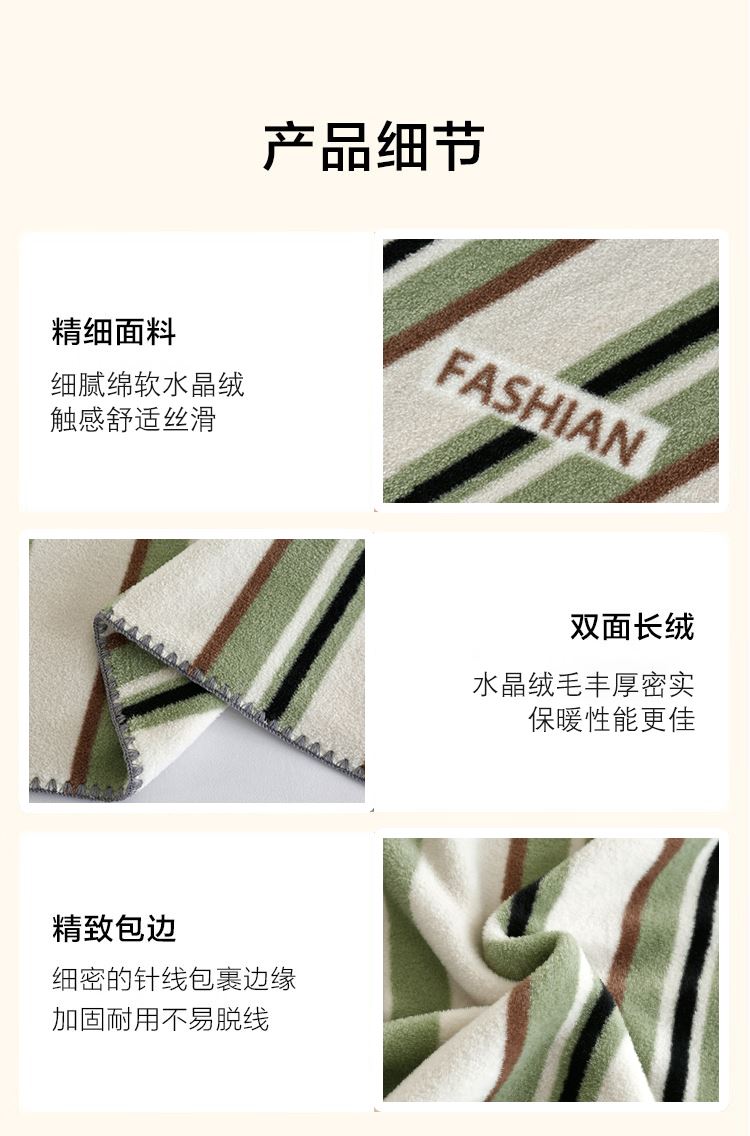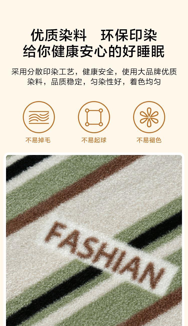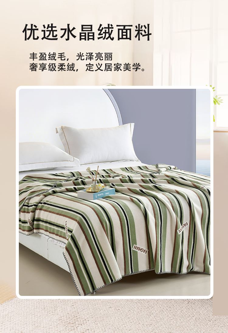 规格:200*230cm 面料:水晶绒 克重:2300g 执行标准:FZ/T61002-2019 安全类别:GB18401-2010 B类 1.优选水晶绒面料,毛感细腻,亲肤舒适,速热保暖,透气吸湿,保暖性更好,快速升温。2.内置导电纱,防静电处理,使用更安心;3.简约设计,使得毯子更显档次,更显时尚。精致的包边工艺,做工精细,针脚细密,不易脱线,牢固耐用。