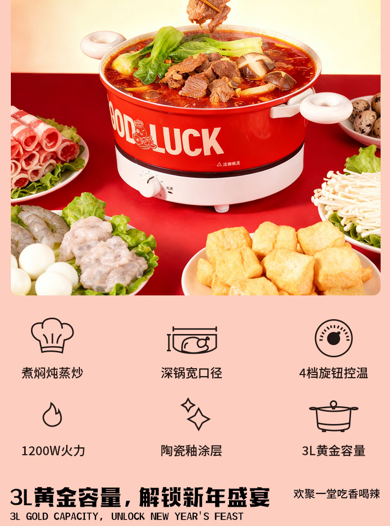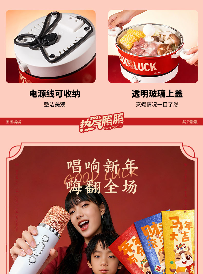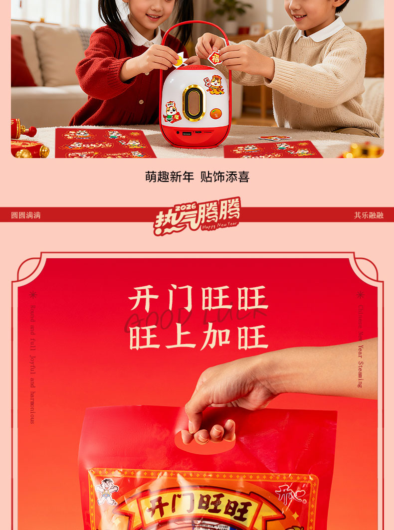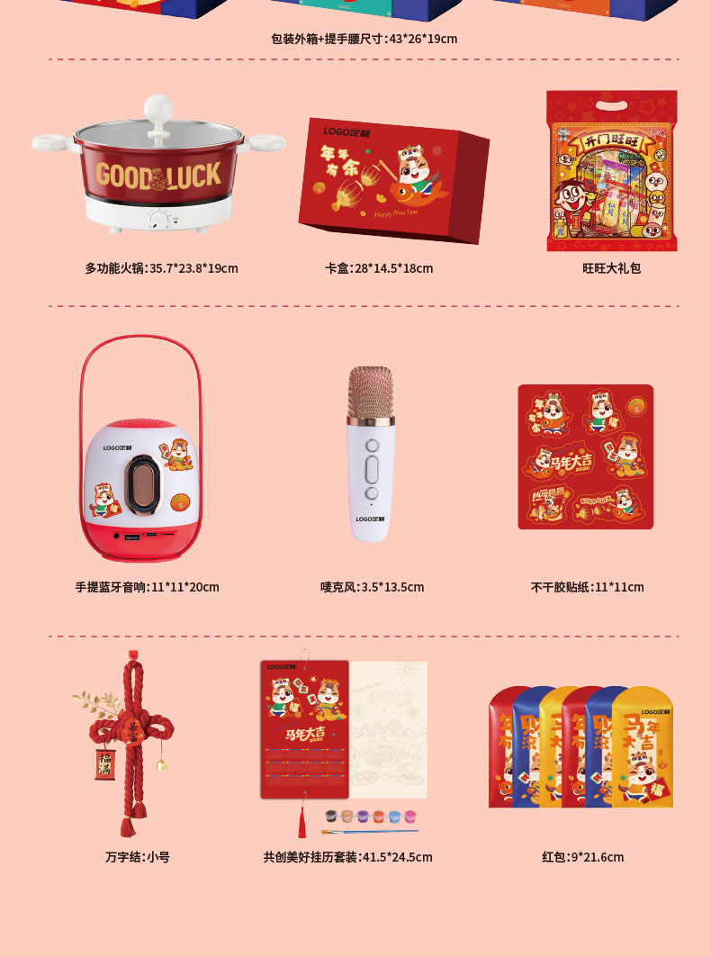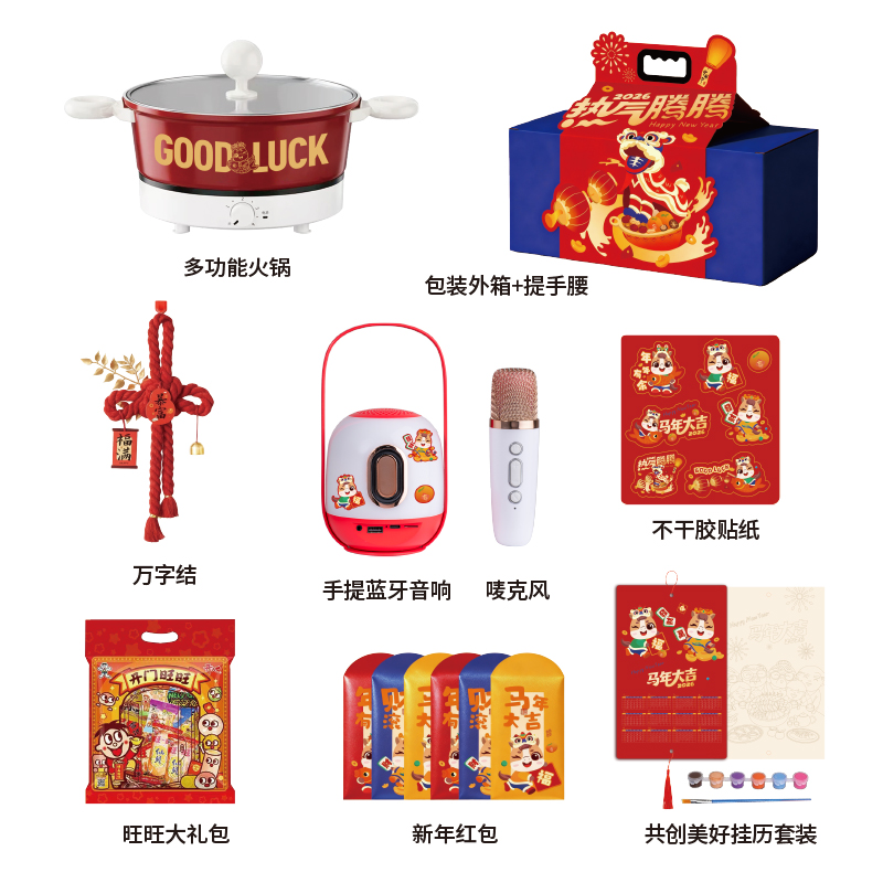 1.多功能料理锅电火锅 2.万字结*1 3.共绘美好 挂历 4.DIY颜料*1 5.旺旺礼包 6.财源滚滚 红包*6 7.蓝牙音响:7彩氛围灯、3档调节亮度、话筒*1、1800mAh