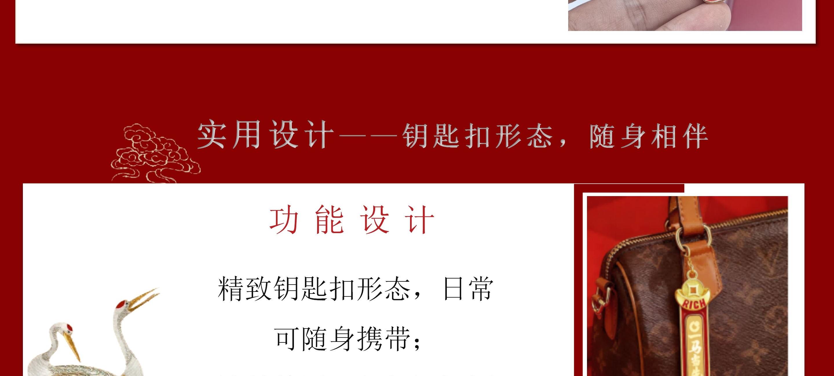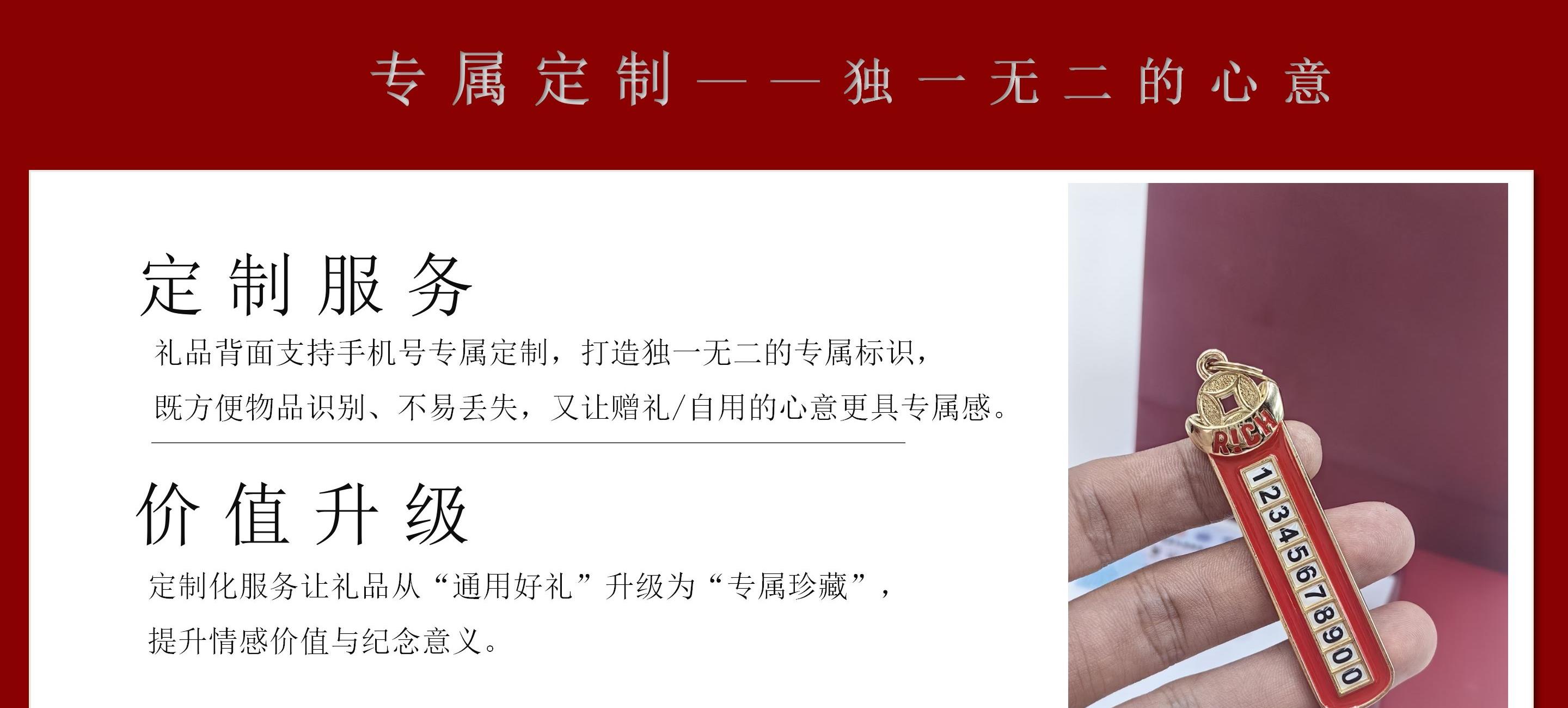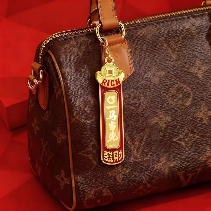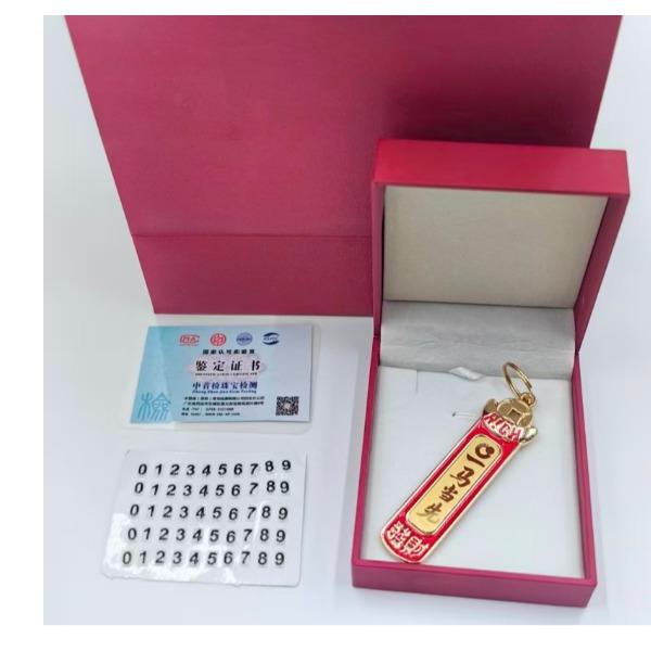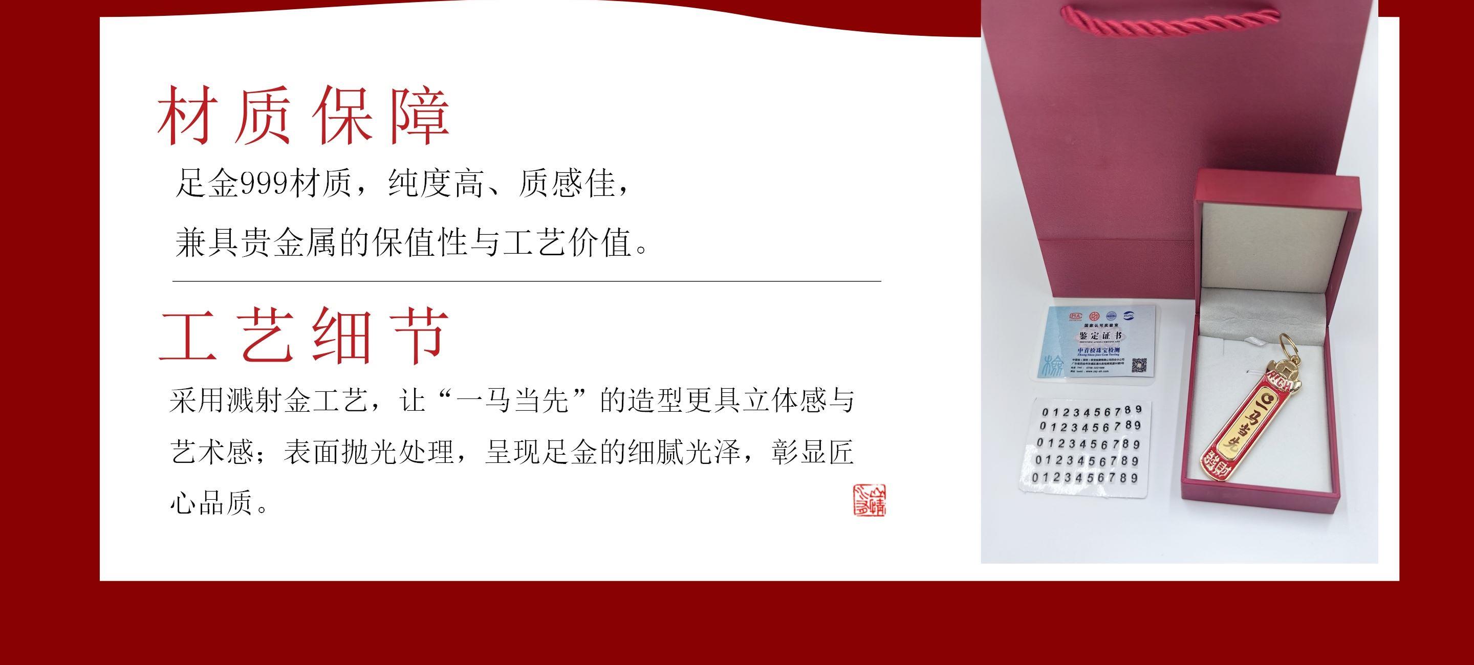 产品材质:足金999+合金 产品配置:钥匙扣+包装礼袋+证书 产品规格:65*18*4mm 高颜值实用好礼 足金999材质 经典设计:以马为灵感,黄金质感搭配正红底色,寓意事业腾飞、好运连连 实用珍藏:精致钥匙扣设计,日常随身携带,时刻闪耀匠心与祝福。 专属定制:背面支持手机号定制,专属标识不易丢失 赠礼自用皆宜。 红金配色喜庆大气,搭配精致钱币纹路,传递国人寿的诚挚祝福 无论是系于钥匙串随身携带,还是悬挂爱车作为停车牌,时刻守护您的顺遂平安,开启一整年的红火好运!