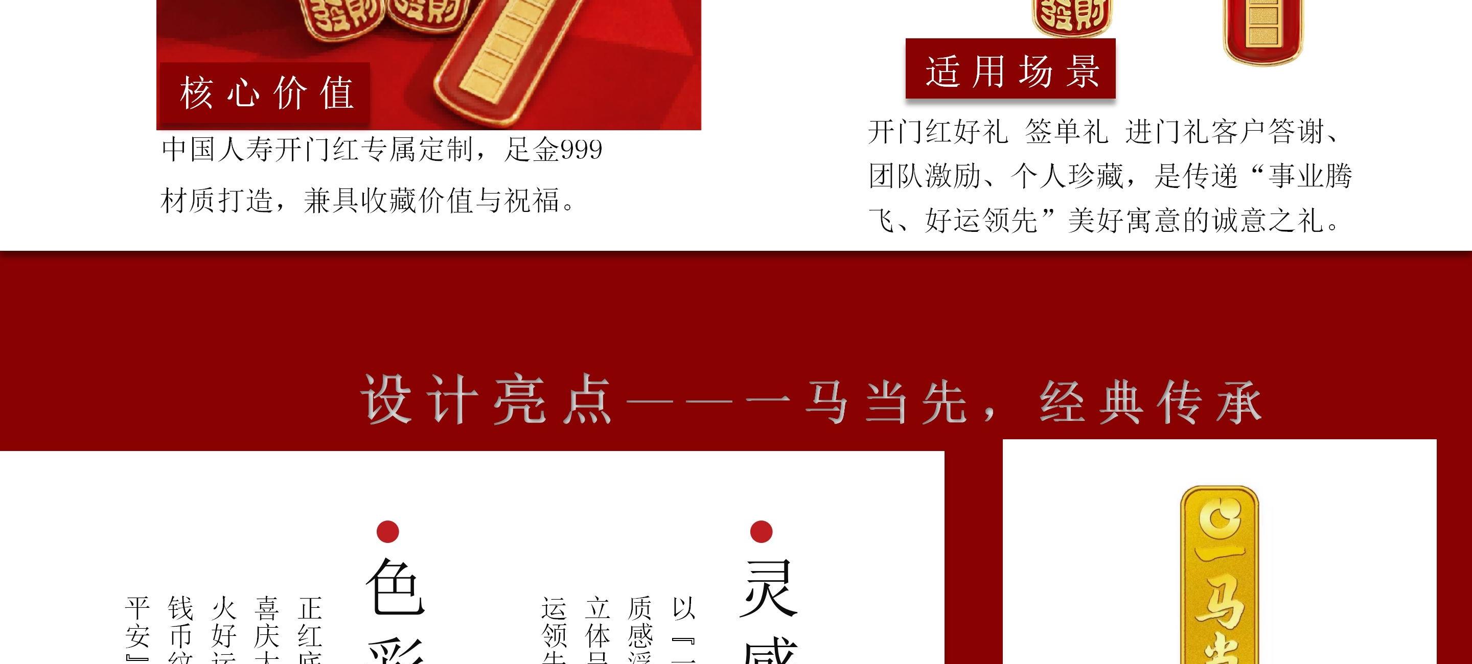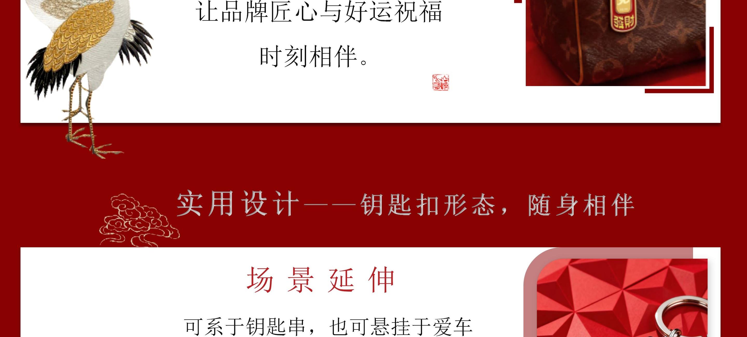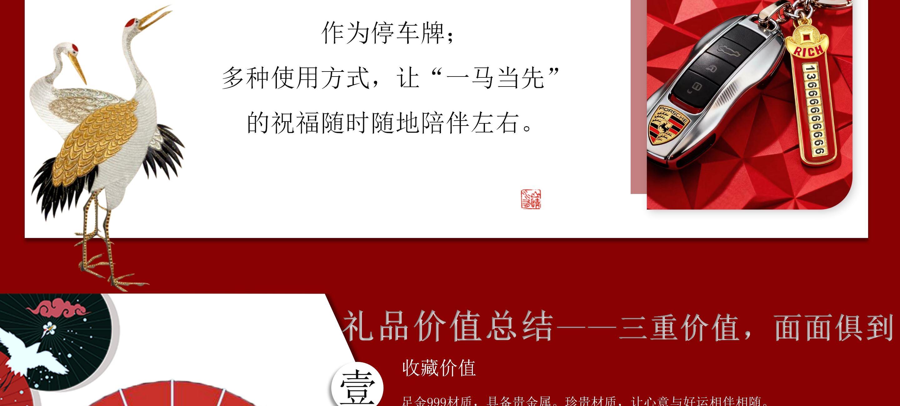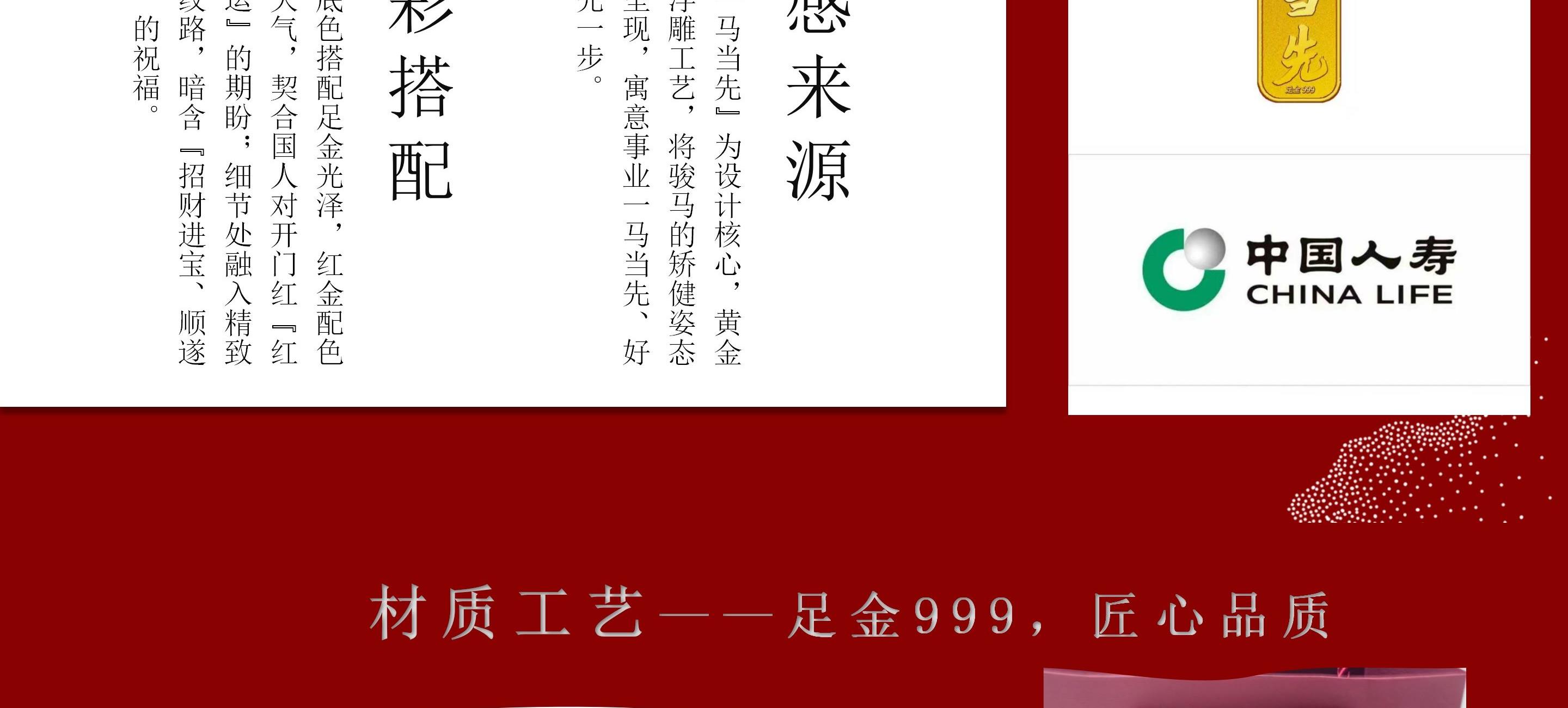 产品材质:足金999+合金 产品配置:钥匙扣+包装礼袋+证书 产品规格:65*18*4mm 高颜值实用好礼 足金999材质 经典设计:以马为灵感,黄金质感搭配正红底色,寓意事业腾飞、好运连连 实用珍藏:精致钥匙扣设计,日常随身携带,时刻闪耀匠心与祝福。 专属定制:背面支持手机号定制,专属标识不易丢失 赠礼自用皆宜。 红金配色喜庆大气,搭配精致钱币纹路,传递国人寿的诚挚祝福 无论是系于钥匙串随身携带,还是悬挂爱车作为停车牌,时刻守护您的顺遂平安,开启一整年的红火好运!