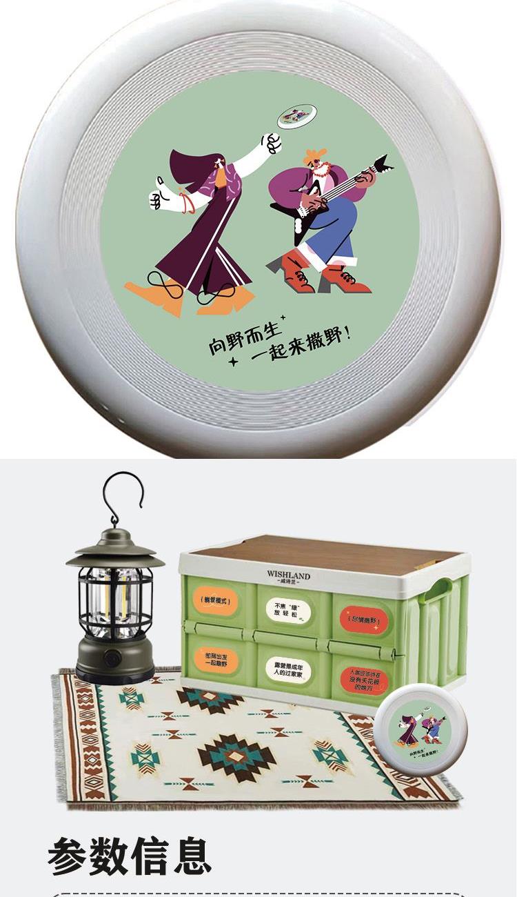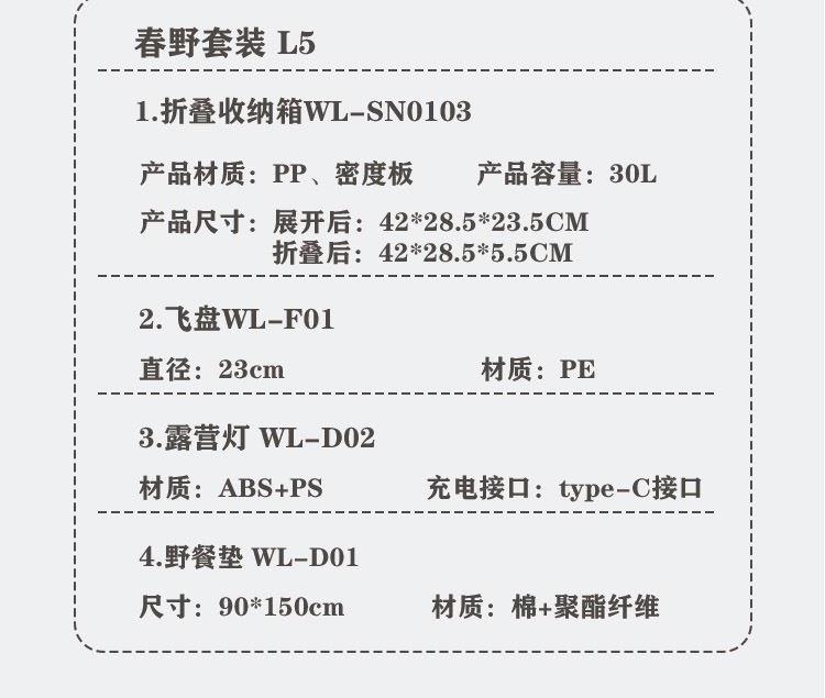 产品配置:折叠收纳箱* 1、飞盘* 1、露营灯*1、野餐垫* 1精美礼盒*1 产品规格: 1、折叠收纳箱WL-SN0103 产品材质:PP、密度板 产品容量:30L 产品尺寸:展开后:42*28.5*23.5CM 折叠后:42*28.5*5.5CM 2、飞盘 WL-F01 直径:24cm 材质:PE 3、露营灯 WL-D02 材质:ABS+PS 充电接口:type-C接口4、野餐垫 WL-D01 尺寸:90*150cm 材质:棉+聚酯纤维