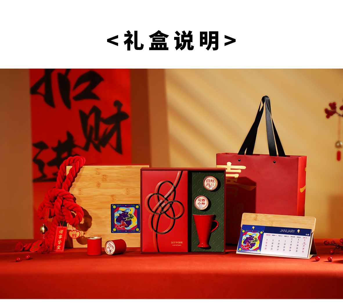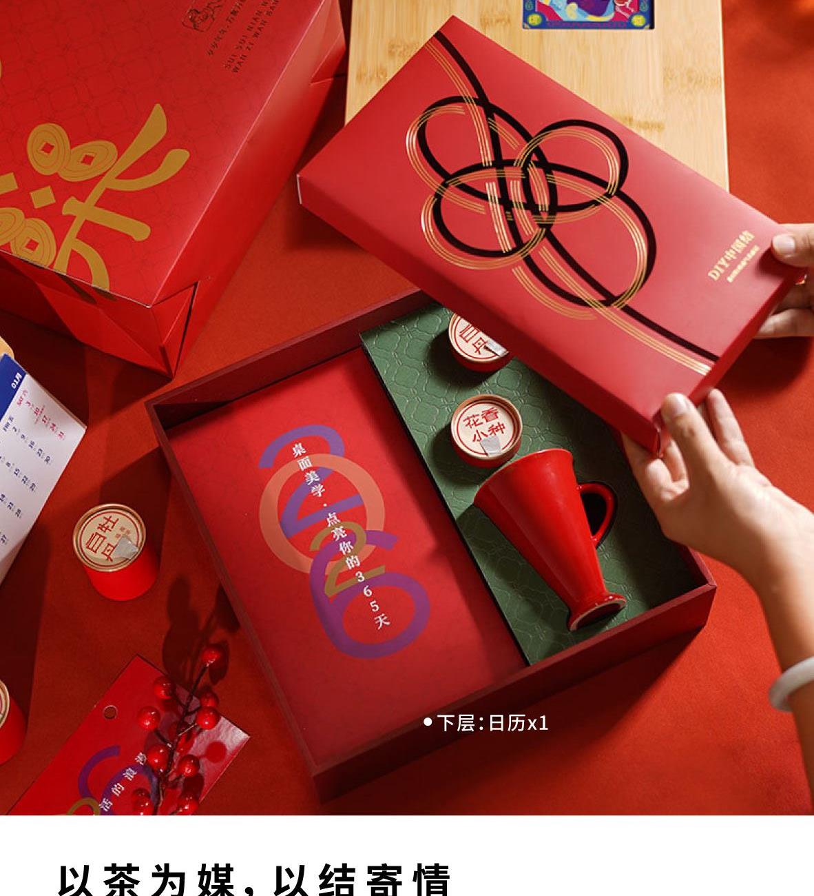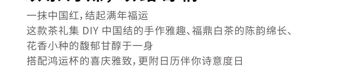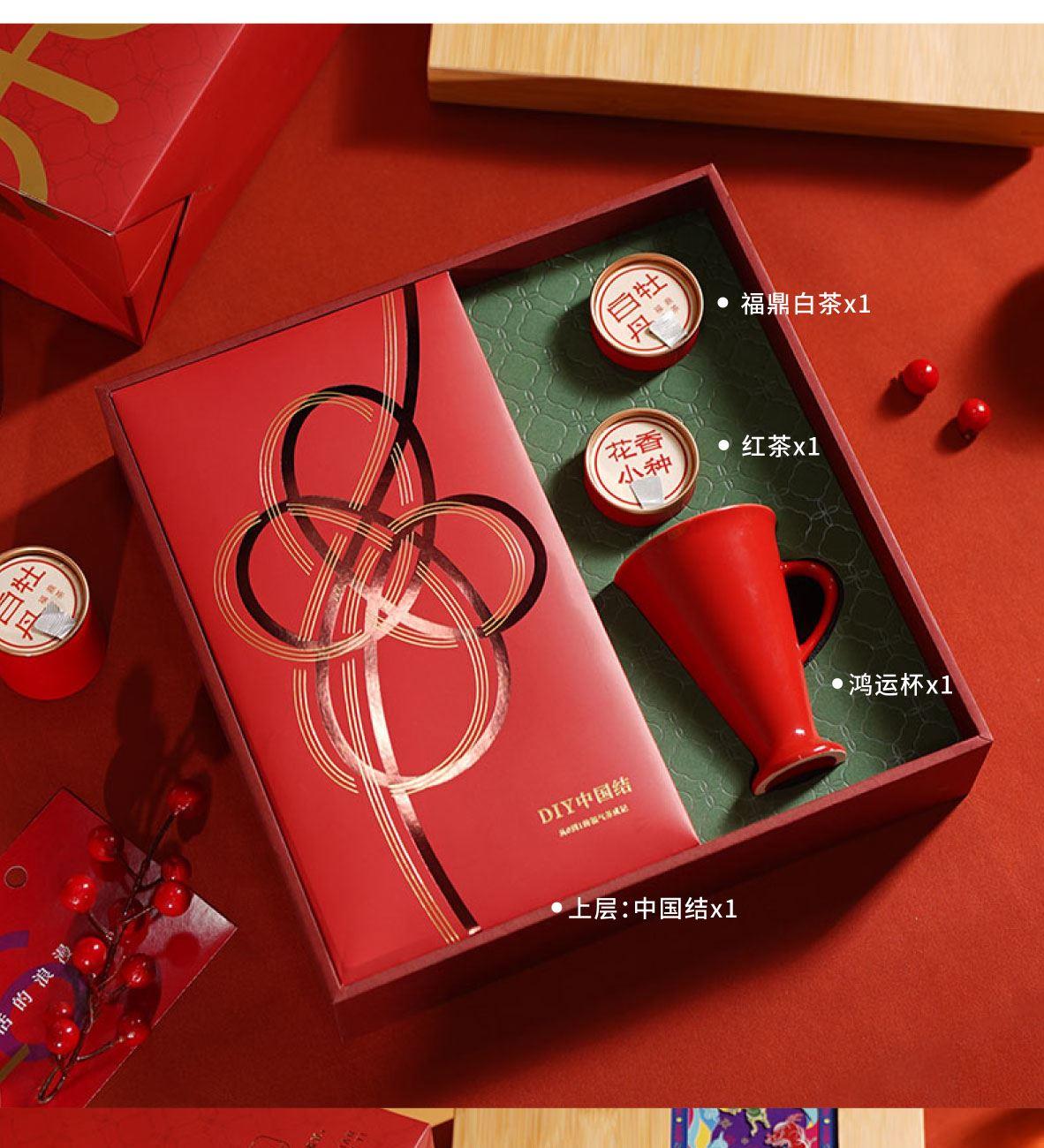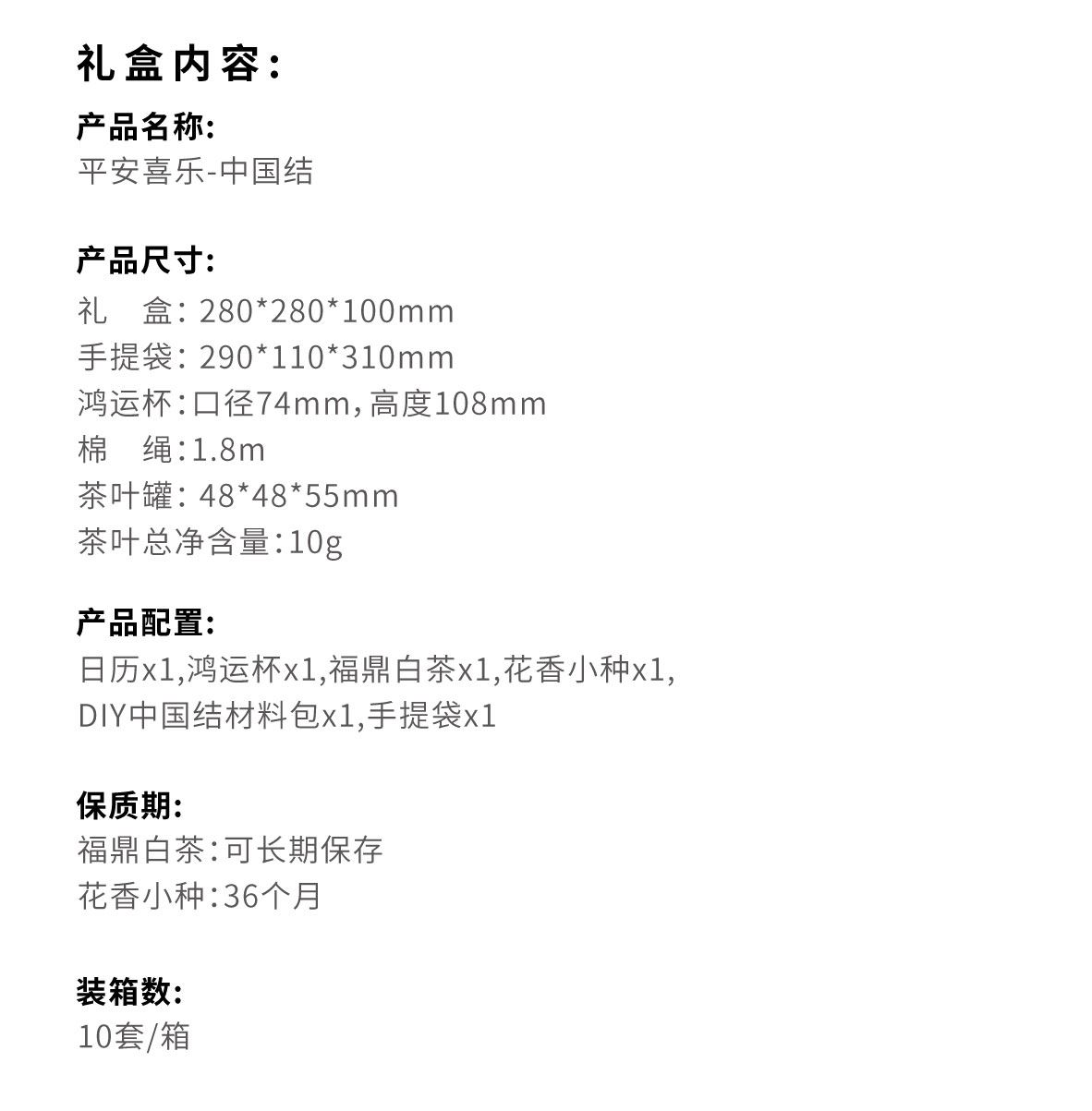产品尺寸: 礼盒:280*280*100mm 手提袋:290*110*310mm 鸿运杯:口径74mm,高度108mm 棉 绳:1.8m 茶叶罐:48*48*55mm 茶叶总净含量:10g 产品配置: 日历x1,鸿运杯x1, 福鼎白茶x1,花香小种x1, DIY中国结材料包x1,手提袋x1