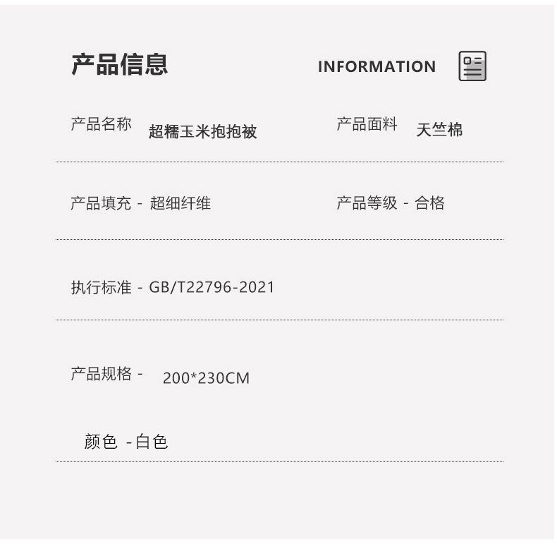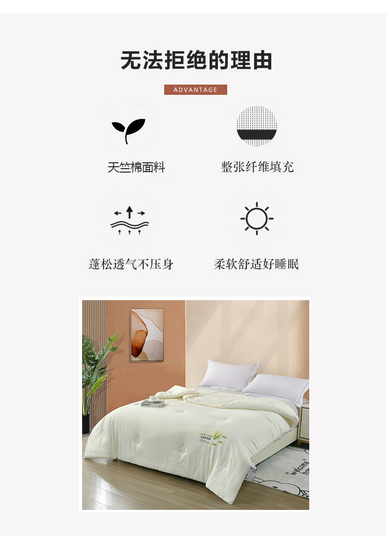 规格:200*230cm 面料:天竺棉 填充:超细纤维 重量: 2400g 执行标准:GB/T22796-2021 安全类别:GB18401-2010 B类 1.精选天竺棉面料,柔软亲肤,软糯爱呼吸,呵护您和您家人的健康 2.超糯玉米纤维由于织法不同,让其面料比普通面料更厚实紧密,呵护敏感肌肤 3.整张羽丝棉填充,不易板结,纤维细腻,舒适透气蓬松柔软,不易板结。