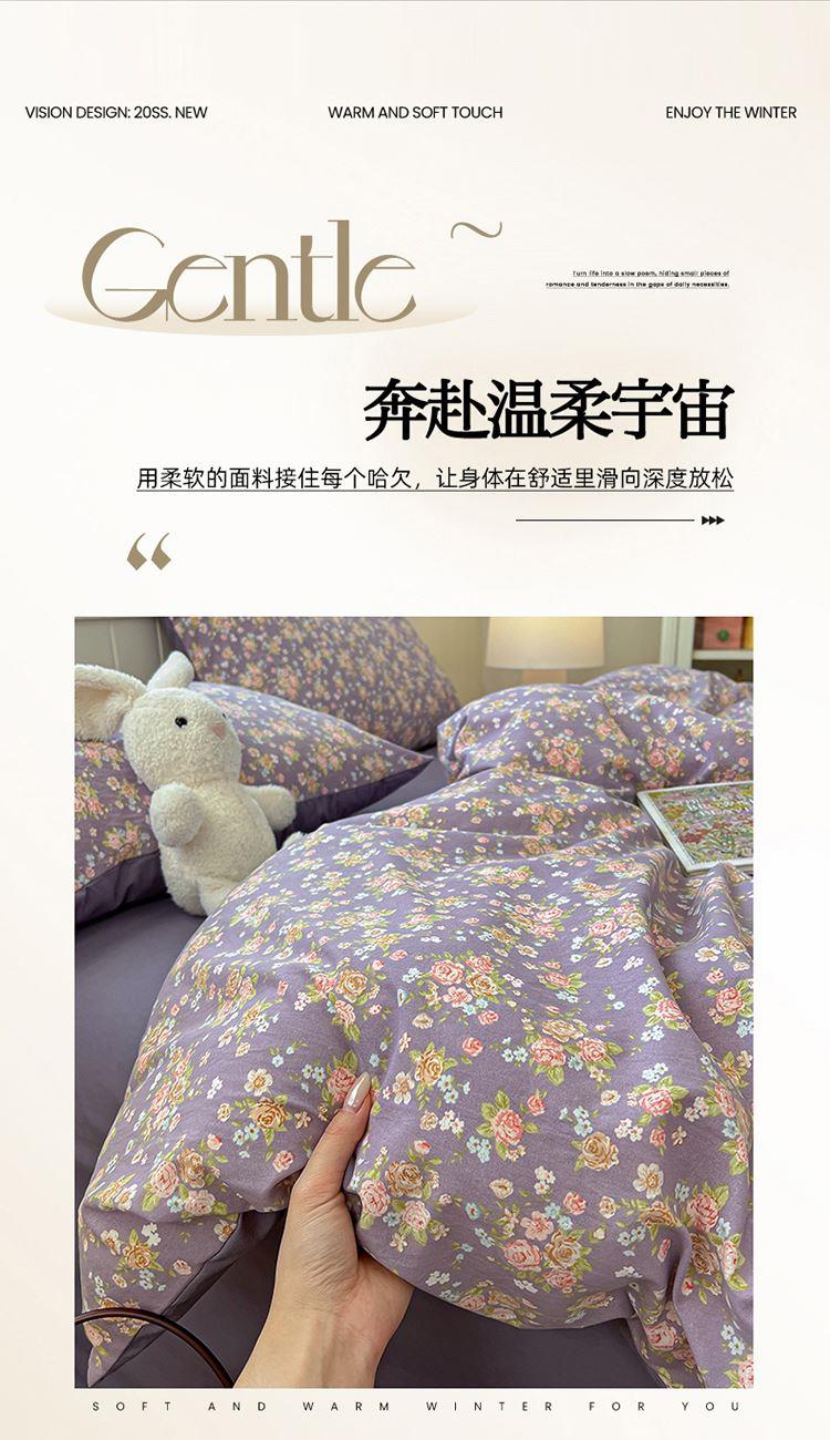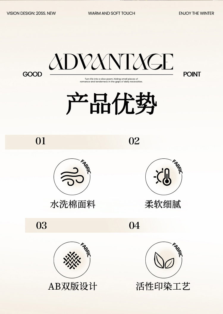 1:古法水洗棉四件套系列 臻享云柔梦境 2:水洗棉面料温柔软糯触感 水洗棉面料 舒适柔软 莹润宠溺倍享宠爱 带来甜美舒适的睡眠享受 3:A面印花搭配B面纯色设计,视觉层次感强,优雅精致大气,久看不腻高颜值,卧室更有品质感。 尺寸:被套200*230cm 床单:230*250cm 枕套:48*74cm*2 包装:彩盒