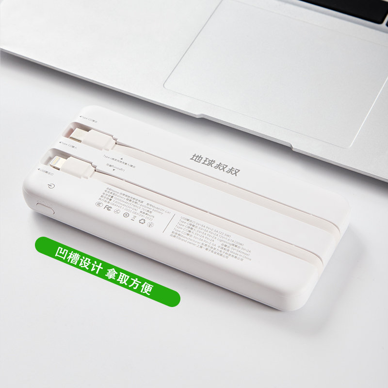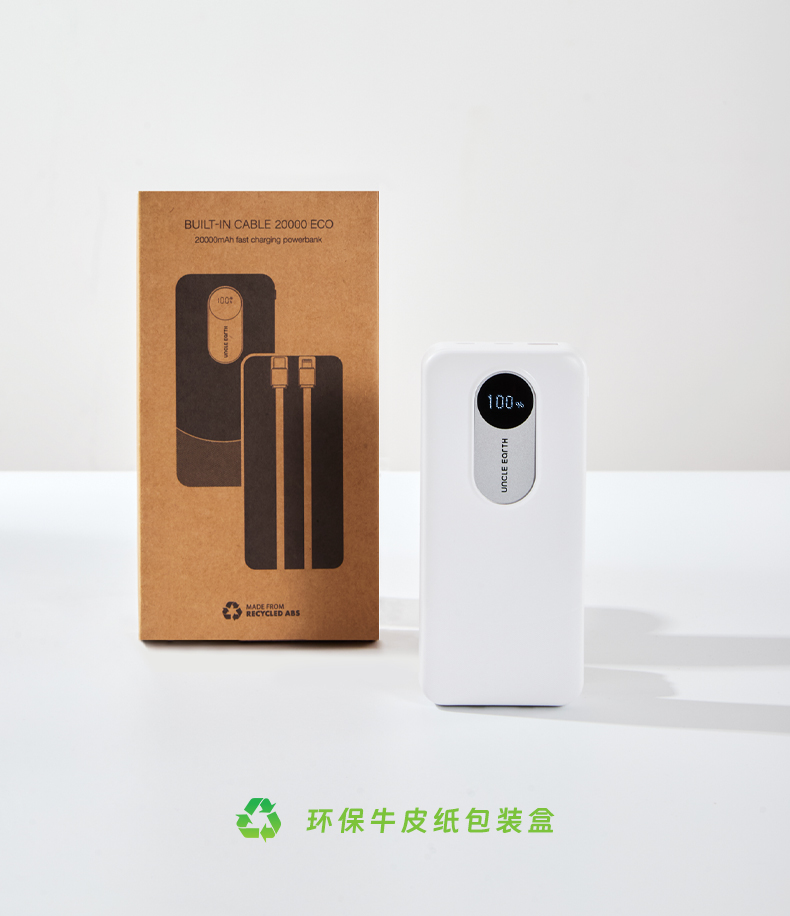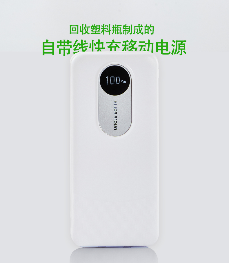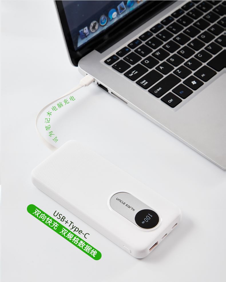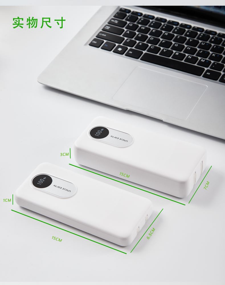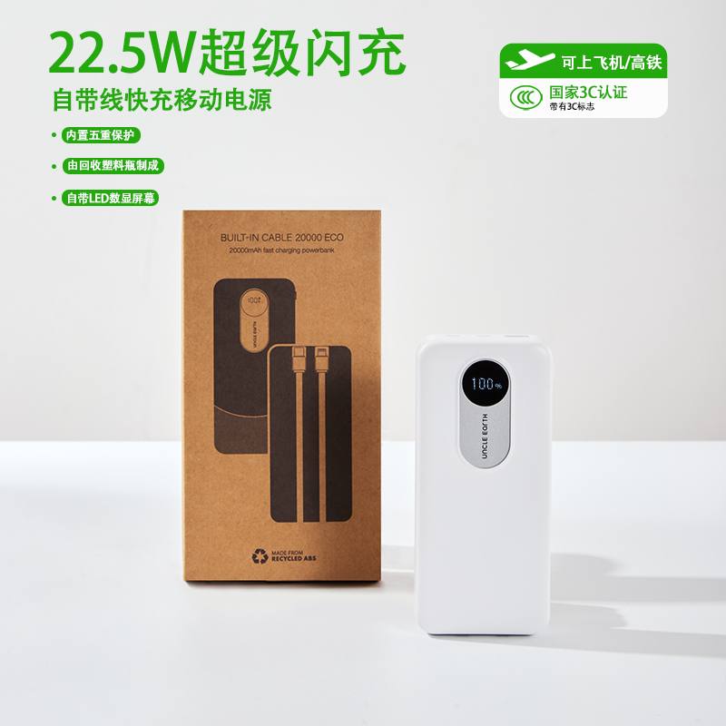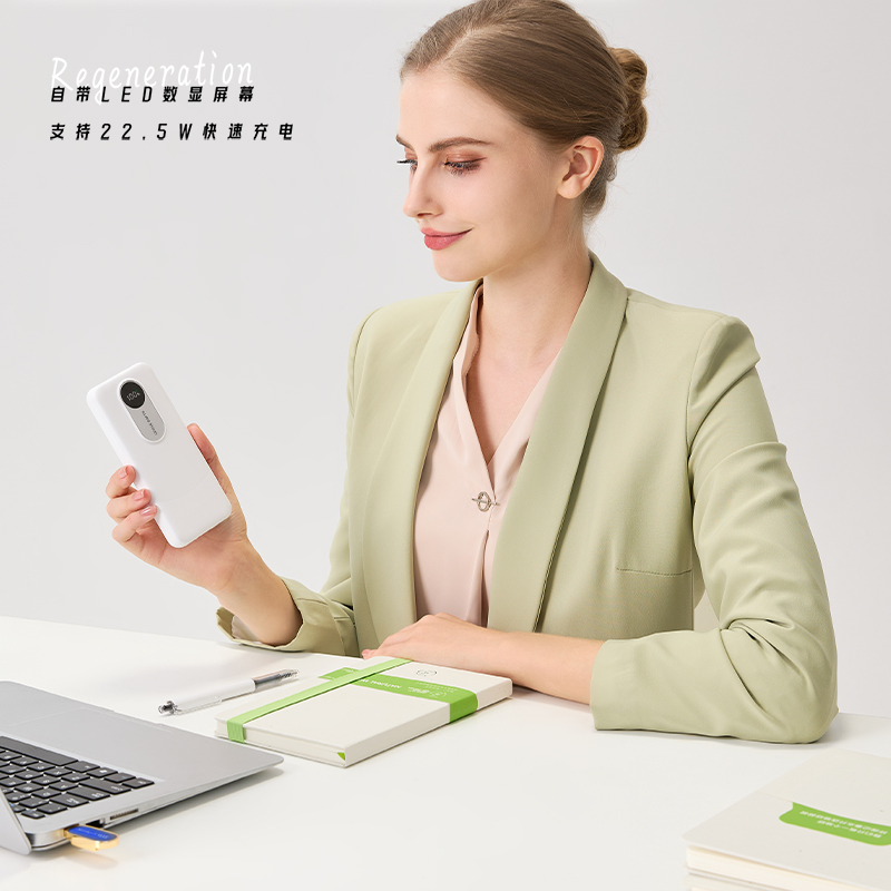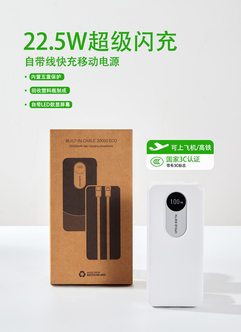 1.由回收ABS塑料制成,两种型号:10000毫安/20000毫安大容量电芯,兼顾环保理念与耐用质感;机身自带LED数显屏幕,剩余电量实时清晰可见,支持22. 5W快速充电与Type-C双向快充,并且配备Lightning和Type- -C双规格数据线,可为笔记本电脑、手机等设备提供高效充电,满足移动办公需求;内置过流、过载、过放电、过热及短路五重保护机制,可规避异常情况,为使用保驾护航。 2.符合3C认证标准。 3.产品尺寸:15 x 7 x 3厘米