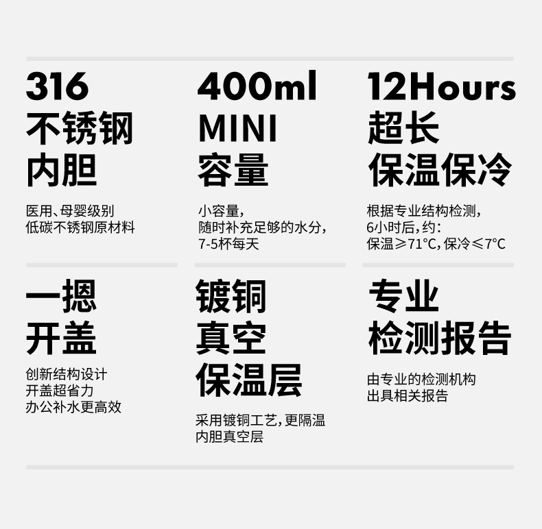 材质:316L不锈钢、硅胶、PP 颜色:磨砂灰 包装:彩盒 (1)无螺纹设计 (2)一键开盖 (3)车载可用设计 (4)潮酷