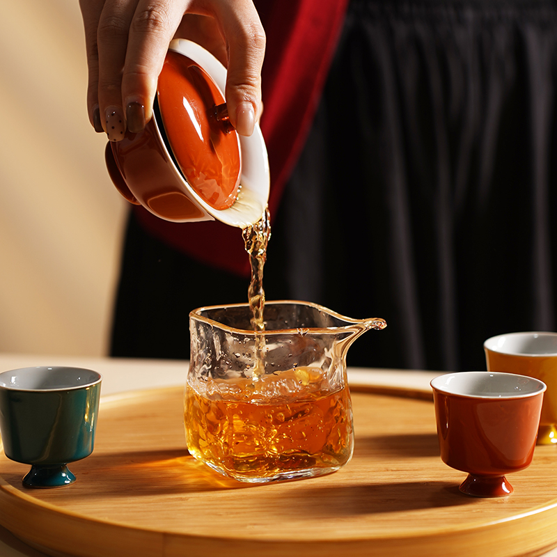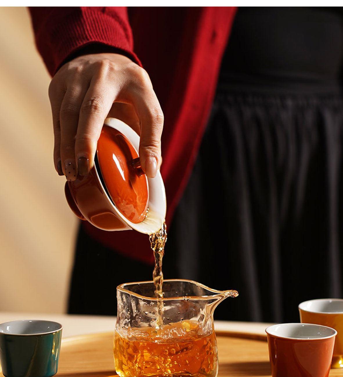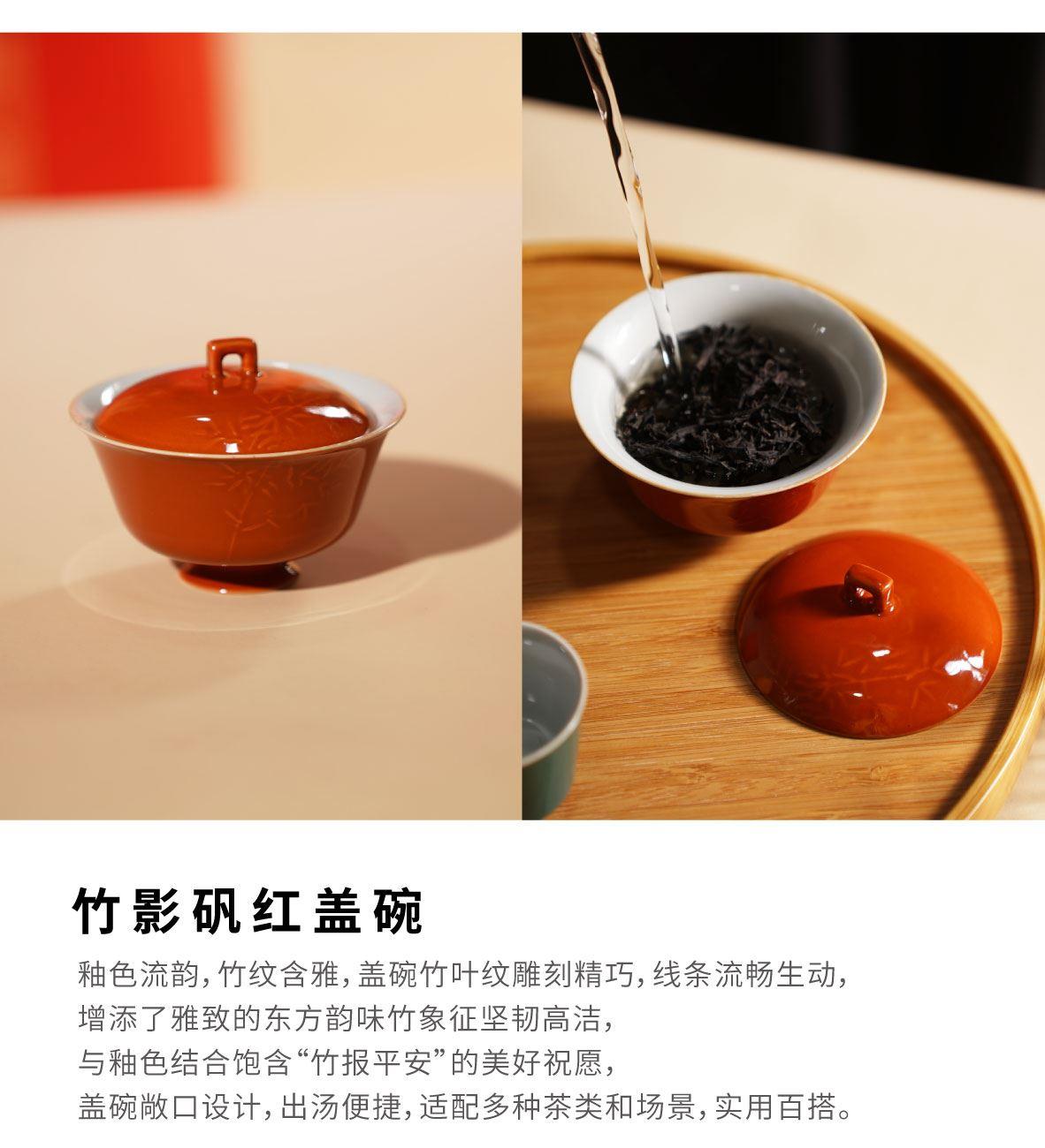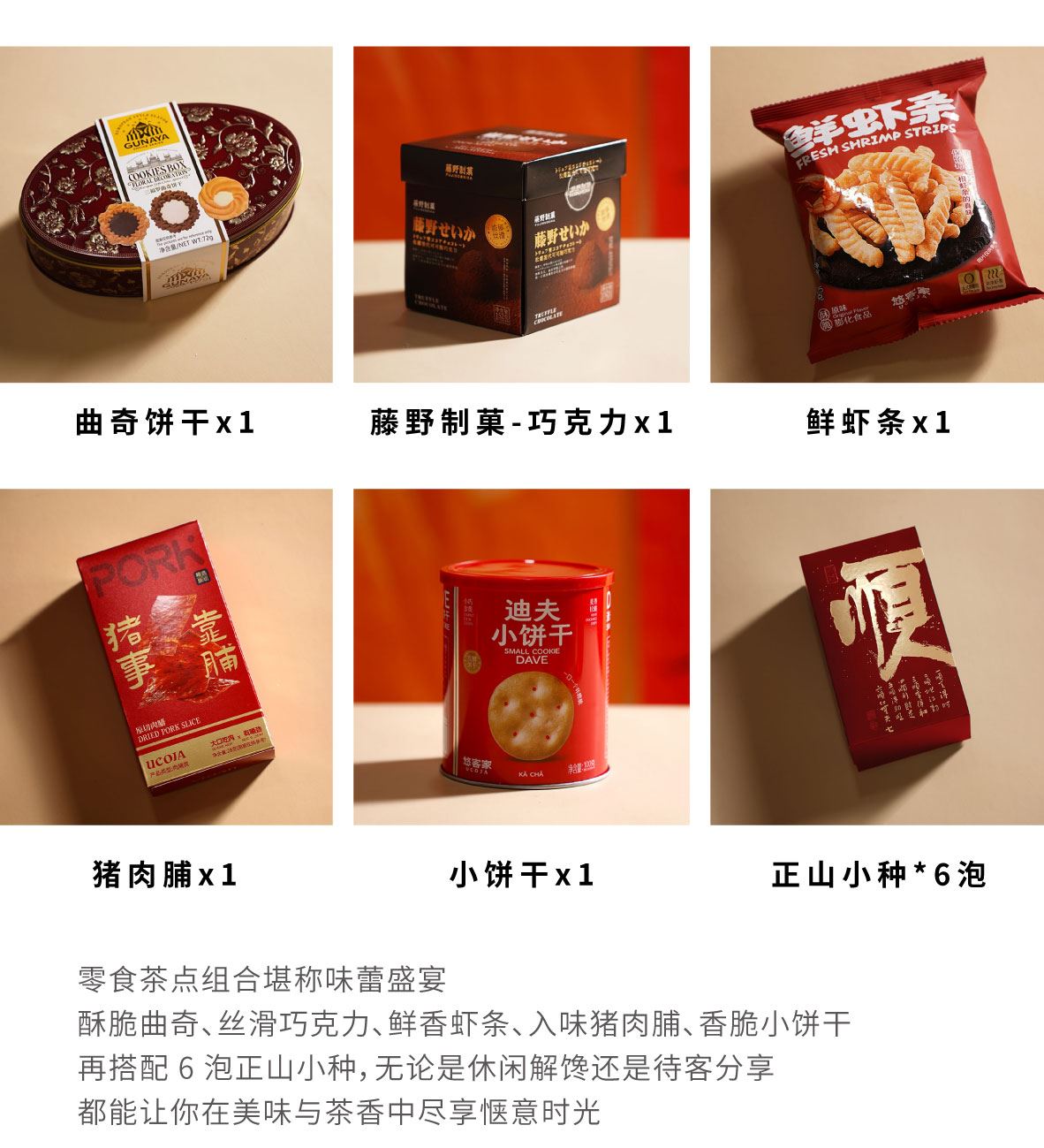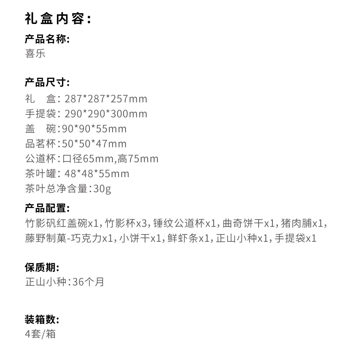 产品尺寸: 礼盒: 287*287*257mm 手提袋: 290*290*300mm 盖碗:90*90*55mm 品茗杯:50*50*47mm 公道杯:口径65mm,高75mm 茶叶罐: 48*48*55mm 茶叶总净含量:30g 产品配置: 竹影矾红盖碗x1,竹影杯x3, 锤纹公道杯x1,曲奇饼干x1,猪肉脯x1, 藤野制菓-巧克力x1,小饼干x1, 鲜虾条x1,正山小种x1,手提袋x1