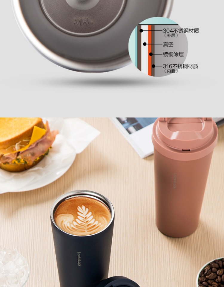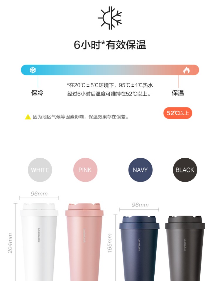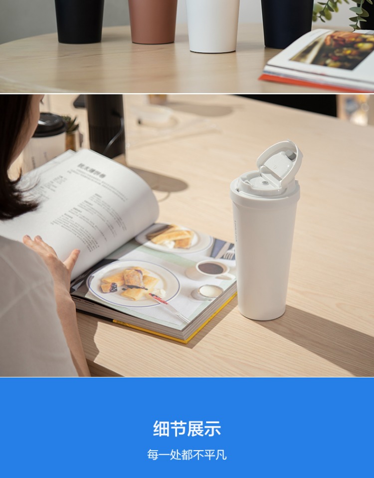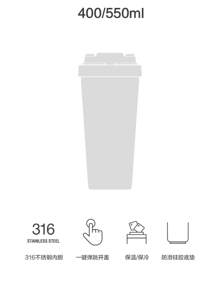 产品特点: 杯身内胆-316L不锈钢,杯身外壳-304不锈钢 盖子-聚丙烯与乙烯的聚合物(使用温度:-20℃~120℃)密封圈-食品级硅橡胶 保温效能 在20°C土5C环境下,95C1C热水经过6小时后温度可维持在52C以上。 容量:400