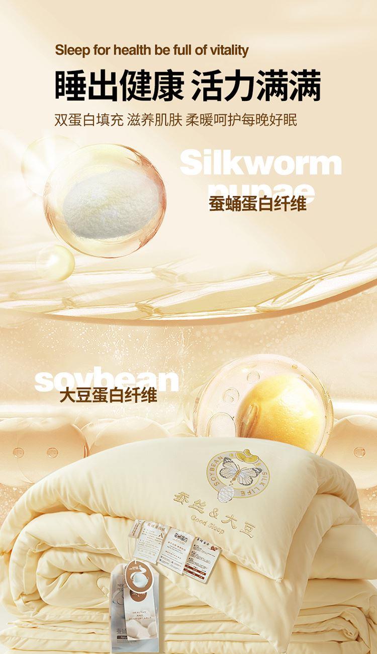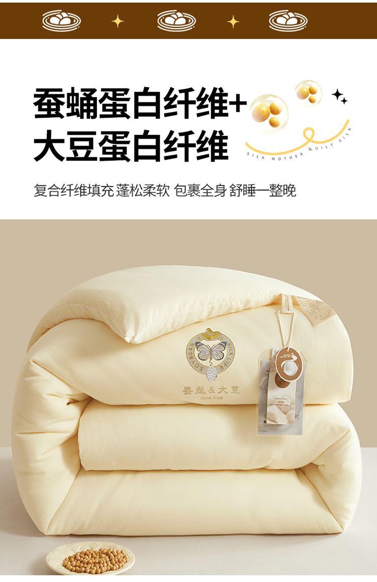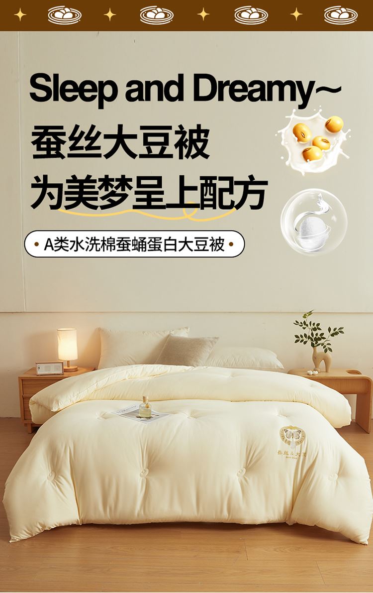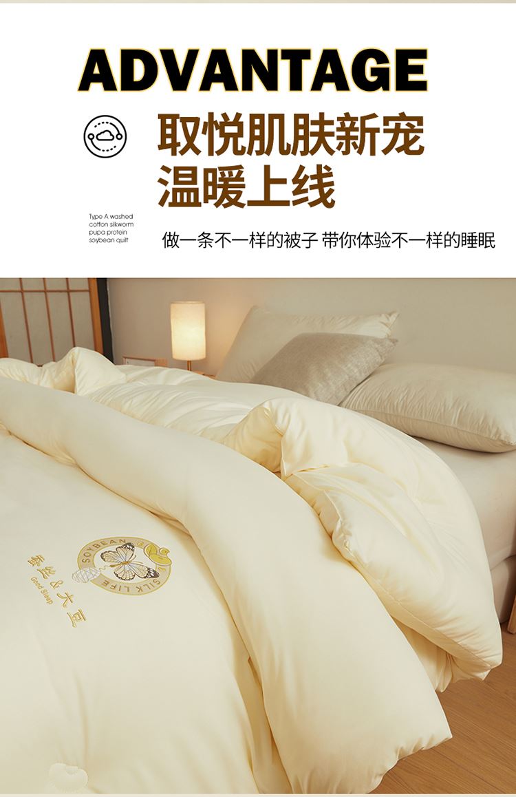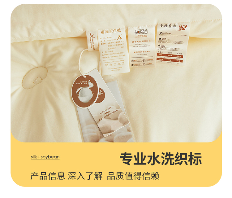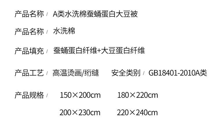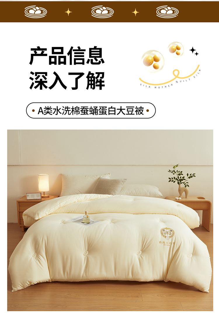 1:蚕丝大豆被为美梦呈上配方 水洗棉蚕蛹蛋白大豆被 2:睡出健康 活力满满 双蛋白填充 滋养肌肤 柔暖呵护每晚好眠 3:水洗棉面料细腻云柔触感 质感软糯细腻 面料经过水洗工艺处理 免打理柔软柔和 尺寸:200x230cm 重量:3kg 包装:礼盒/礼袋