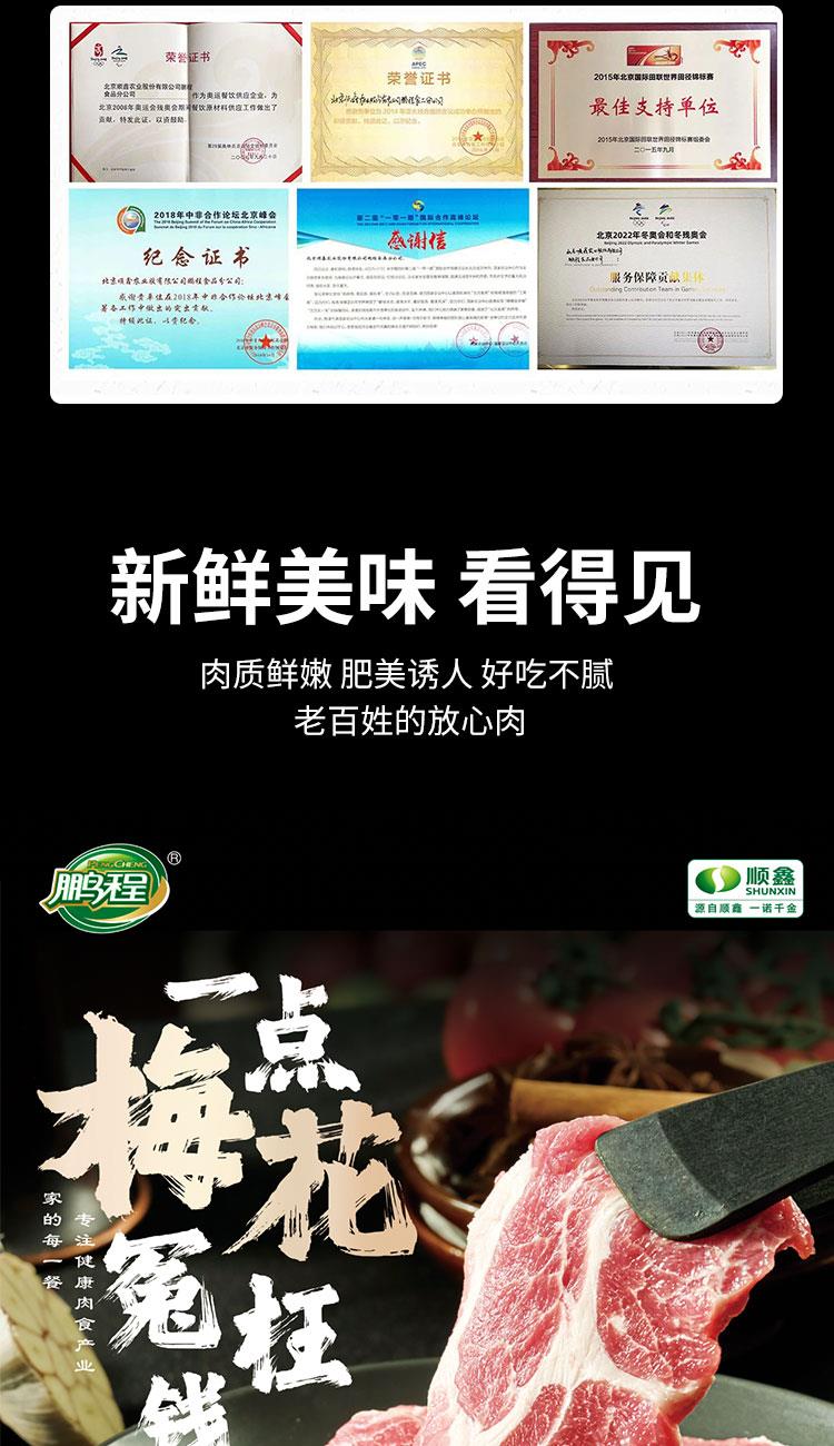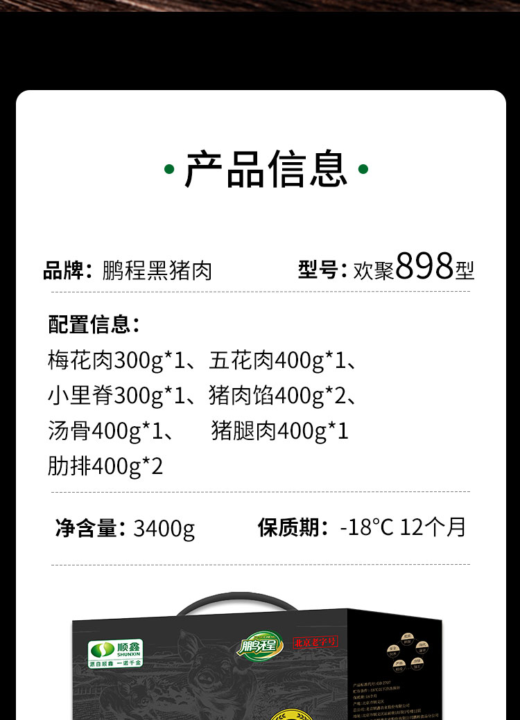 鹏程黑猪肉具有肉质紧实、脂肪含量低、口感细腻等特点,且注重无抗养殖和透明供应链管理 肉色鲜红,脂肪呈乳白色,具有明显大理石花纹,肉质细嫩有弹性 养殖周期12个月以上,采用中草药无抗饲料,全程透明可追溯 供应链覆盖种猪繁育、生猪养殖、屠宰加工至仓储物流,确保品质与安全 塞牧勒黑猪肉欢聚礼盒898型 梅花肉300g 五花肉400g 小里脊 300g 猪肉馅400g*2 汤骨400g 猪腿肉400g 肋排400g*2