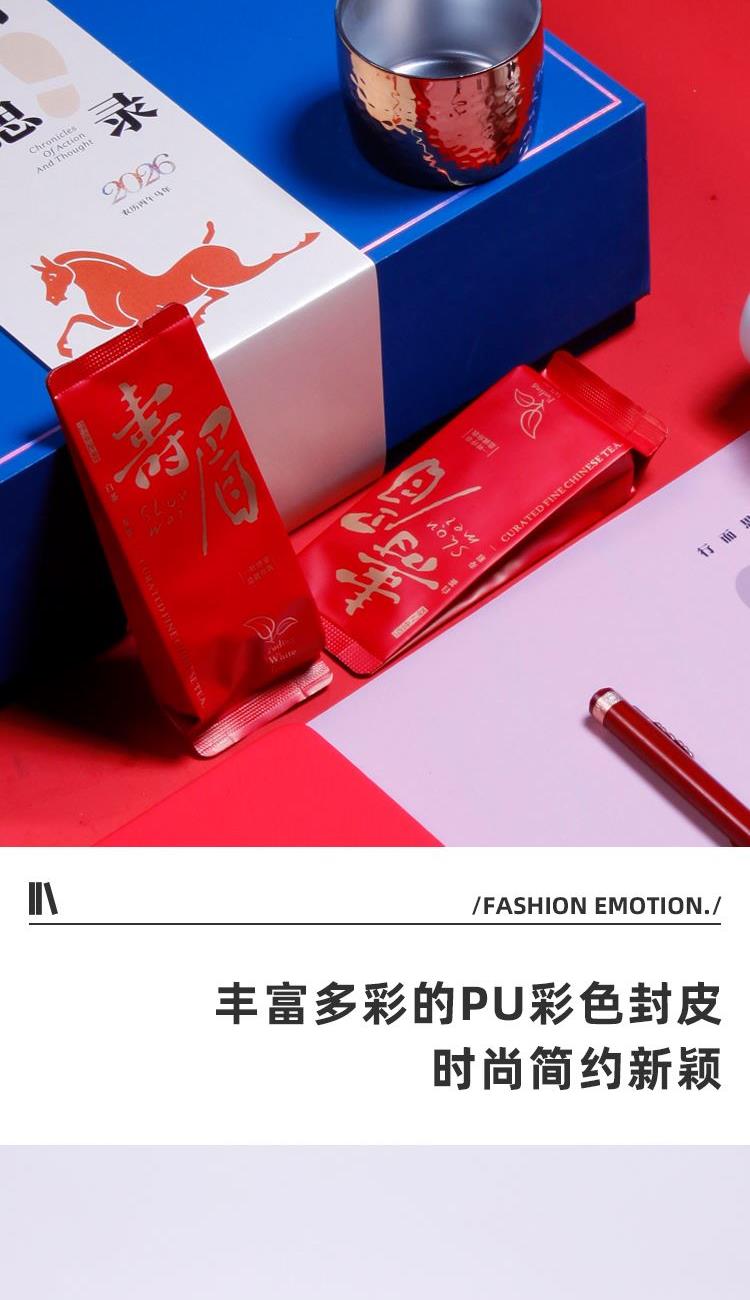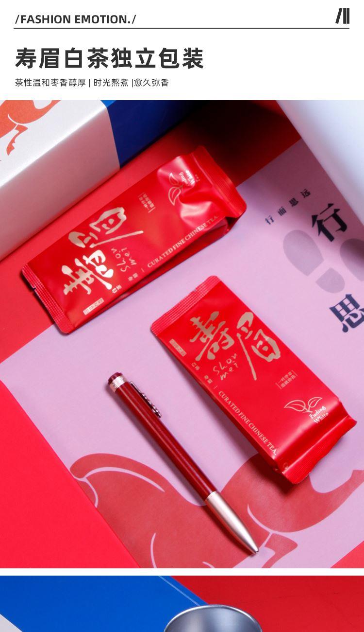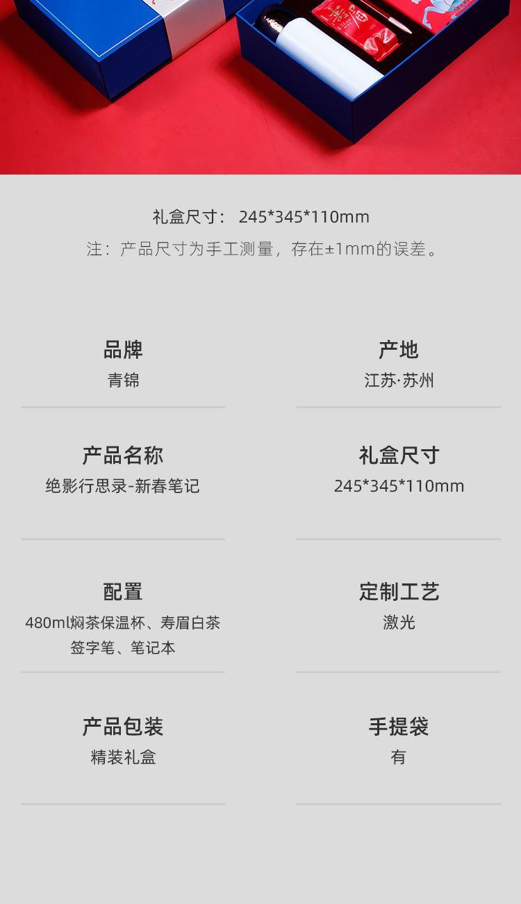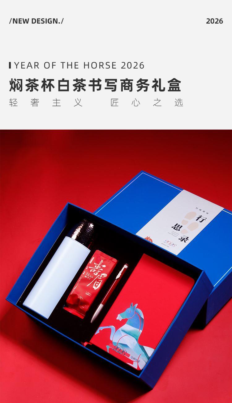 焖茶保温杯480ML*1 颜色:橘橙色/黑色/白色/墨绿色 锦云签字笔*1 颜色 红花梨木色 绝影笔记本*1 颜色红色/白色 寿眉白茶*2包 精装礼盒手提袋*1 免费定制logo
