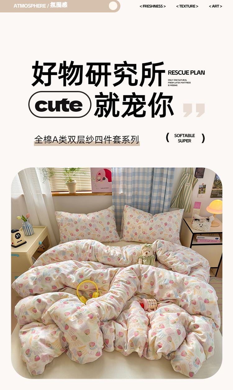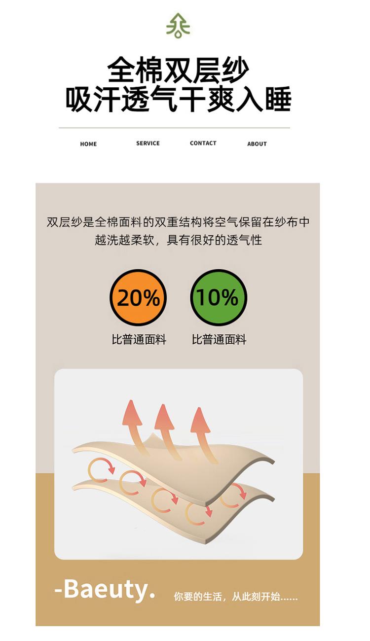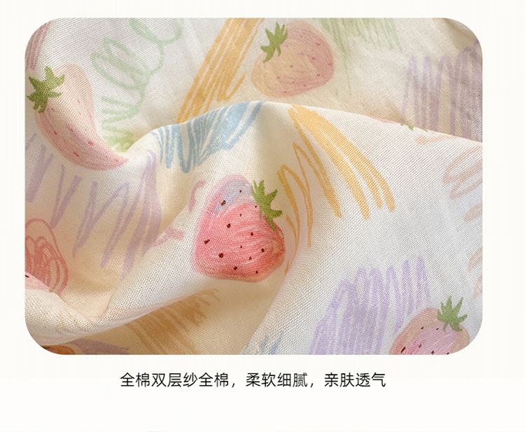 1:全棉双层纱面料绵柔触感可裸睡 【高品质棉纱经特殊工艺,亲肤透气柔软细腻】 2:双层纱是全棉面料的双重结构将空气保留在纱布中越洗越柔软,具有很好的透气性 3:一缕阳光一朵棉 日照3000+小时新疆棉,洁白长纤维更柔软 好地方,种出来的棉花当然更好 尺寸:被套200*230cm*1 床单:230*245cm*1 枕套:48*74cm*2 包装:彩盒