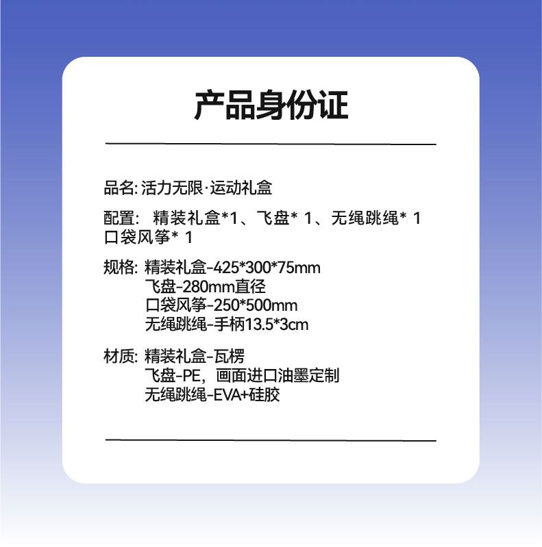 礼盒配置:飞盘* 1、无绳跳绳* 1 口袋风筝* 1 产品规格:飞盘-27.5cm直径 无绳跳绳-手柄13.5*3cm 口袋风筝-250*500mm 礼盒尺寸:425cm*300*60mm