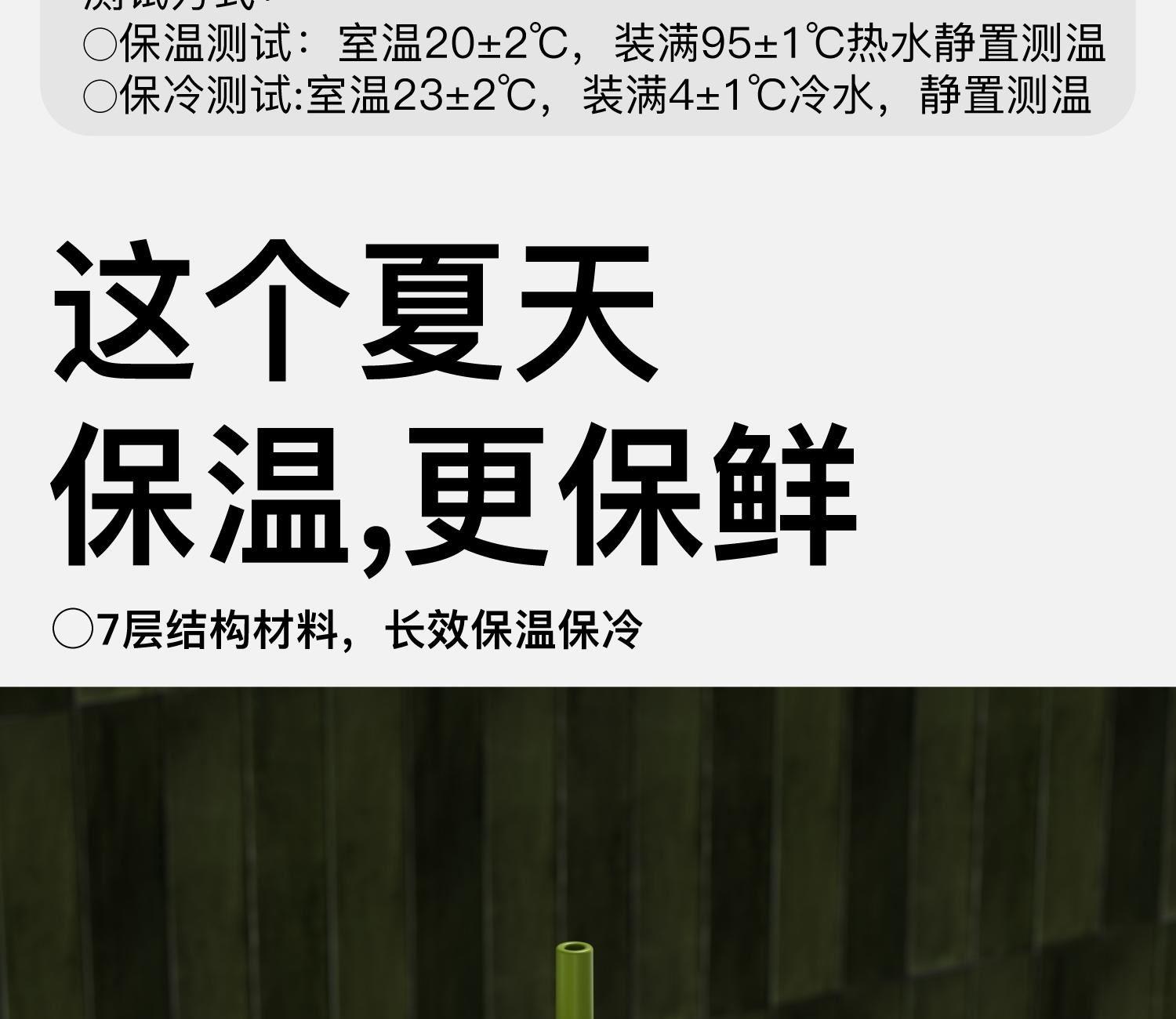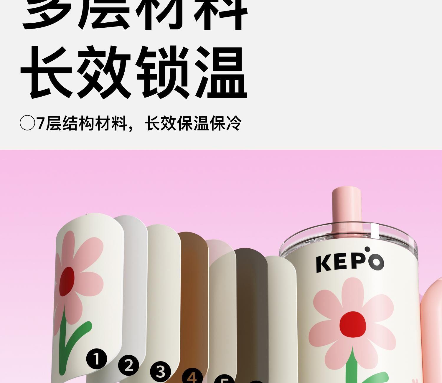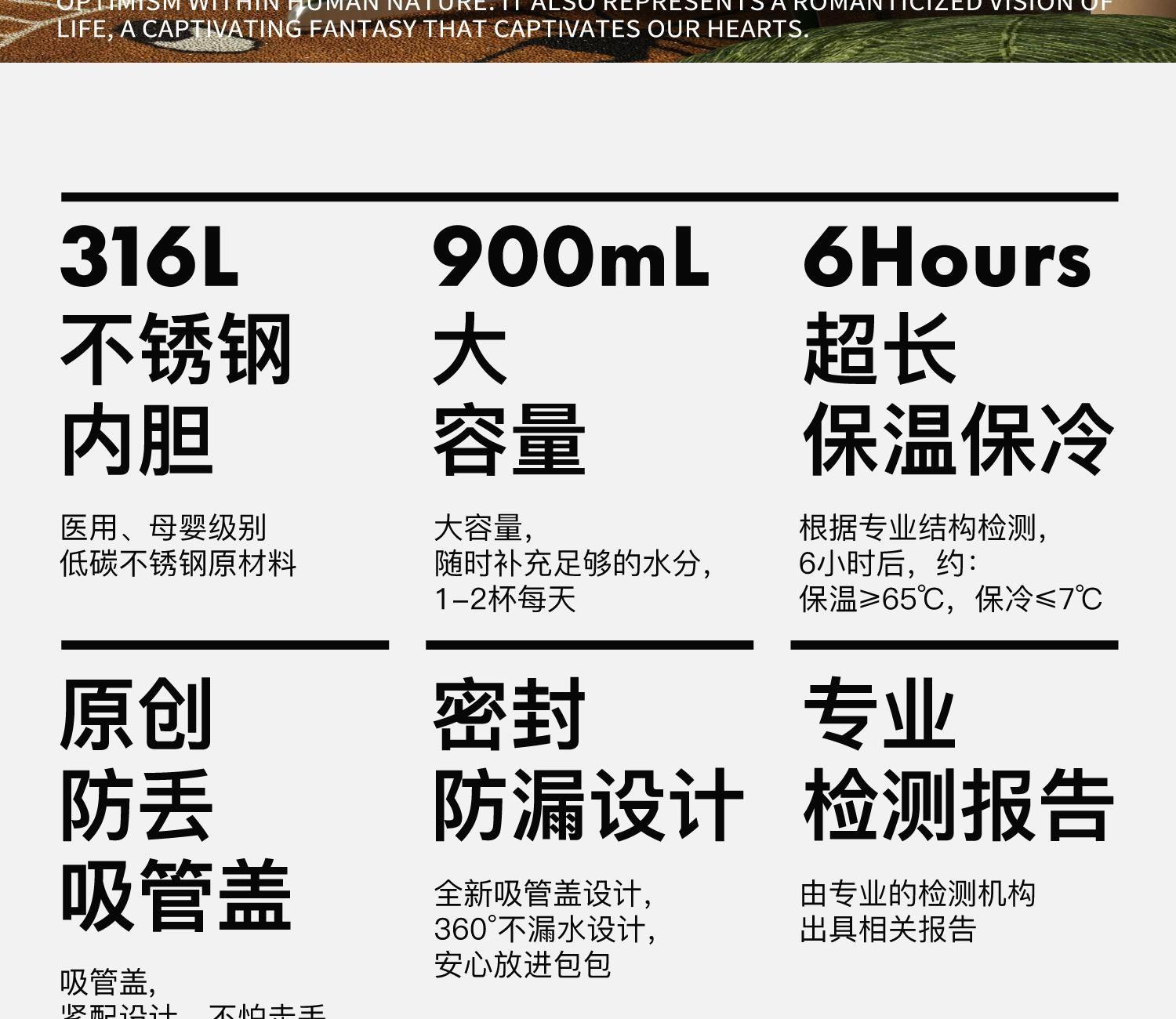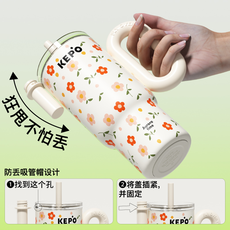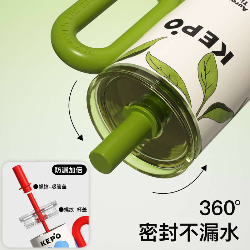 材质:316L不锈钢、硅胶、Tritan 颜色:浮春、花会开、青山露白、慵懒夏日 包装:彩盒 (1)双重防漏,安心放在包包里 (2)大容量,满足一天的饮水量 (3)车载可用设计 (4)圆润把手,便携外带,握持舒适 (5)长效保温、保冷(12H)