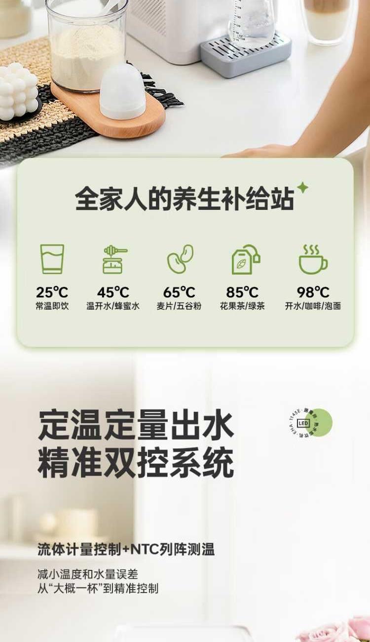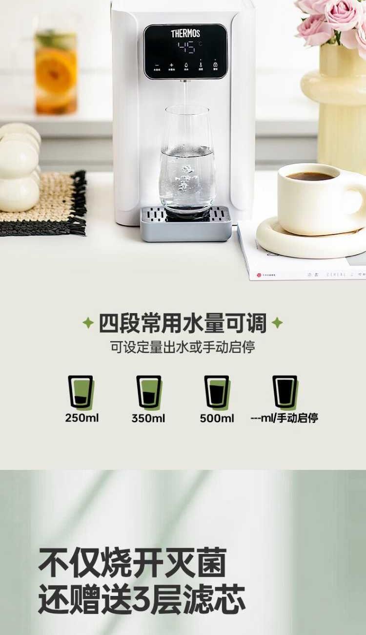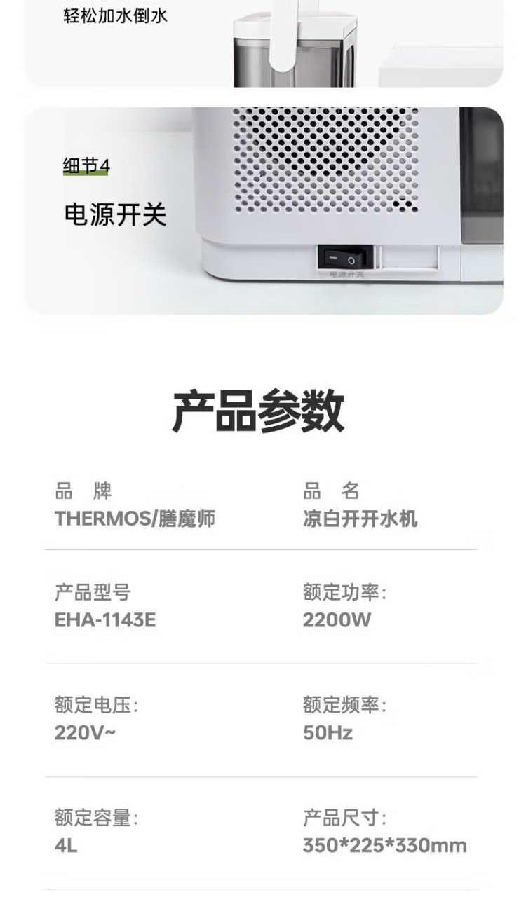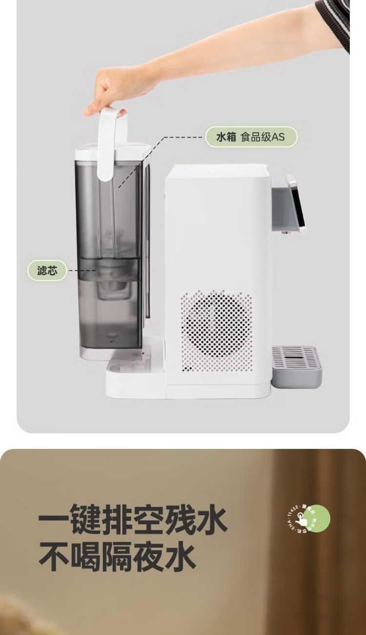 产品功率:2200W 容量:4L 操作方式 : 触屏控制 水箱 :食品级AS 五档水温:常温(水箱水直出)、45℃、65℃、85℃、98℃ 四档水量:250mL、350mL、500mL、连续(---)mL 建议水源:矿泉水、纯净水、蒸馏水 产品净重:3.5kg 毛重:4.2kg 产品尺寸:326*210*322 mm 包装尺寸:372*273*385mm 配置清单:主机,沥水盘,水箱,滤芯*1,电源线,说明书