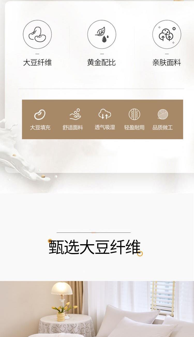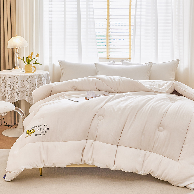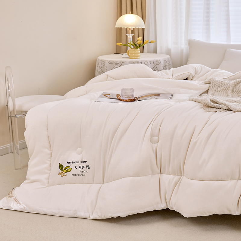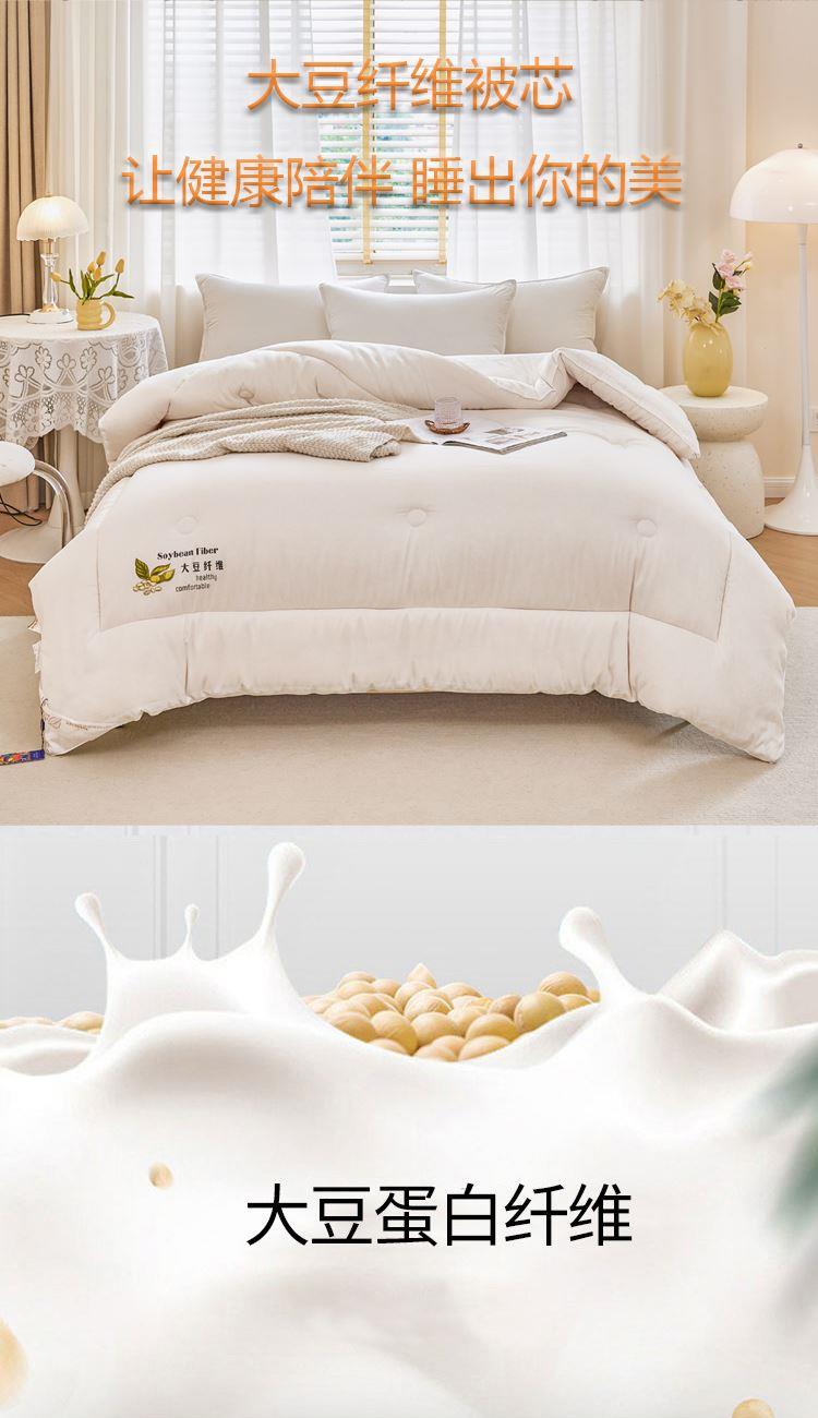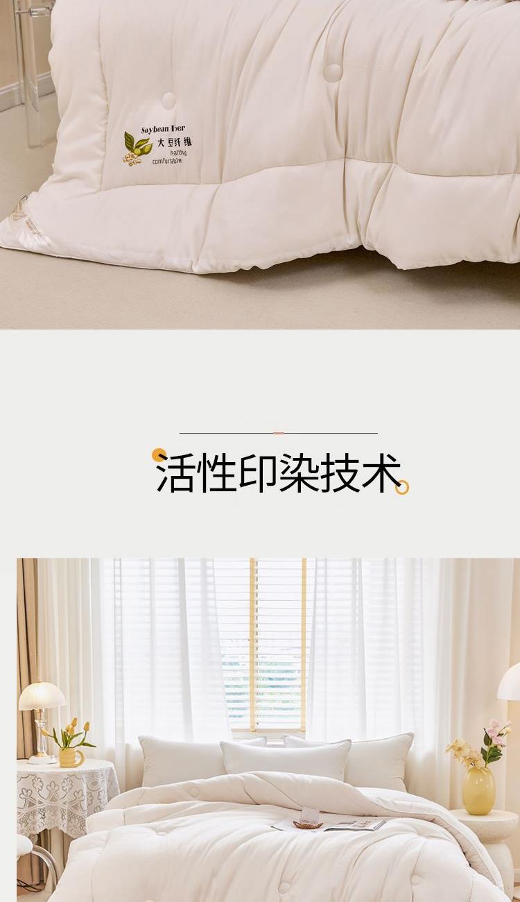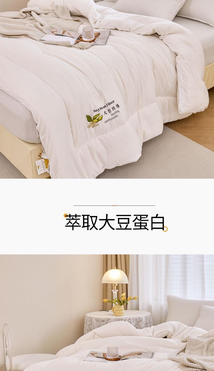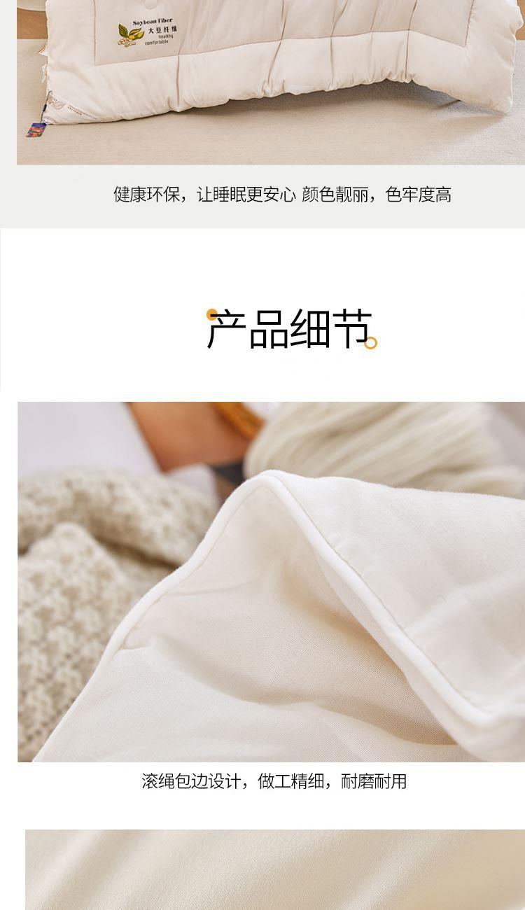 花色:白色 规格:200*230cm 面料:磨毛水洗棉 填充物:20%大豆纤维+80%聚酯纤维 重量:2500g 包装方式:无纺布袋 1、大豆纤维主要由大豆蛋白质组成,吸汗透气,手感细腻软糯,同时富含多种氨基酸,被誉为新世纪的健康舒适纤维” 2、大豆纤维被的特点:蓬松,不板结,大豆蛋白纤维填充,具有羊绒般柔软手感,棉的保暖性和蚕丝般的贴肤性。