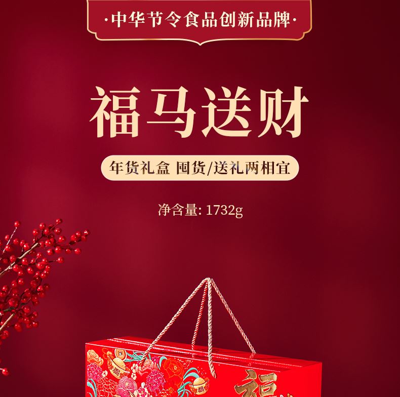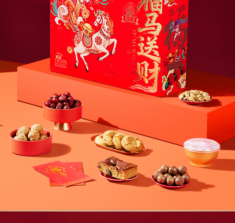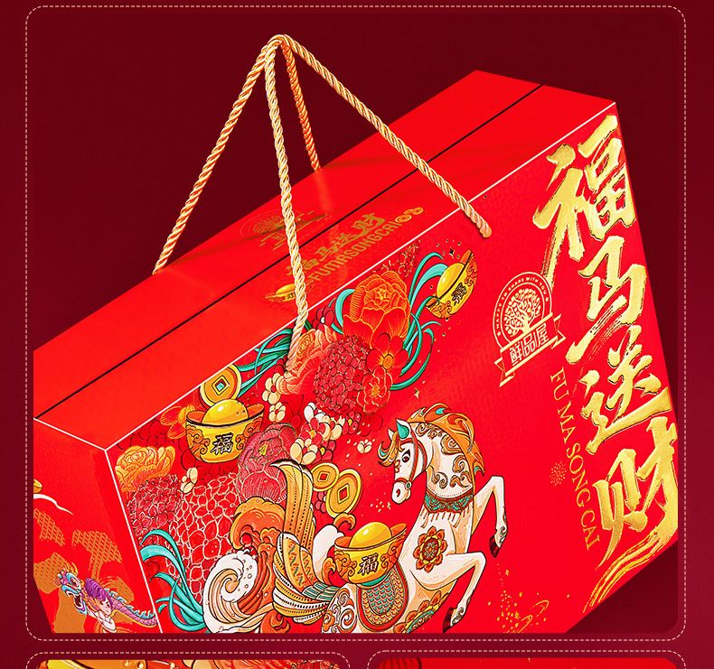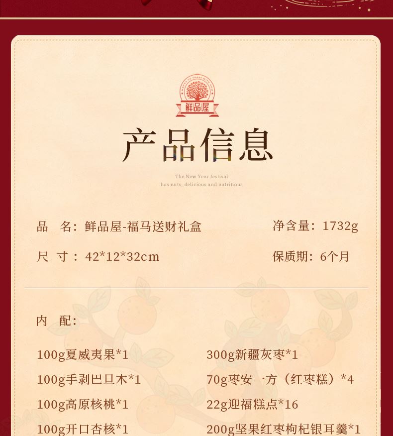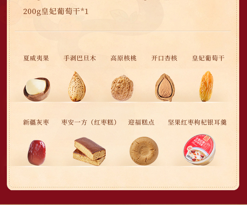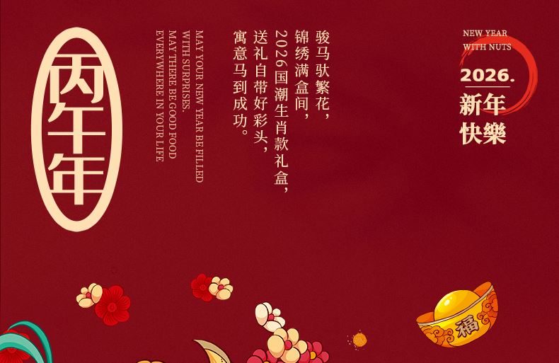 100g夏威夷果*1 100g手剥巴旦木*1 100g高原核桃*1 100g开口杏核*1 200g皇妃葡萄干*1 300g新疆灰枣*1 70g枣安一方(红枣糕)*4 22g迎福糕点*16 200g坚果红枣枸杞银耳羹*1 骏马驮繁花,锦绣满盒间,2026国潮生肖款礼盒,送礼自带好彩头,寓意马到成功; 净含量:1732g,内含9种美味,新年送礼,走亲访友,共享团圆喜悦,适合全渠道主推产品。