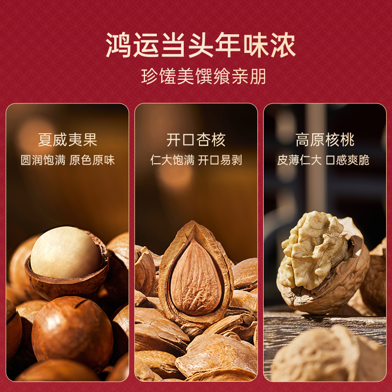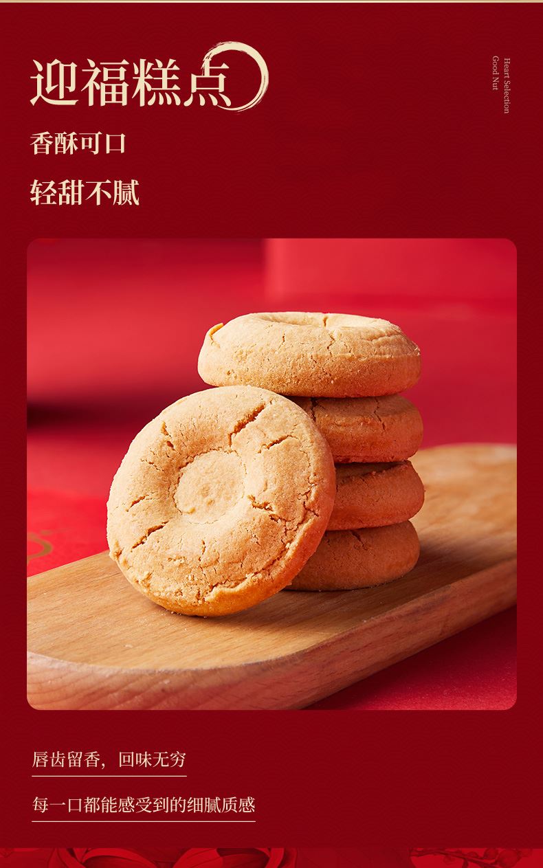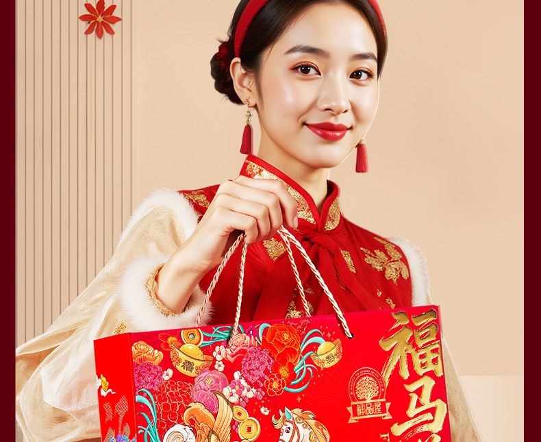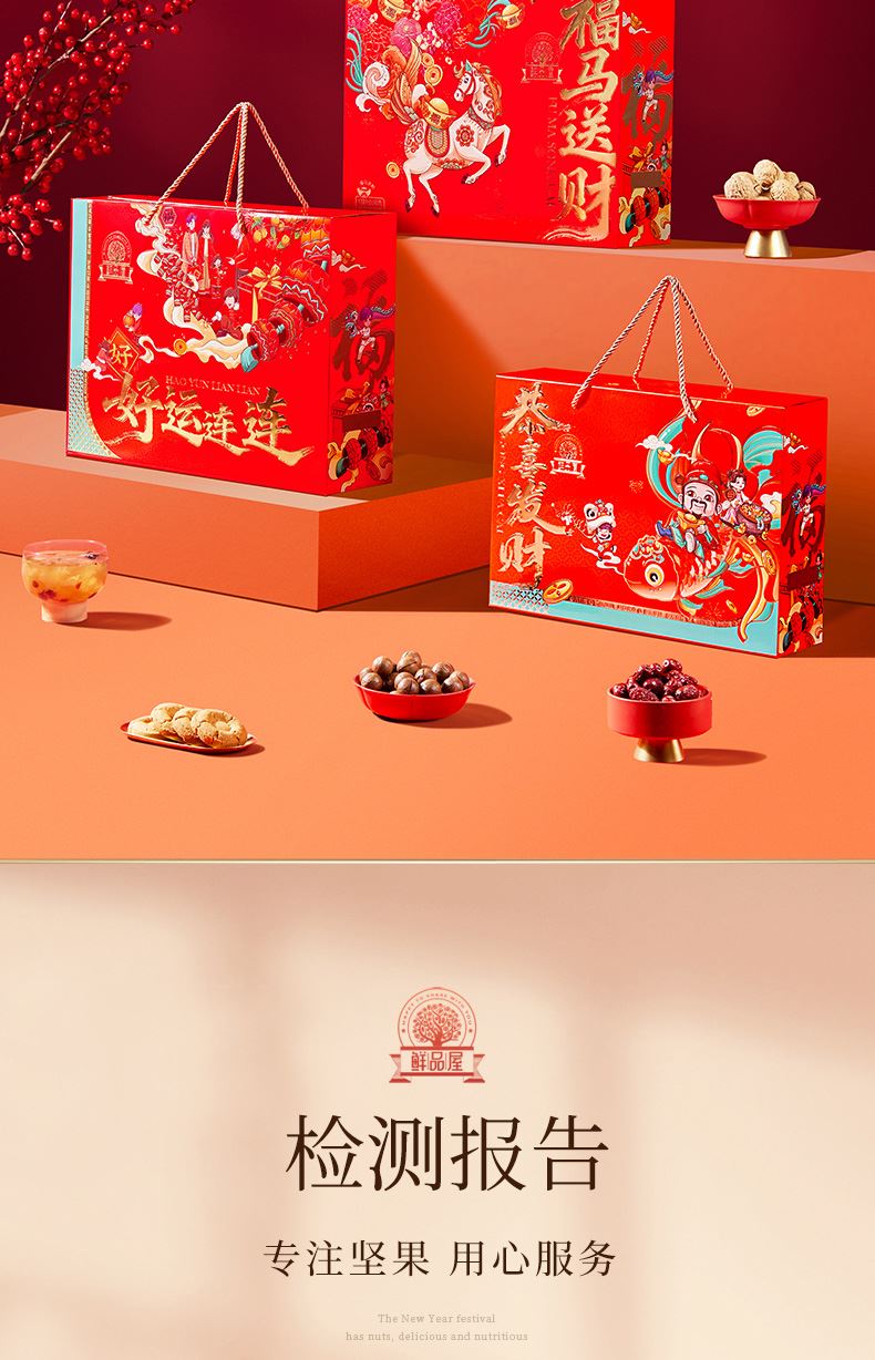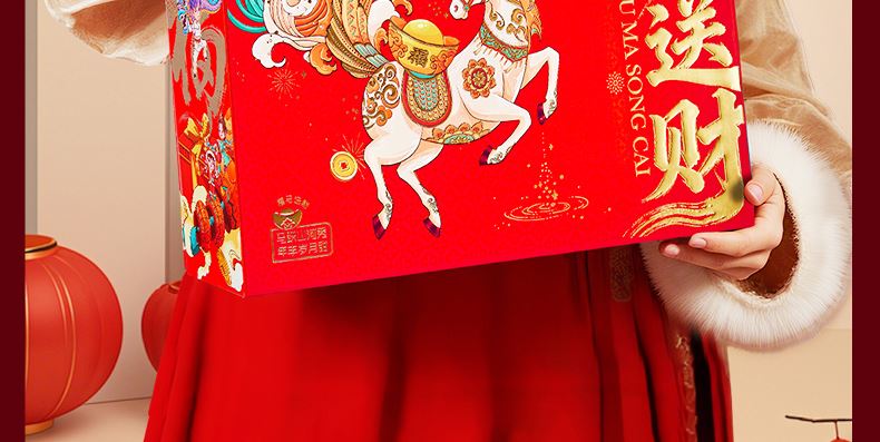 100g夏威夷果*1 100g手剥巴旦木*1 100g高原核桃*1 100g开口杏核*1 200g皇妃葡萄干*1 300g新疆灰枣*1 70g枣安一方(红枣糕)*4 22g迎福糕点*16 200g坚果红枣枸杞银耳羹*1 骏马驮繁花,锦绣满盒间,2026国潮生肖款礼盒,送礼自带好彩头,寓意马到成功; 净含量:1732g,内含9种美味,新年送礼,走亲访友,共享团圆喜悦,适合全渠道主推产品。