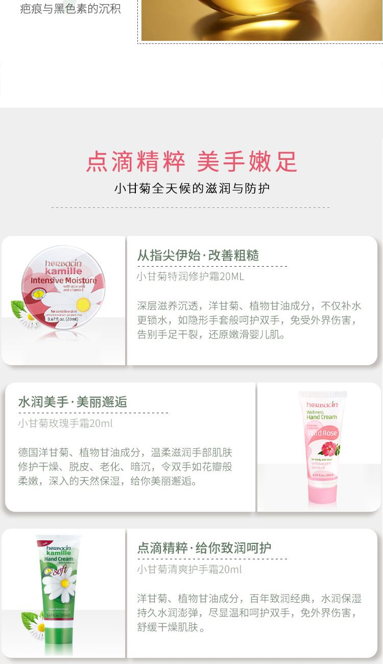 产地:德国 规格:玫瑰护手霜20ml、经典护手霜20ml 特润护手霜20ml、清爽护手霜20ml 功效:滋润手足、抚平粗糙、轻盈舒缓、补水防护、打造细化水嫩肌肤 保质期:4年 适合肤质:所有肌肤 礼盒尺寸:19*13.5*4 cm 条形码: 4013718083650