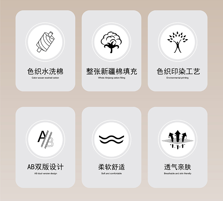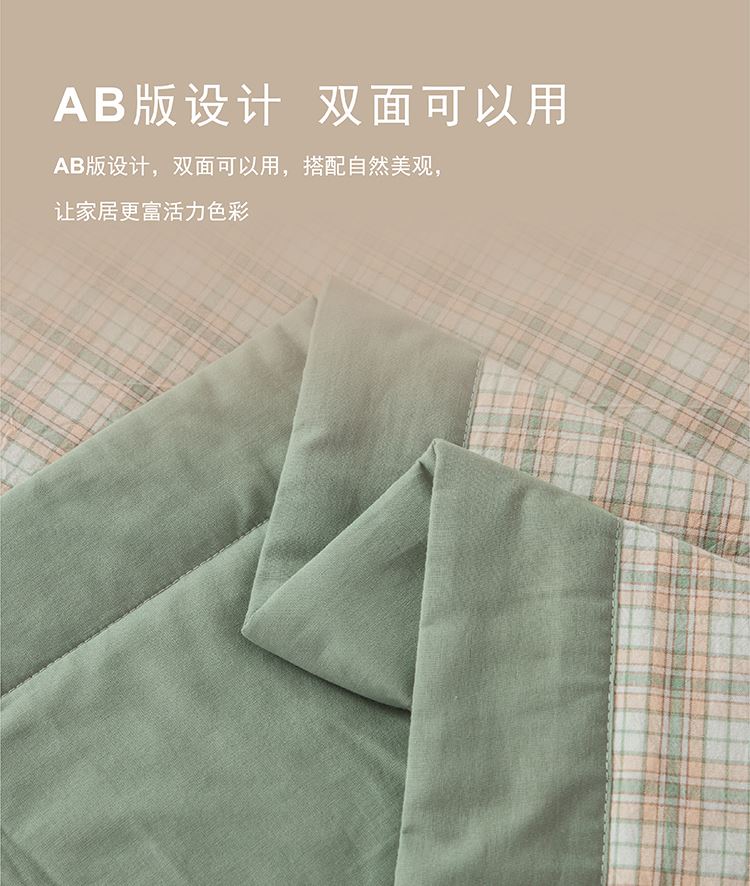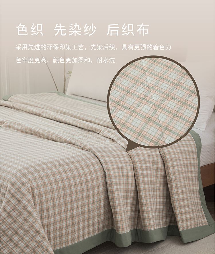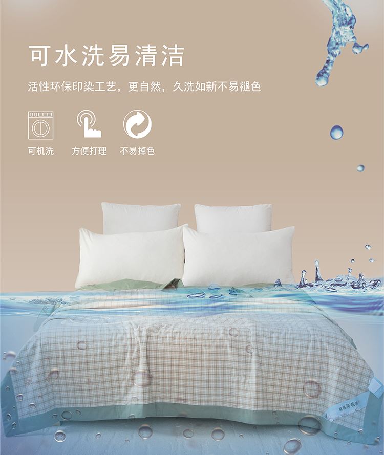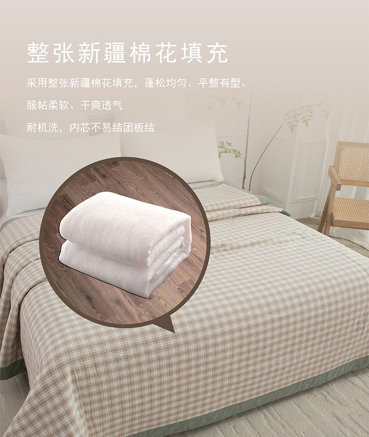 尺寸:150x200cm 被重:1000g 【面 料】全棉色织 【填充物】新疆棉 产品特点: 1.精选全棉水洗色织面料,亲肤舒适,吸湿透气; 2.甄选优质新疆棉花填充物,环保,贴身舒适,促进睡眠; 3.AB版设计,双面可以用,搭配美观,让家居更富活力色彩; 4.可水洗,易清洁,好打理。