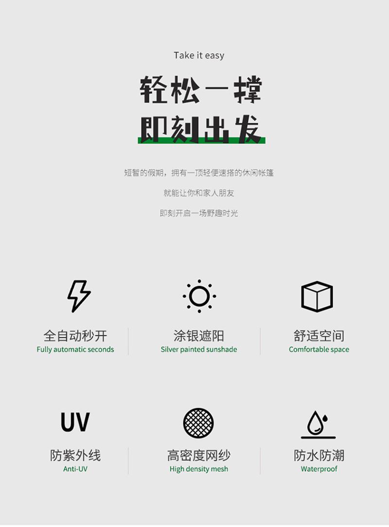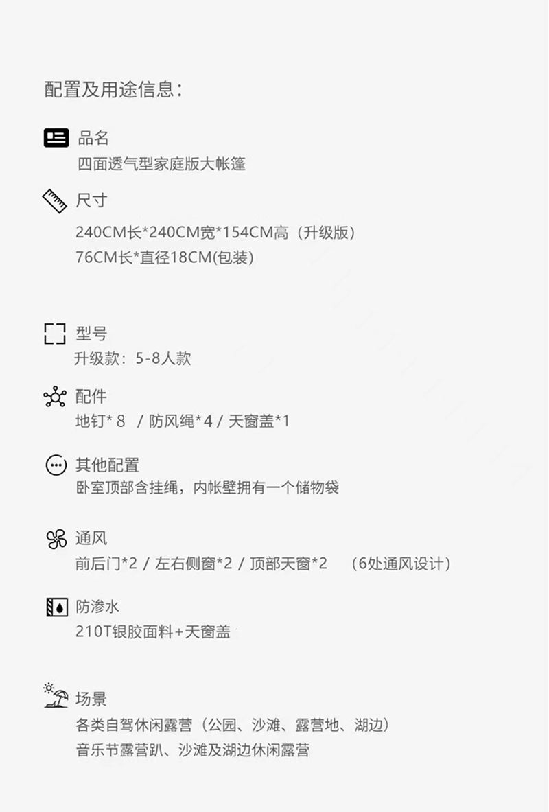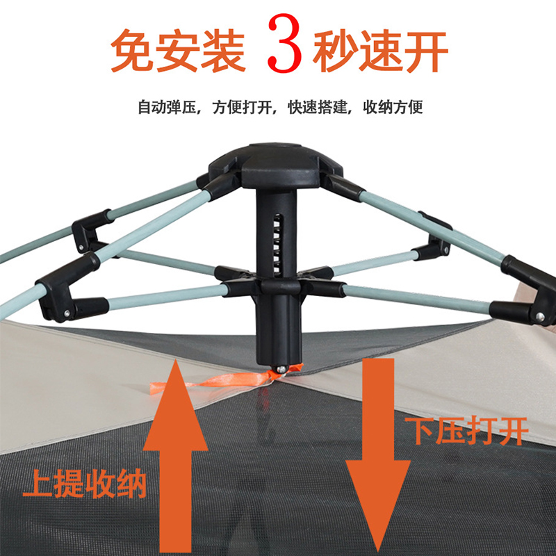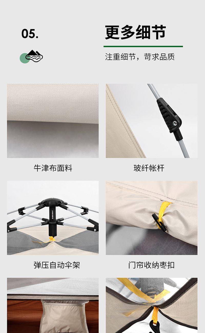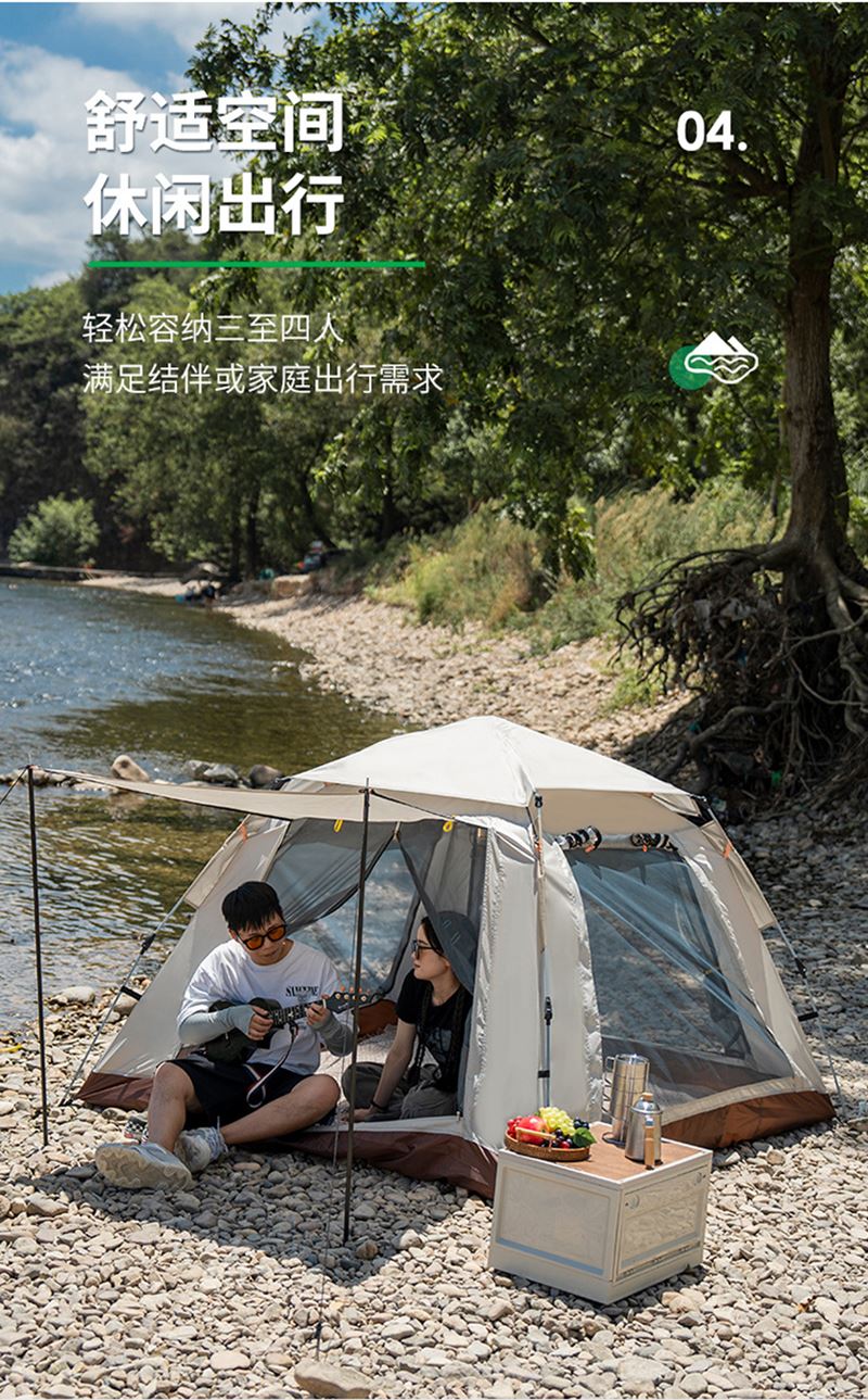 材质:防渗水210T银胶面料+天窗盖 帐篷尺寸:240*240*154cm 防潮垫尺寸:200*200cm 颜色:米色 净重:4.7kg 1、全自动速开,加大门厅款加大空间; 2、四面透气,带网纱,防蚊; 3、优质防水面料,防泼水防潮湿; 4、自动弹压,3秒速开; 5、大空间搭配防潮垫 ,满足家庭露营需求