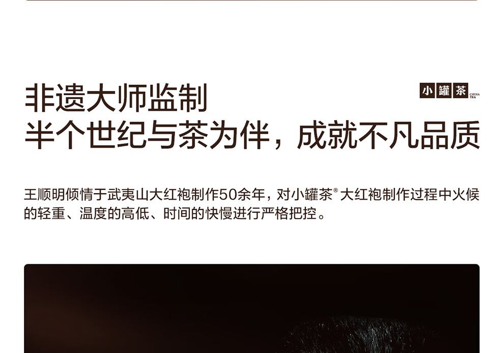 王顺明大师倾情于武夷山大红袍制作50余年对小罐茶"大红袍制作过程中火候的轻重、温度的高低、时间的快慢进行严格把控。