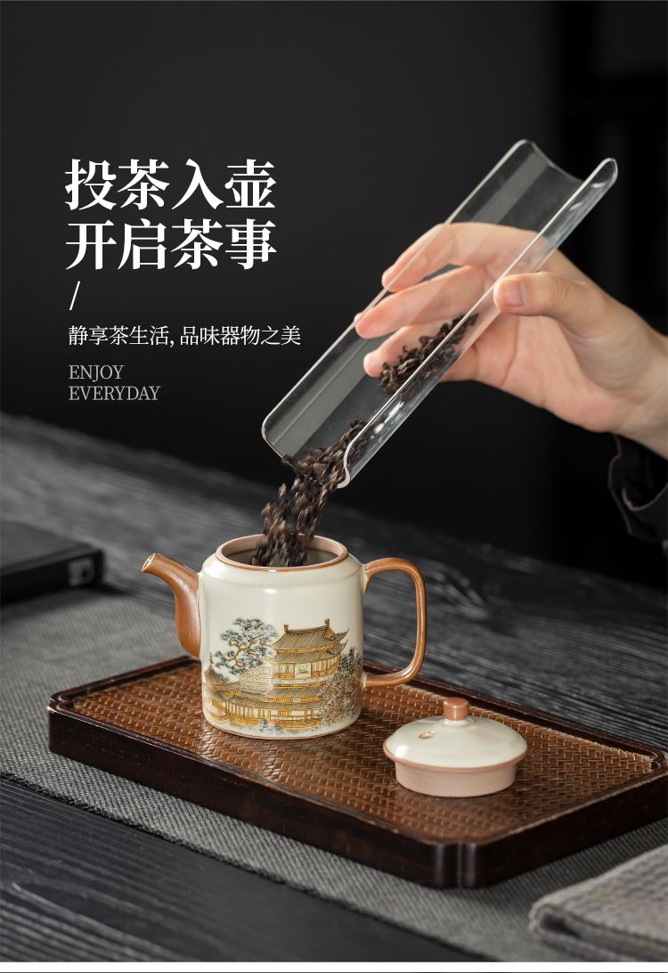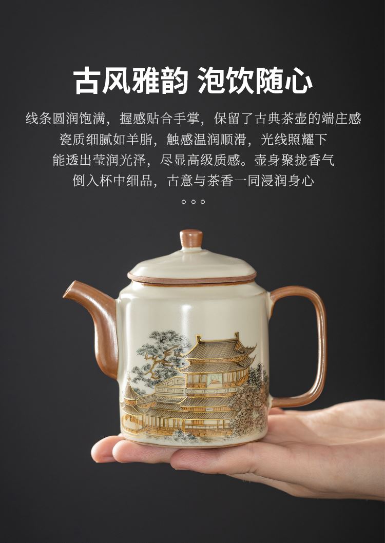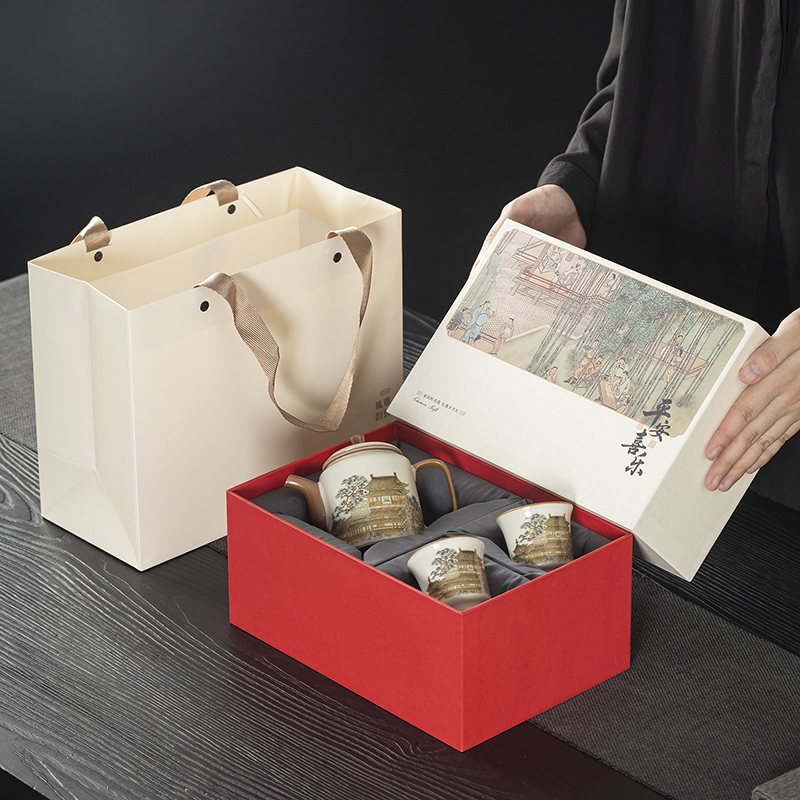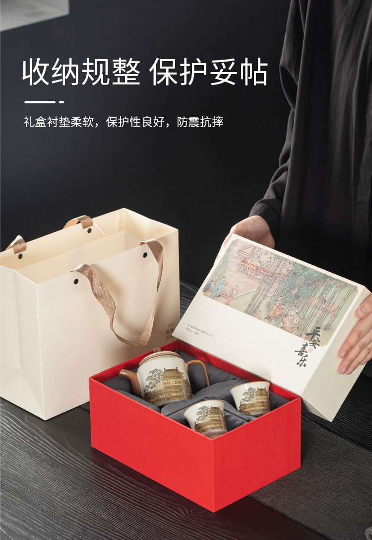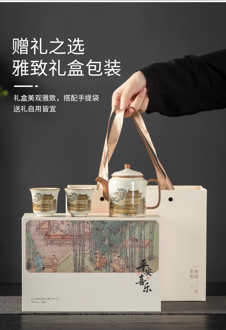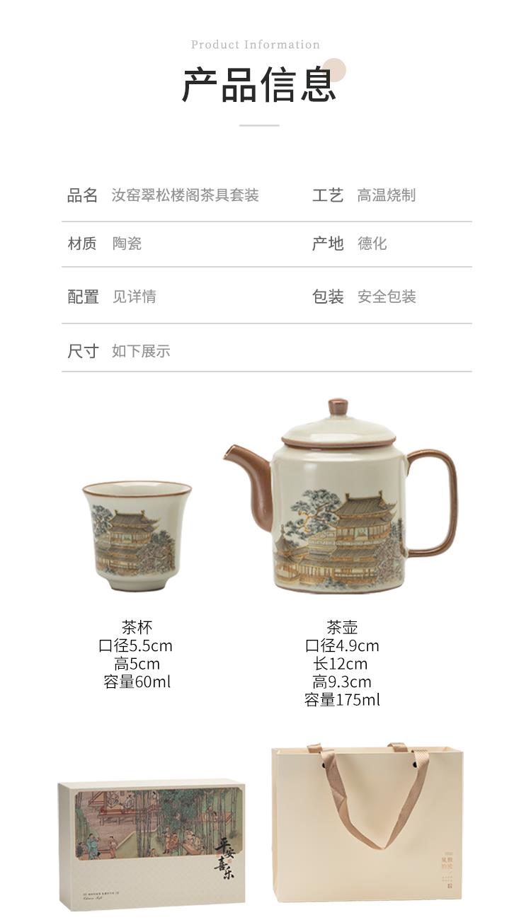配置:壶*1 客杯*2 礼盒*1 手提袋*1 材质:汝窑 礼盒尺寸:25cm*11cm*17cm 产品尺寸:壶 12cm*9.3cm容量175ml 客杯:5.5cm*5cm容量 60ml