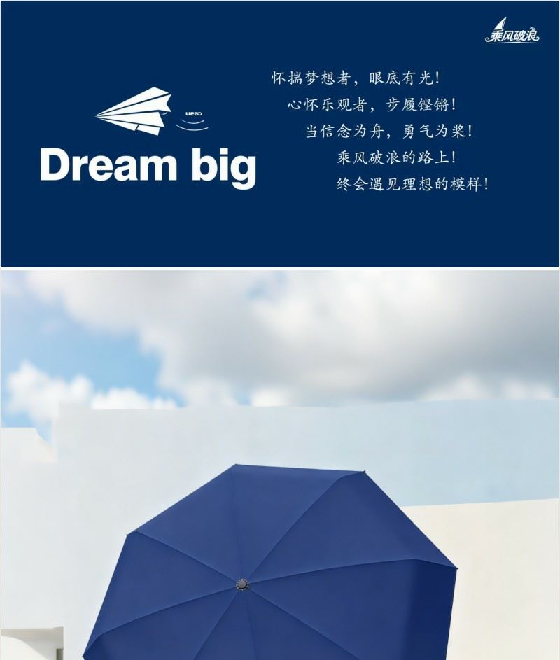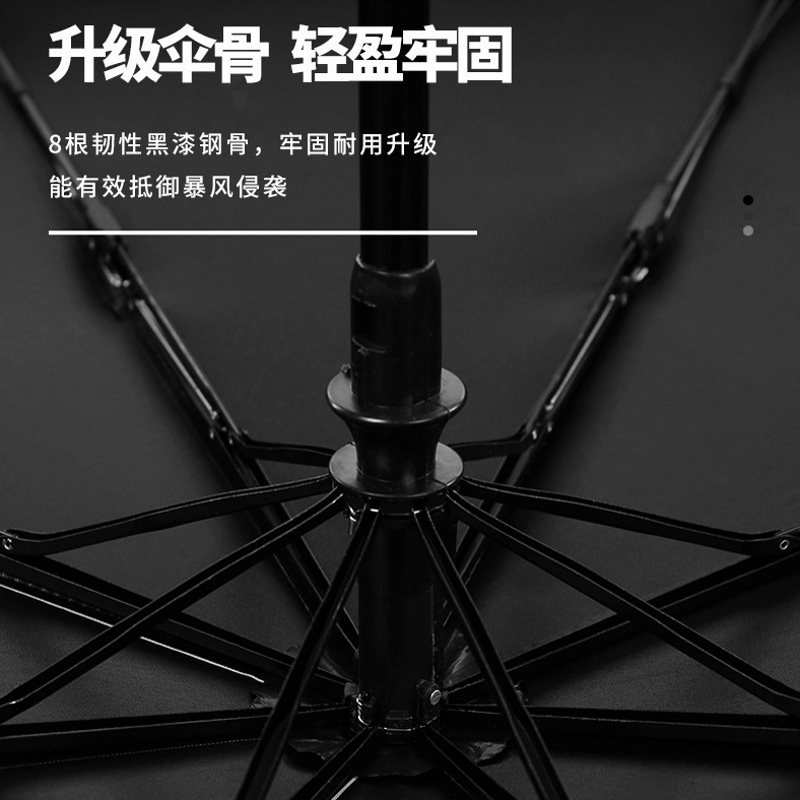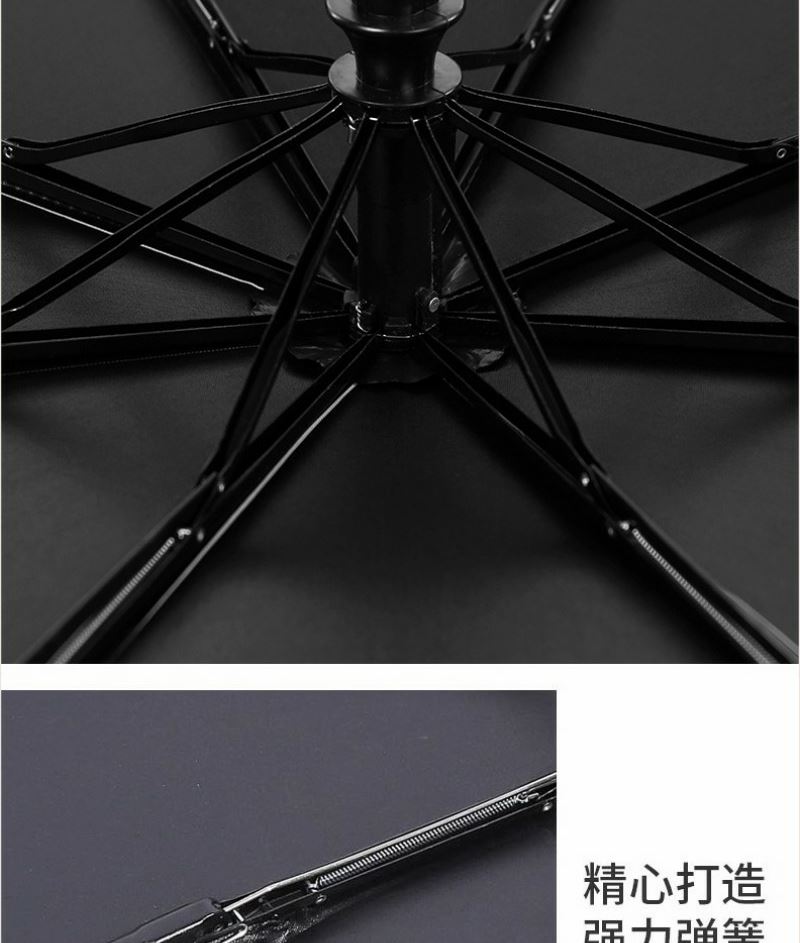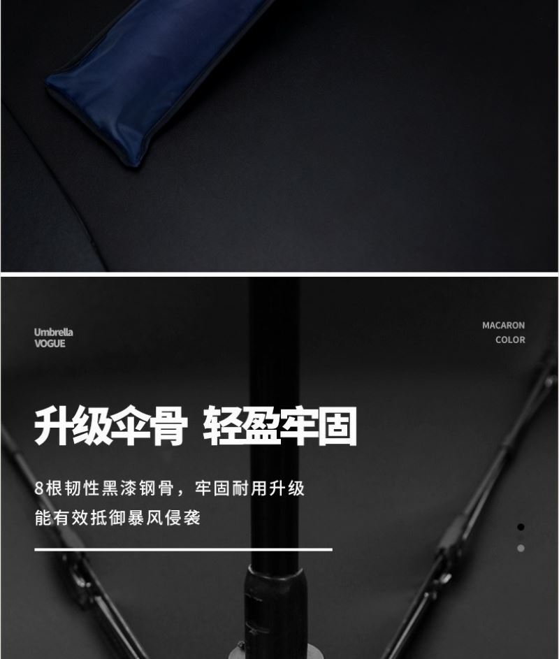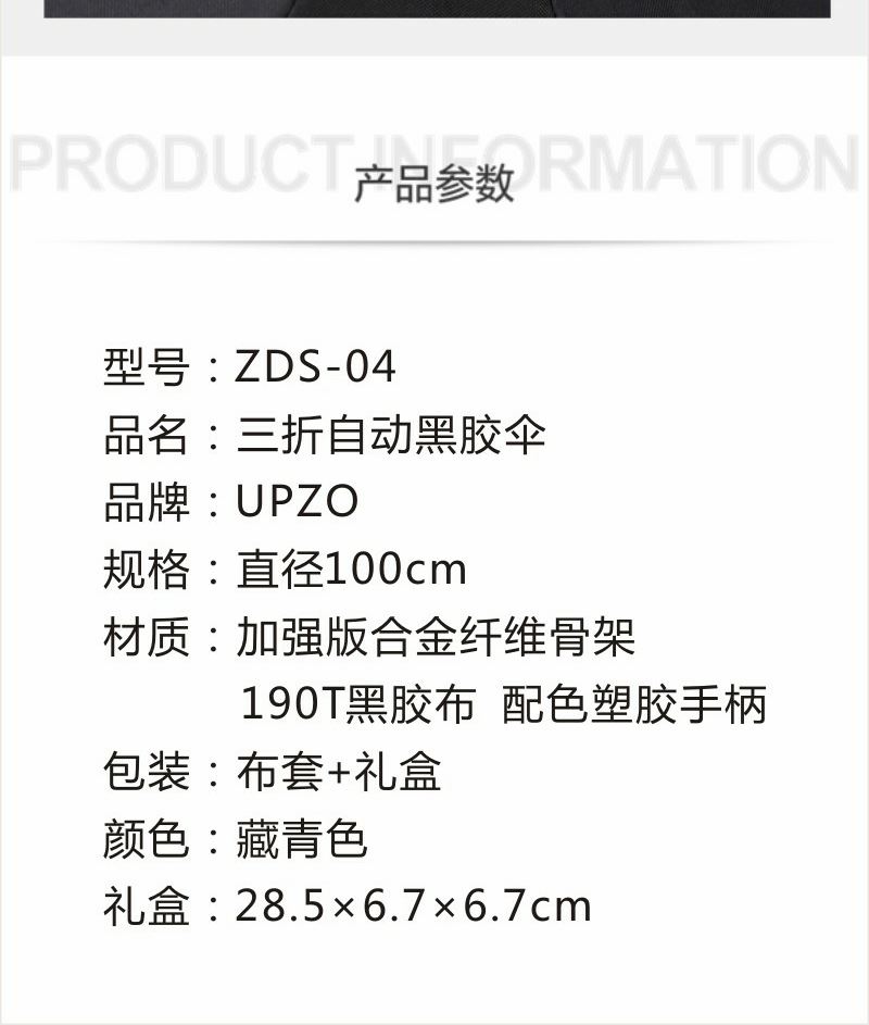 规格:直径100CM 伞架:加强版合金纤维骨架 面料:190T黑胶布 手柄:配色塑胶手柄 包装:布套+礼盒 颜色:藏青色 礼盒:28.5×6.7×6.7cm