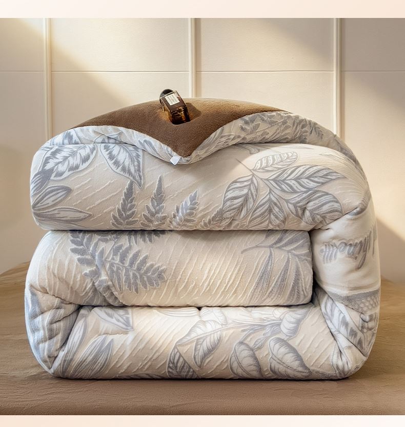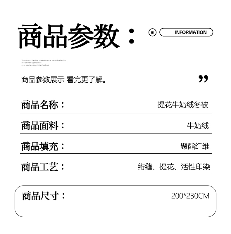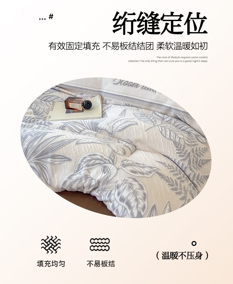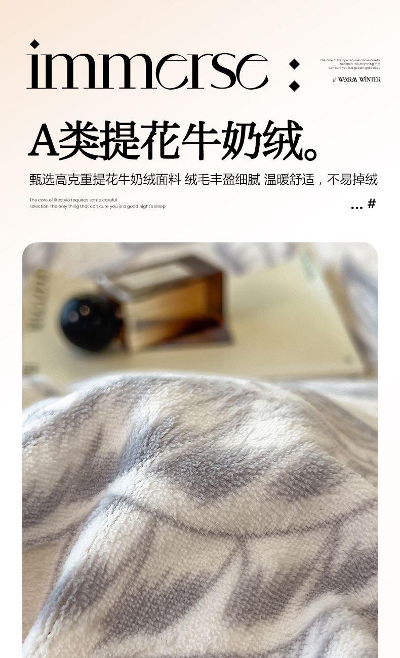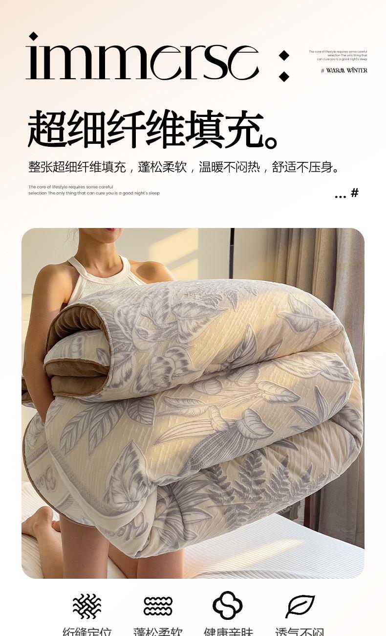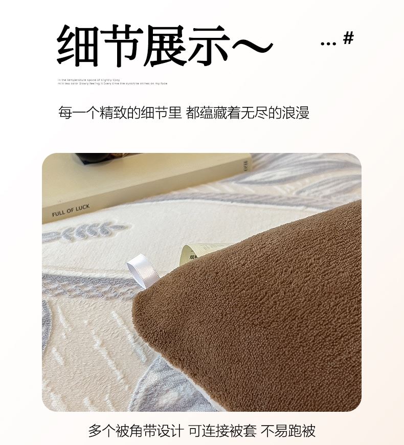 面料:牛奶绒(聚酯纤维) 填充:聚酯纤维 规格:200cm*230cm 总重量:3800g 包装:精美软包 甄选高克重提花牛奶绒面料,绒毛丰盈细腻 温暖舒适,不易掉绒,冬日无静电困扰。面料中织入导电丝纤维。告别冬日噼里啪啦困扰,温暖舒适保温。