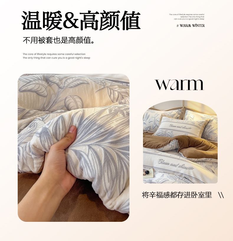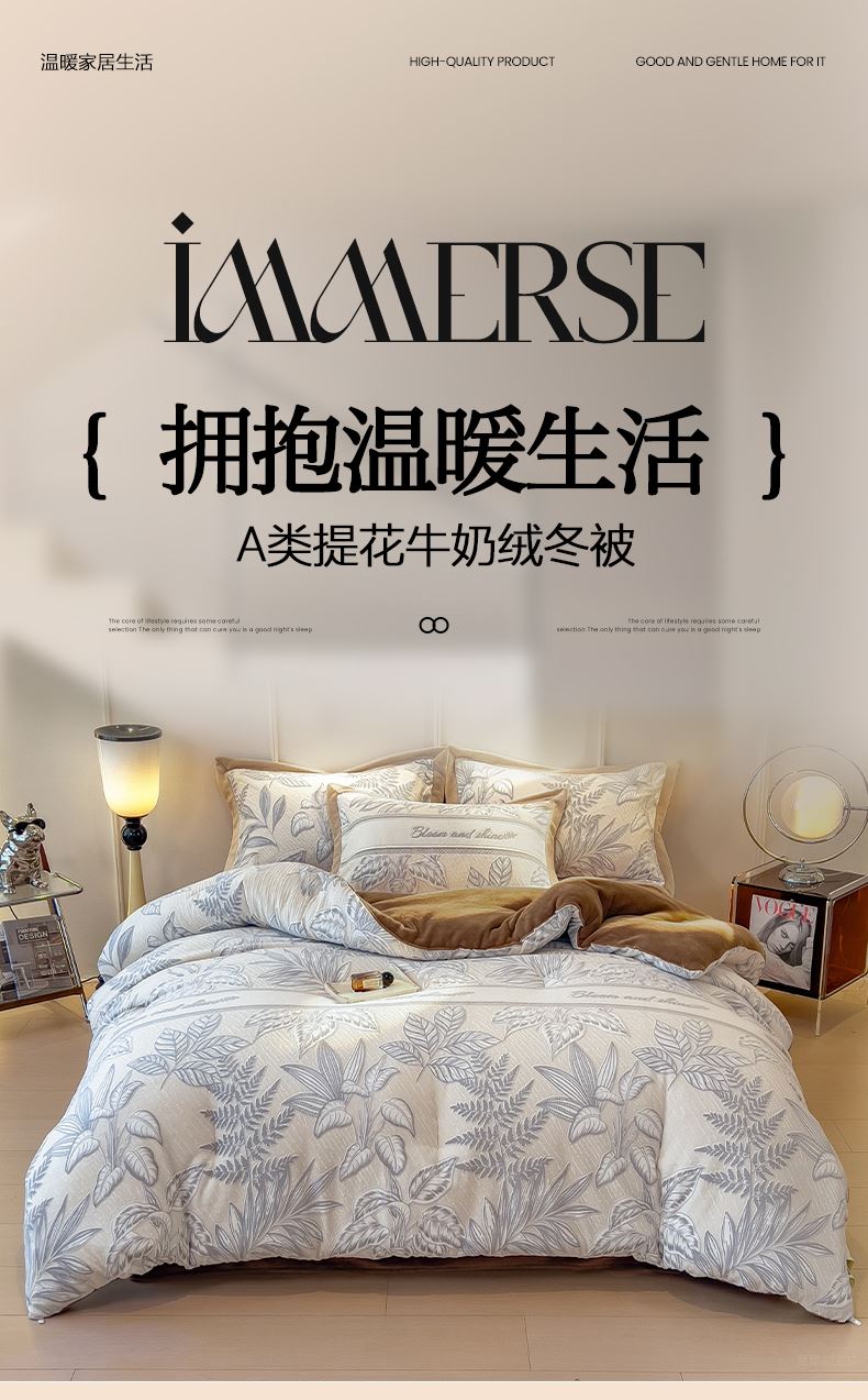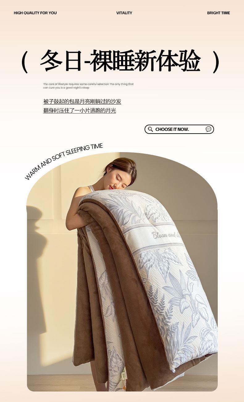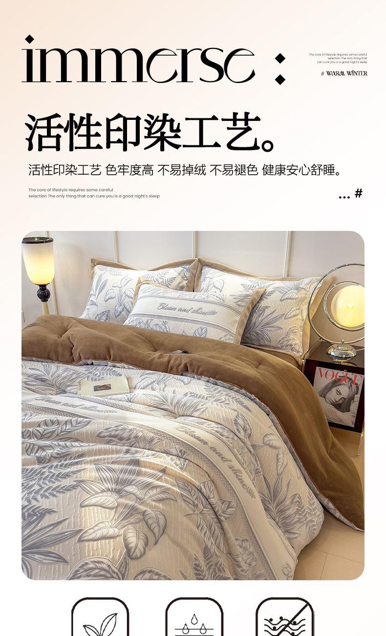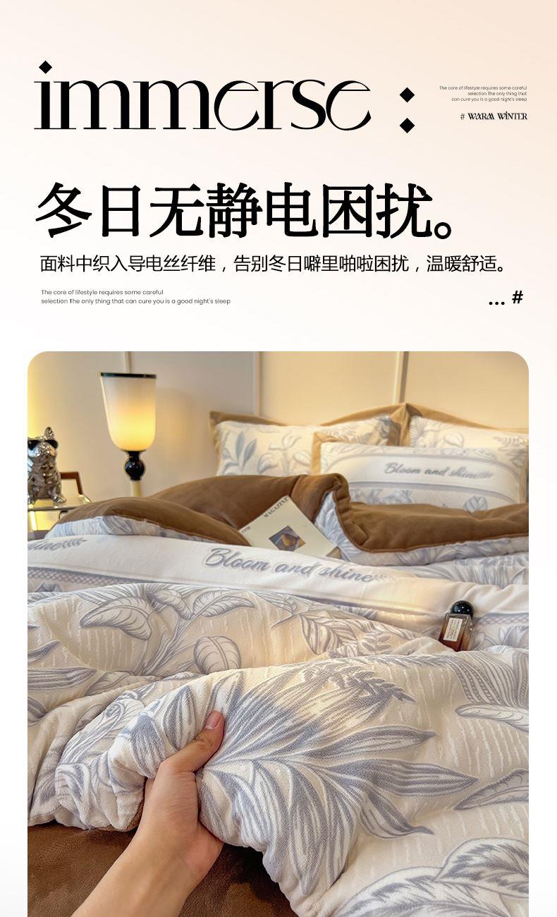 面料:牛奶绒(聚酯纤维) 填充:聚酯纤维 规格:200cm*230cm 总重量:3800g 包装:精美软包 甄选高克重提花牛奶绒面料,绒毛丰盈细腻 温暖舒适,不易掉绒,冬日无静电困扰。面料中织入导电丝纤维。告别冬日噼里啪啦困扰,温暖舒适保温。
