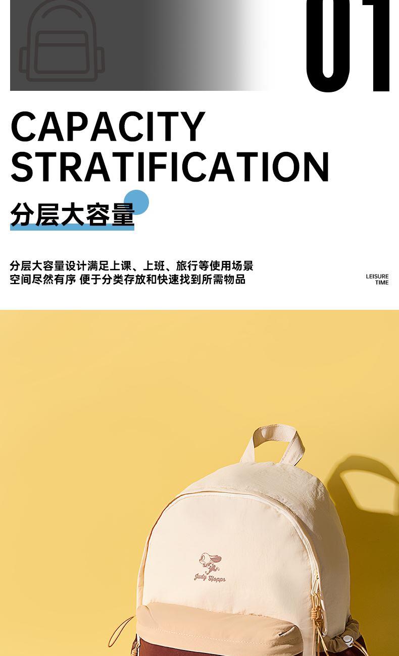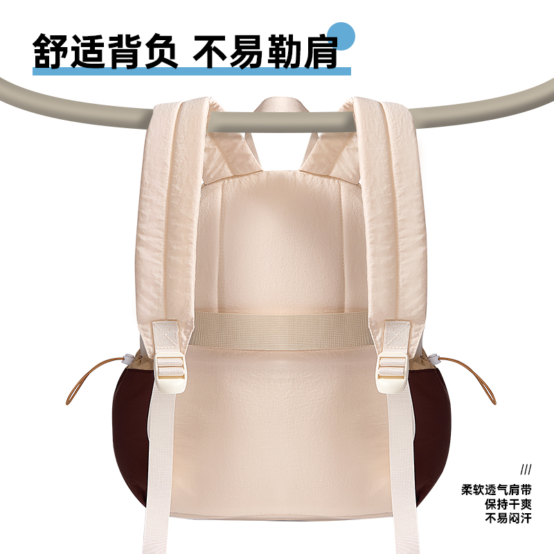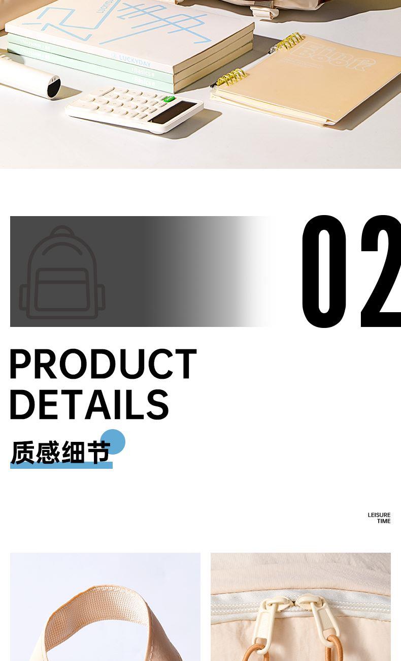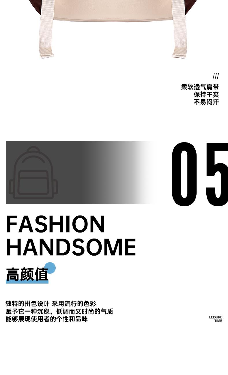 材质:聚酯纤维 尺寸:30*16*40CM 建议身高:135-175cm 卖点: ①分层大容量设计满足上课、上班、旅行等使用场景空间尽然有序 便于分类存放和快速找到所需物品 ②柔软面料,隐藏背袋;柔软的触感设计独具时尚感,适配多种穿搭风格 ③舒适背负,不勒肩,宽厚肩带符合人体工程学设计贴合人体、均匀卸力、舒适柔软不勒肩脖 ④独特的拼色设计 采用流行的色彩赋予它一种沉稳、低调而又时尚的气质能够展现使用者的个性和品味